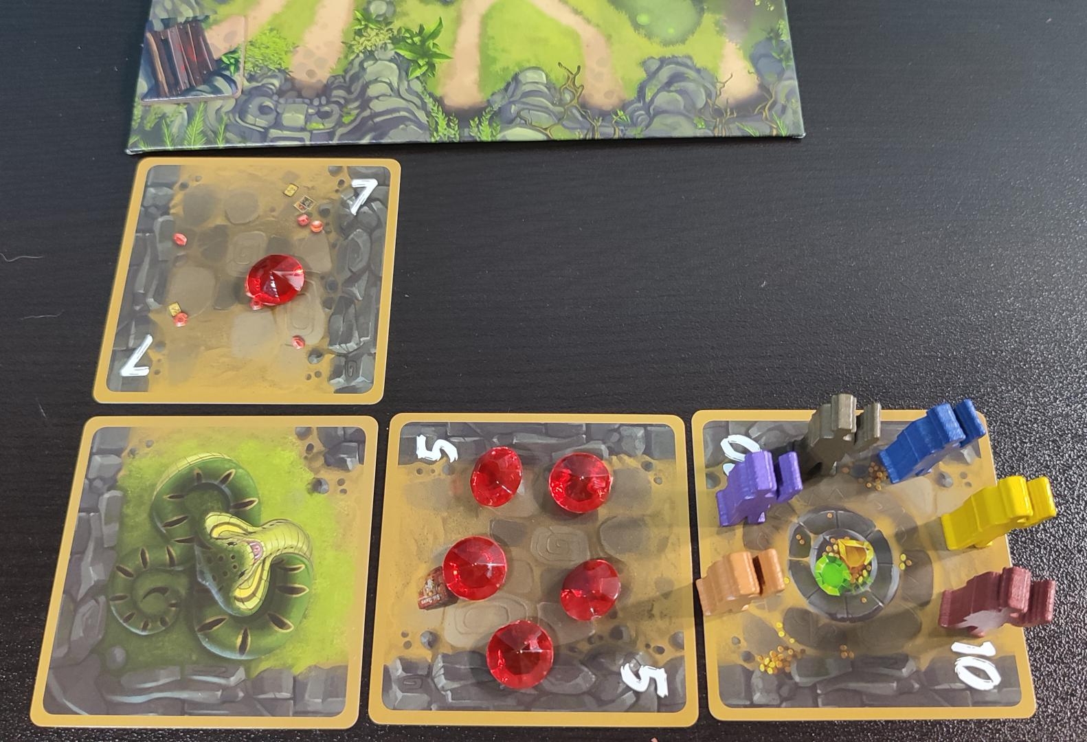 - Carta de tesoro: Se cogen tantos rubís de la reserva como número indicado en la carta y se reparten de forma proporcional a todos los jugadores que permanezcan en la cueva (al ser la primera carta, serán todos) y se dejan sobre la carta los rubís sobrantes. Los rubís que van consiguiendo los jugadores deben permanecer en su reserva personal, pero no guardarlos aún en su baúl.