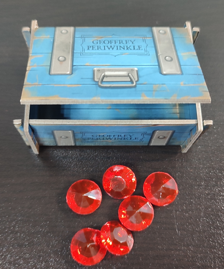 Si la carta contiene tesoros, es decir rubís, también indicará cuántos hay y los jugadores se los repartirán de forma equitativa y los dejarán en su zona de juego, pero no dentro del cofre, matiz muy importante como luego veremos. Si sobrase alguno a la hora de repartirlos, estos se dejan en la propia carta.