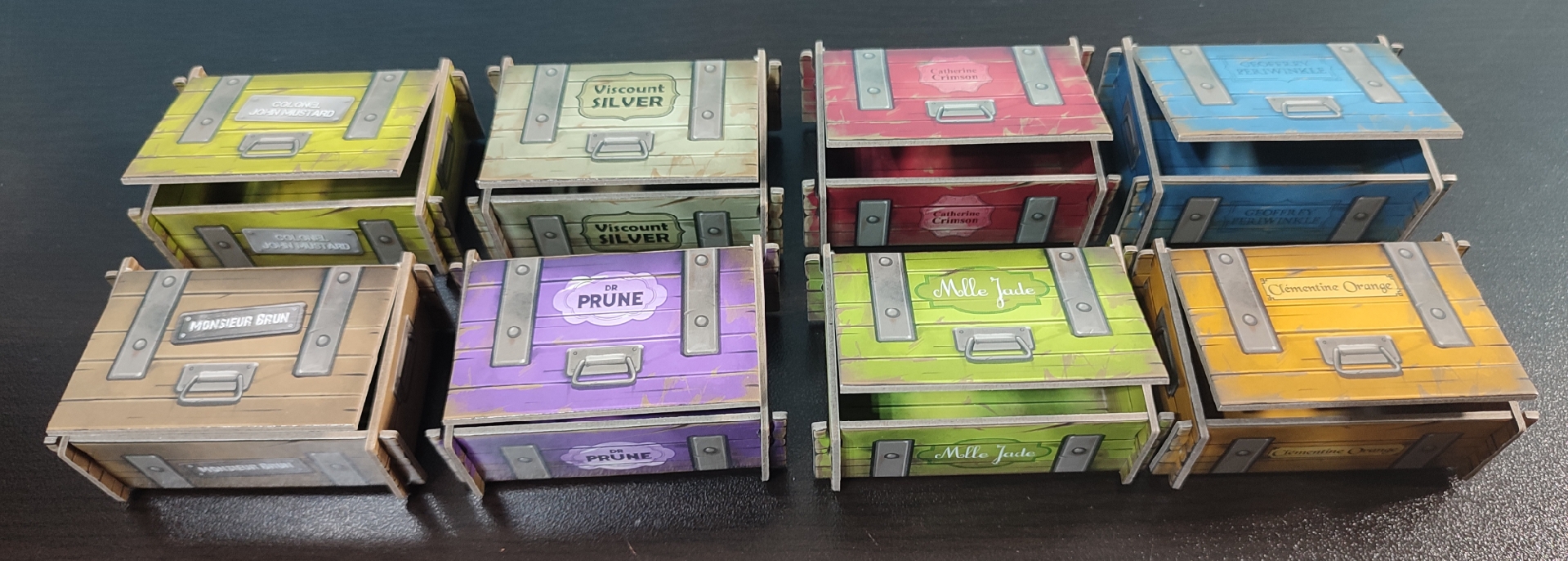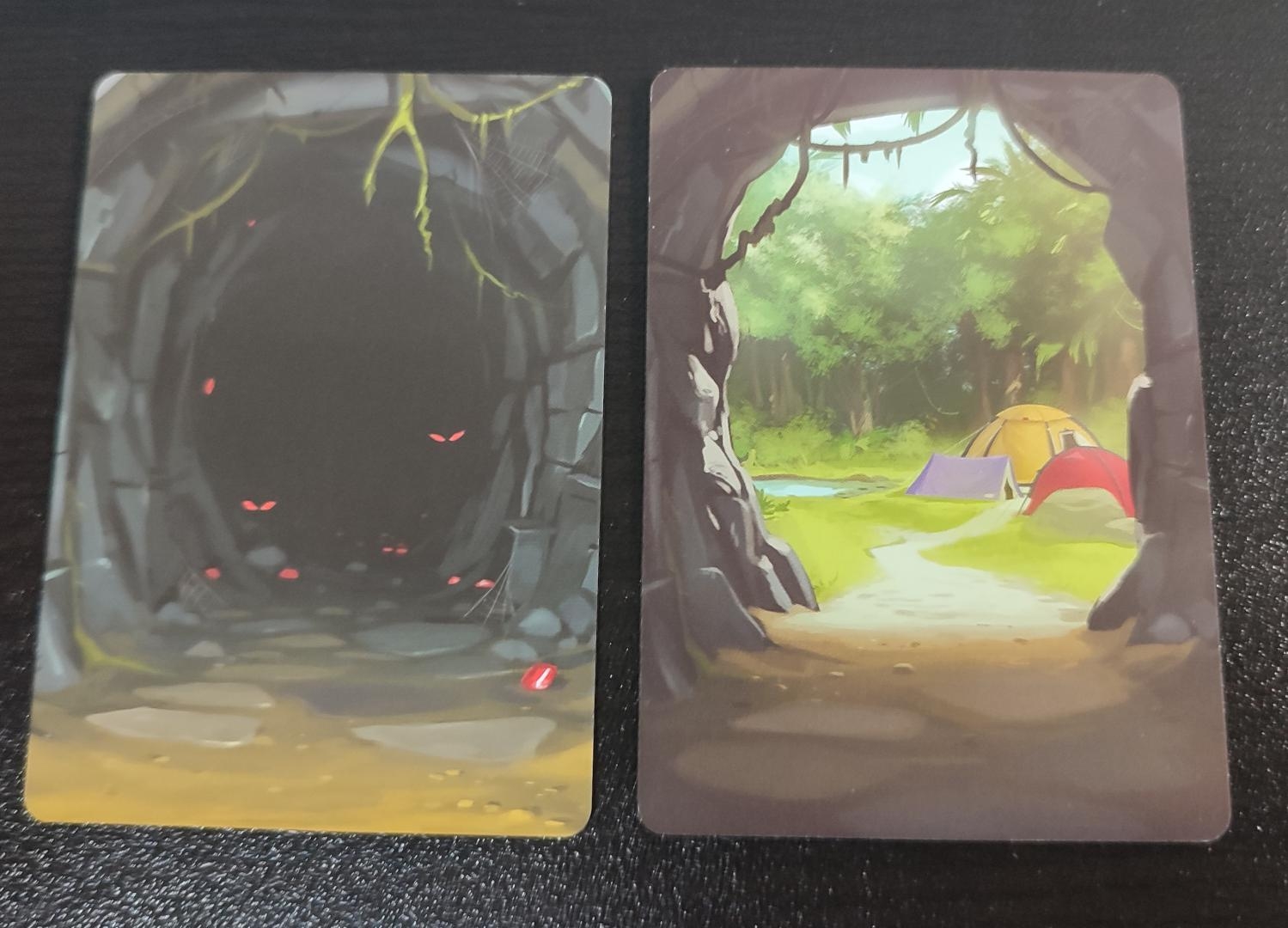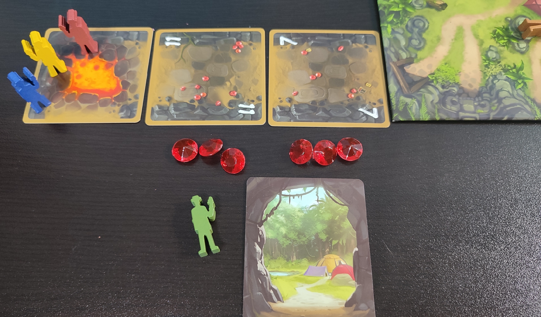 Al comienzo de la partida, cada jugador dispondrá de un meeple, un cofre para guardar sus tesoros y dos cartas de decisión. Una de ellas será utilizada para indicar que quiere continuar explorando la cueva y, la otra carta, indicará que no quiere arriesgarse más y quiere salir y volver al campamento.