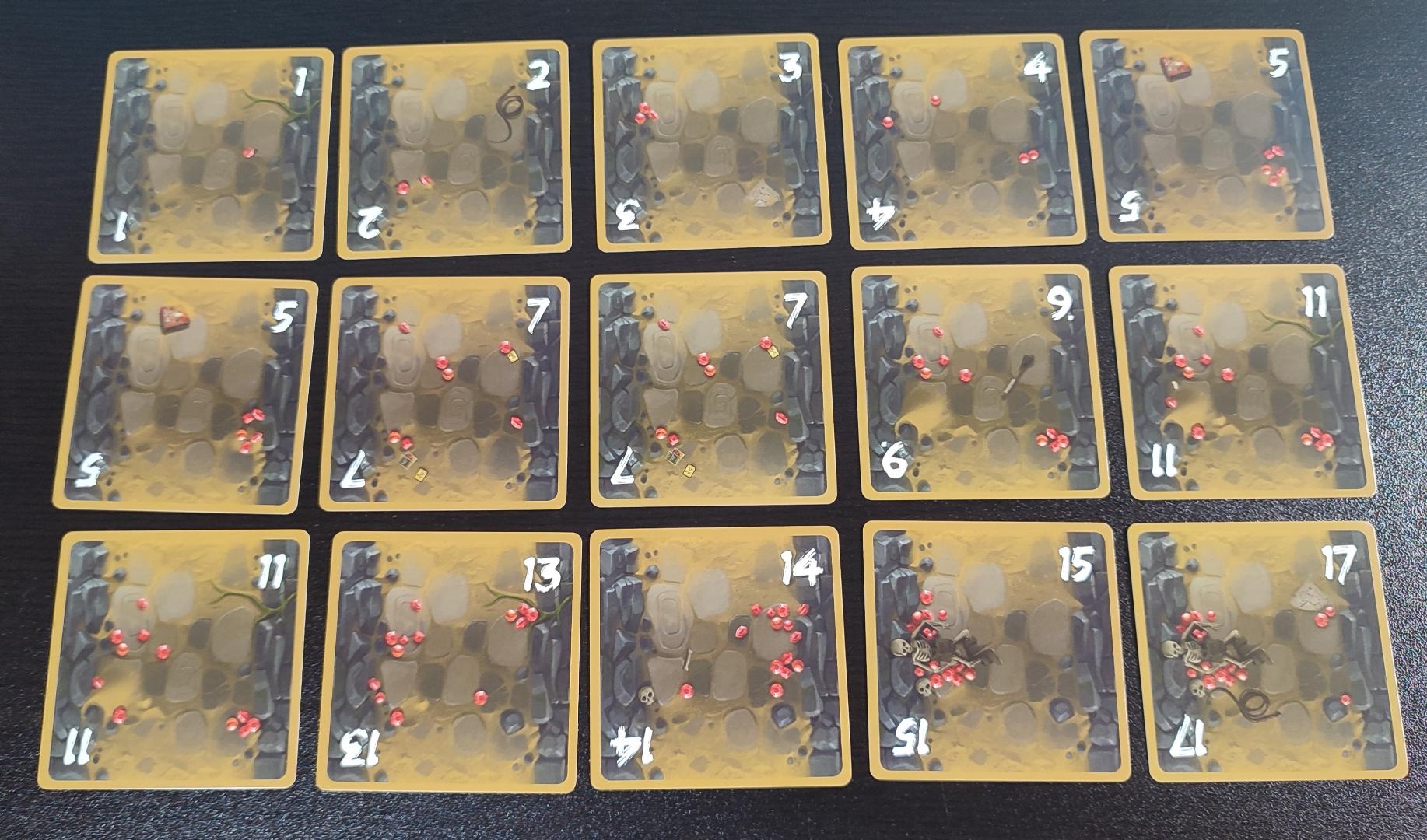 - Carta de reliquia: No pasa nada y la expedición puede continuar con normalidad. Estas cartas no tiene ningún valor hasta que un jugador salga de la cueva con ella.