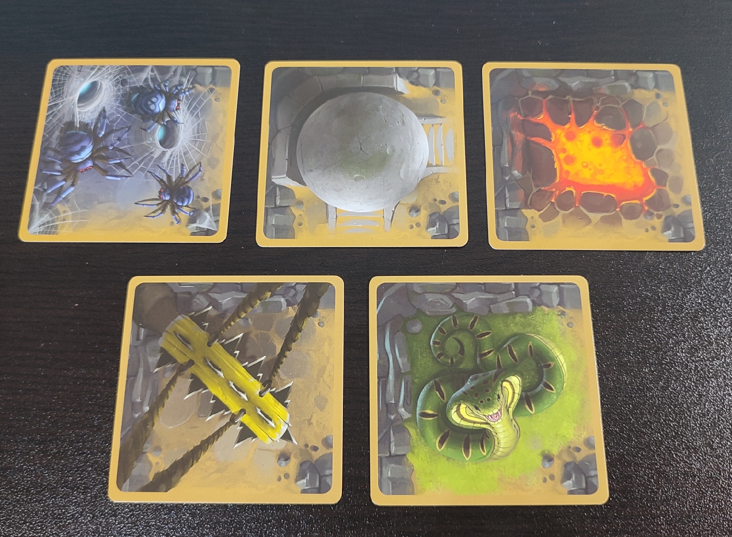 - Carta de trampa: Si es la primera vez que aparece ese tipo de trampa no pasa nada y la expedición puede continuar sin problemas. En el caso de que sea la segunda carta de un mismo tipo de trampa, la ronda acaba y todos los jugadores que aún estuvieran dentro de la cueva vuelven inmediatamente al campamento con las manos vacías, es decir, pierden todos los rubís que hayan podido conseguir durante esta ronda.