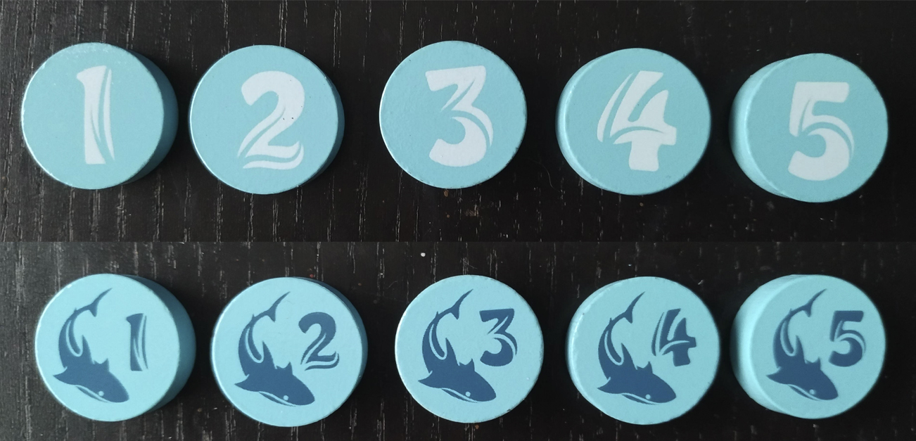 Las fichas de aire vienen numeradas del 1 al 5 que representan la velocidad de inmersión teniendo una cara sin tiburones y otra con uno.