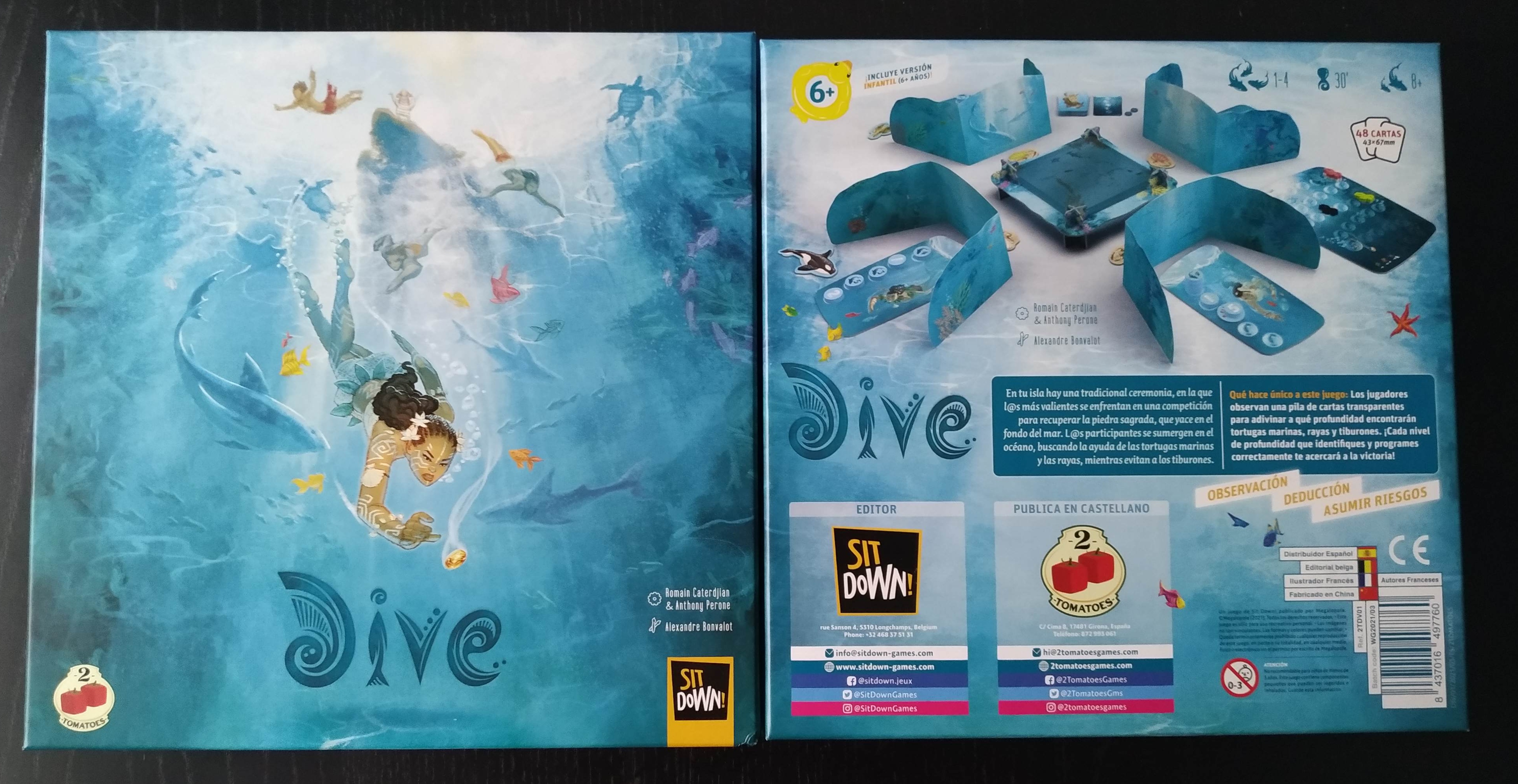 Así se nos presenta Dive, éste juego de océanos creado por Romain Caterdjian y Anthony Perone, que ilustra Alexandre Bonvalot y nos trae a España la editorial 2tomatoes en 2021.