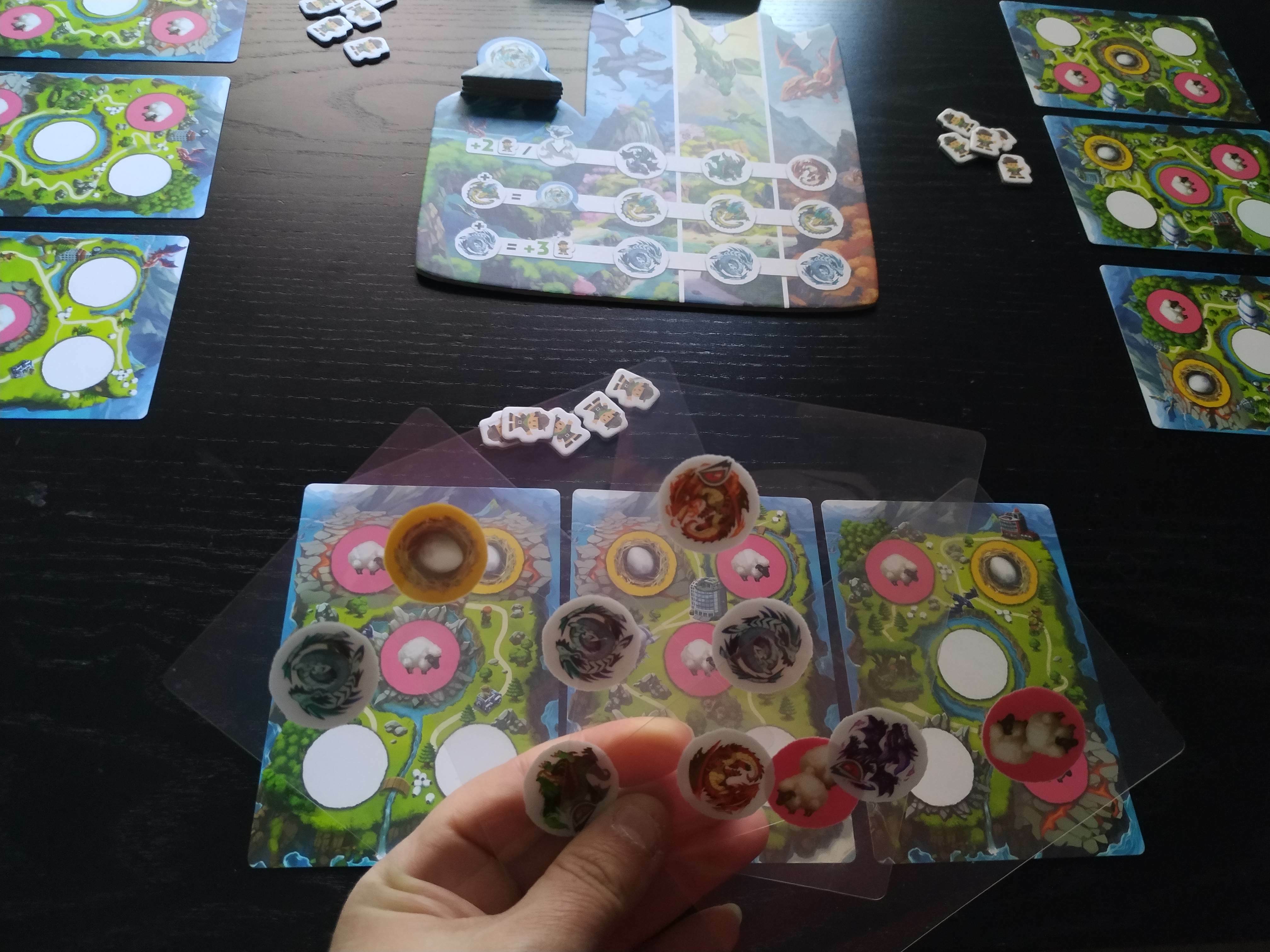 La carta elegida de cada turno debemos colocarla en alguna de las tres islas de forma estratégica teniendo en cuenta todos los factores que hacen mejorar nuestros parques y atraer a más visitantes. Primero, por un lado, debemos considerar la posibilidad de que alguno de los dragones de la carta que coloquemos tape un huevo, ya que esta combinación provocaría un nacimiento y, por tanto, obtendríamos dos turistas más. Por el otro lado, debemos tener cuidado de no tapar con ningún elemento ningún dragón furioso ya que le cabrearíamos tanto que perderíamos a uno de los visitantes.