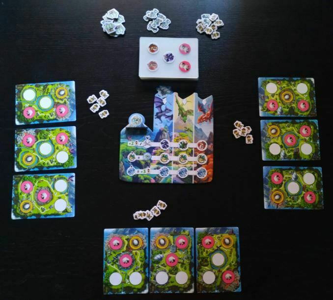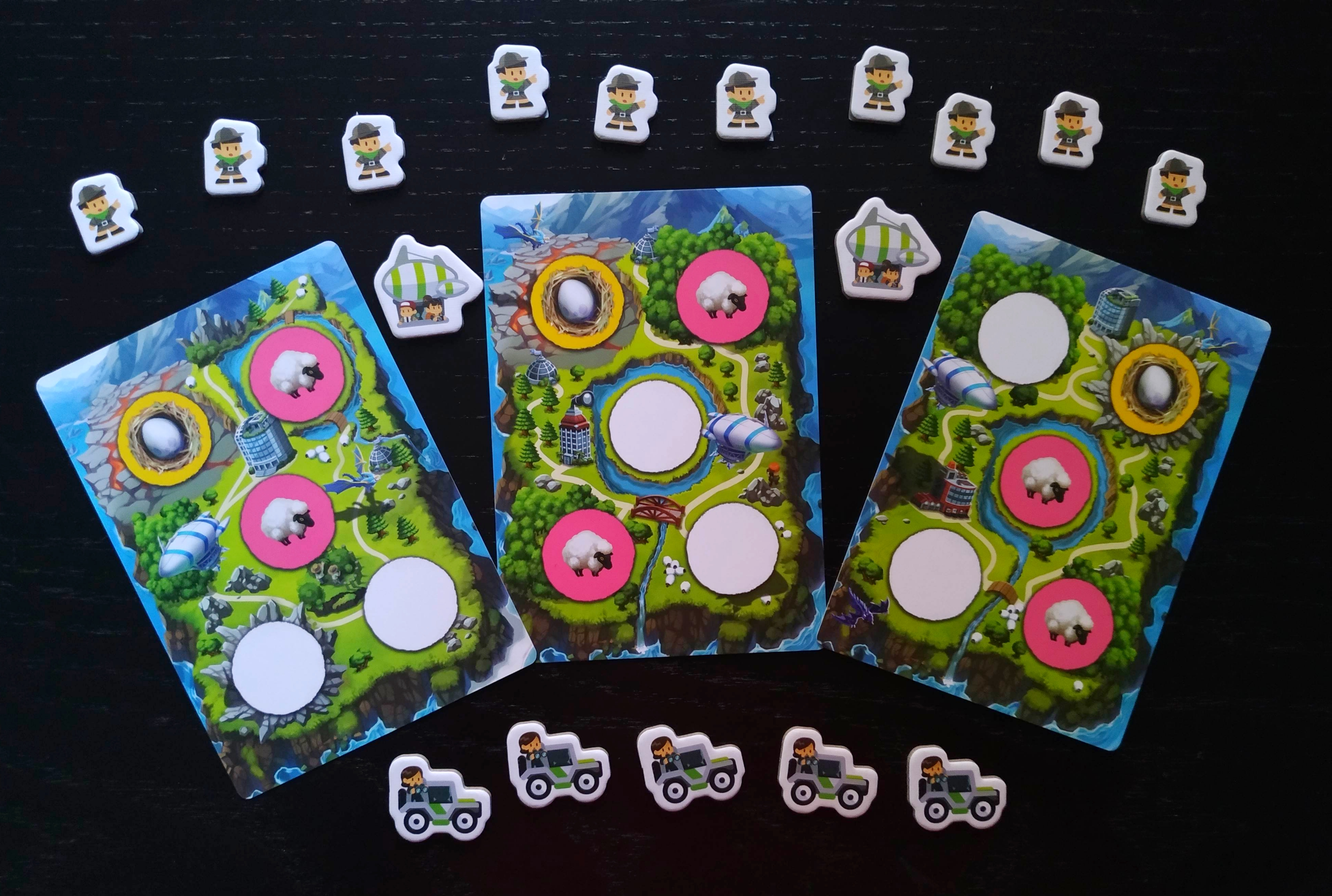 La situación de partida de cada jugador es similar con 5 visitantes y 3 islas en las que contamos con un huevo y un par de ovejas en cada una de ellas. A partir de ahí, la evolución de las islas irá variando de un jugador a otro en función de las cartas que vayan escogiendo en cada temporada. Cada temporada comienza de la misma forma, con el reparto de 4 cartas a cada jugador. La mecánica es sencilla y se trata de que cada uno debe elegir una y pasar el resto al jugador de su izquierda, recibiendo las que le queden al jugador de su derecha hasta que ya no queden más cartas en la mano que pasar.