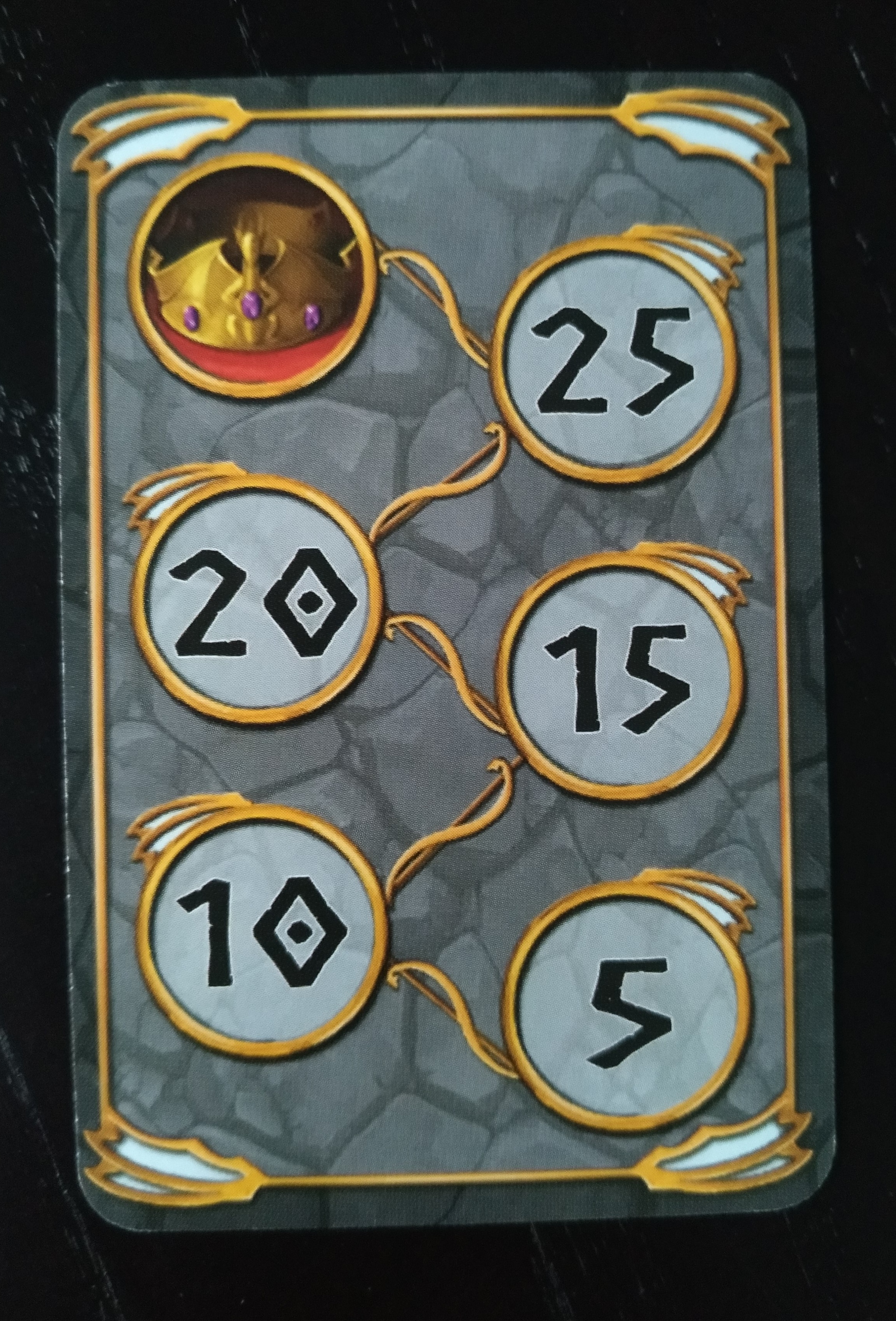 Nos sirven para llevar la cuenta de cuántas coronas tenemos y las iremos marcando poner sobre la carta contador, que está dividida de 5 en 5. Cada corona de oro equivale a dos de plata.