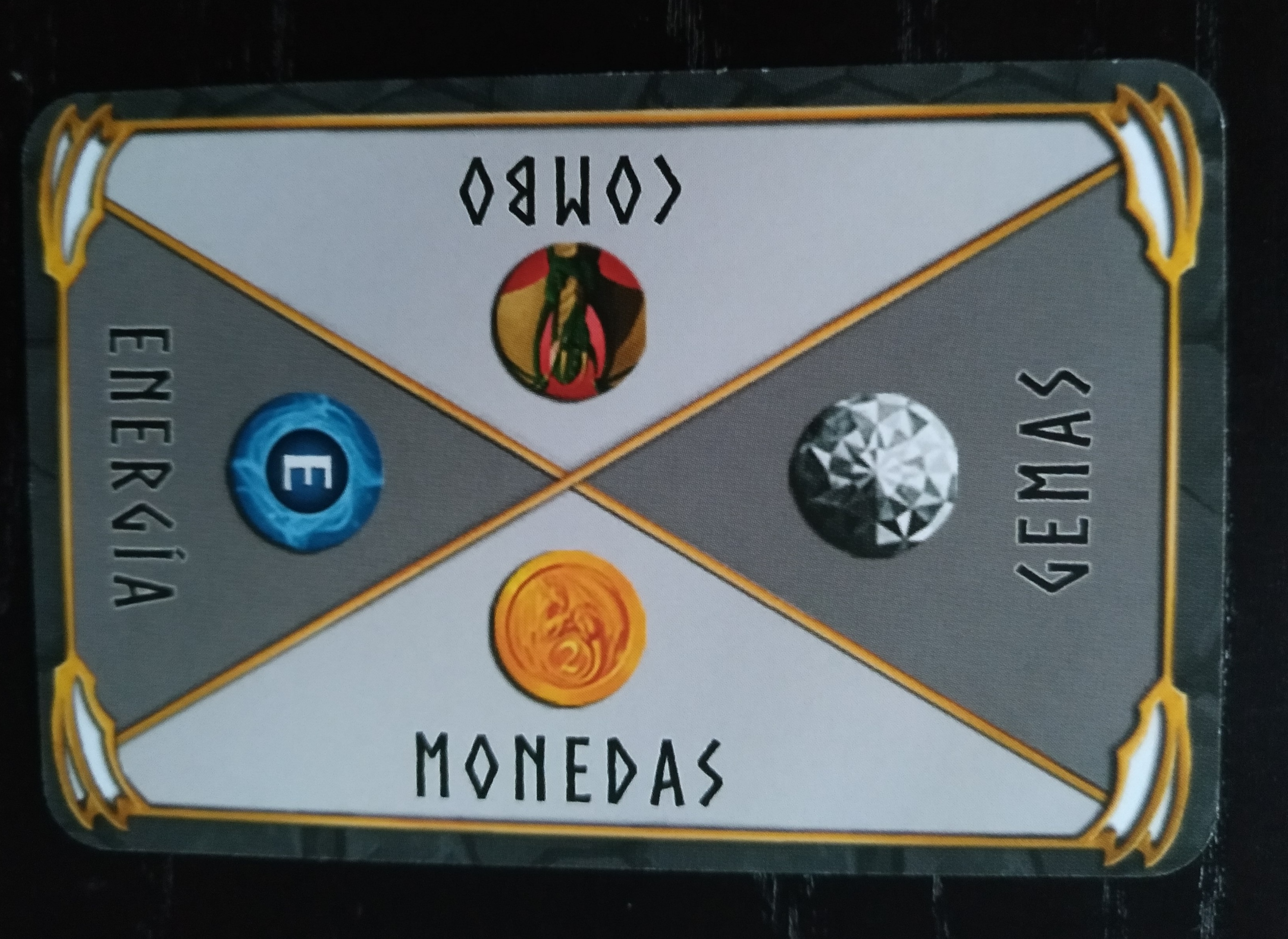 Aquí cada jugador intentará ser el vencedor de cada tipo de juego, que viene indicado en la carta del centro de la mesa: gemas, energía, monedas y combo. Apostaremos coronas en cada uno de ellos.