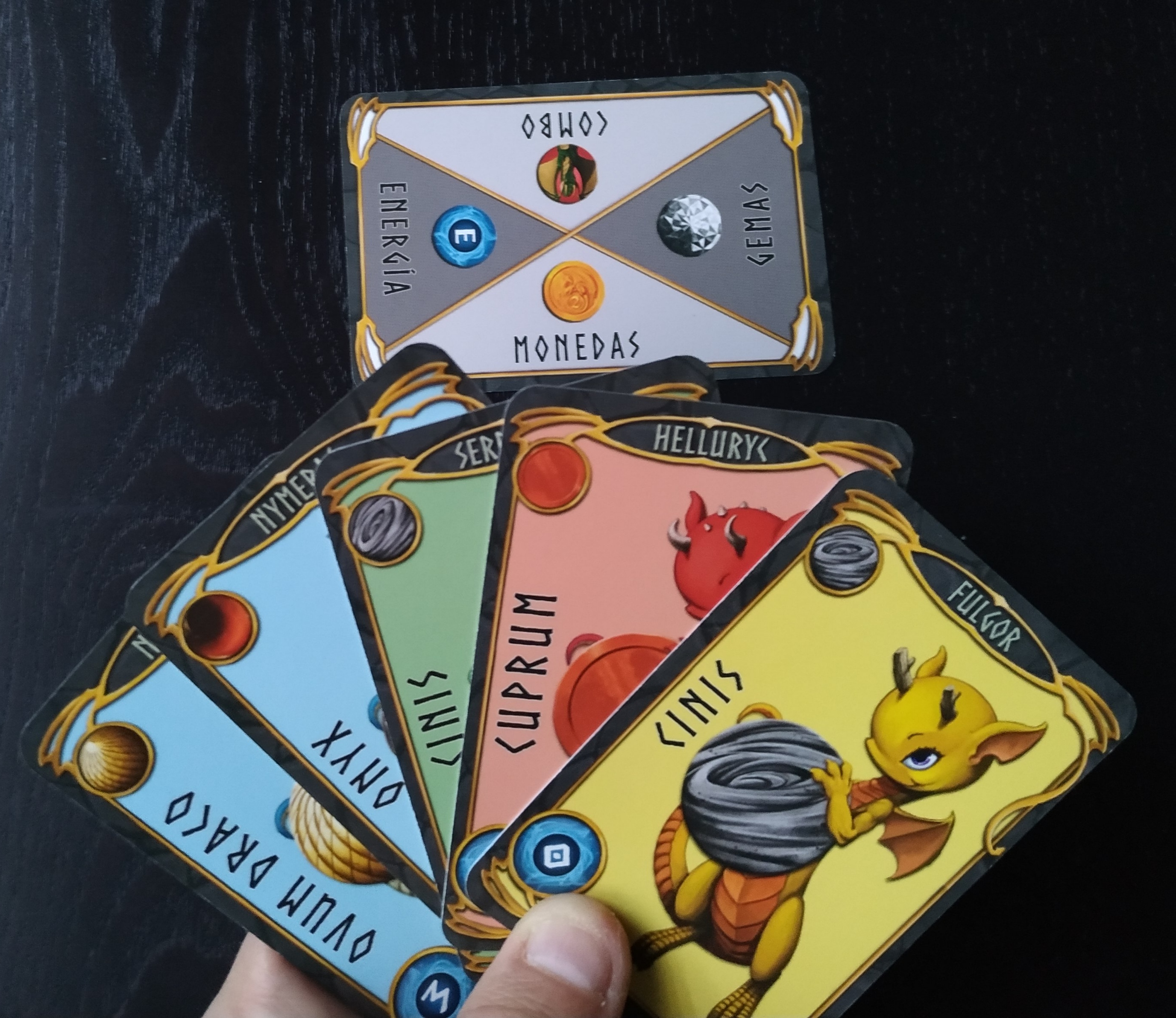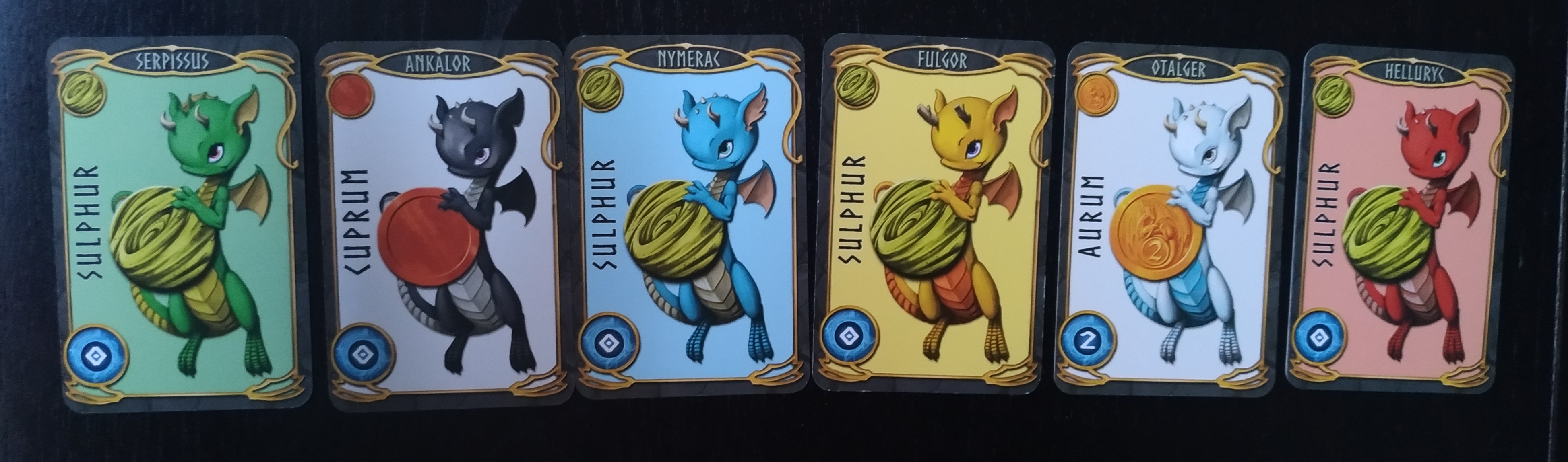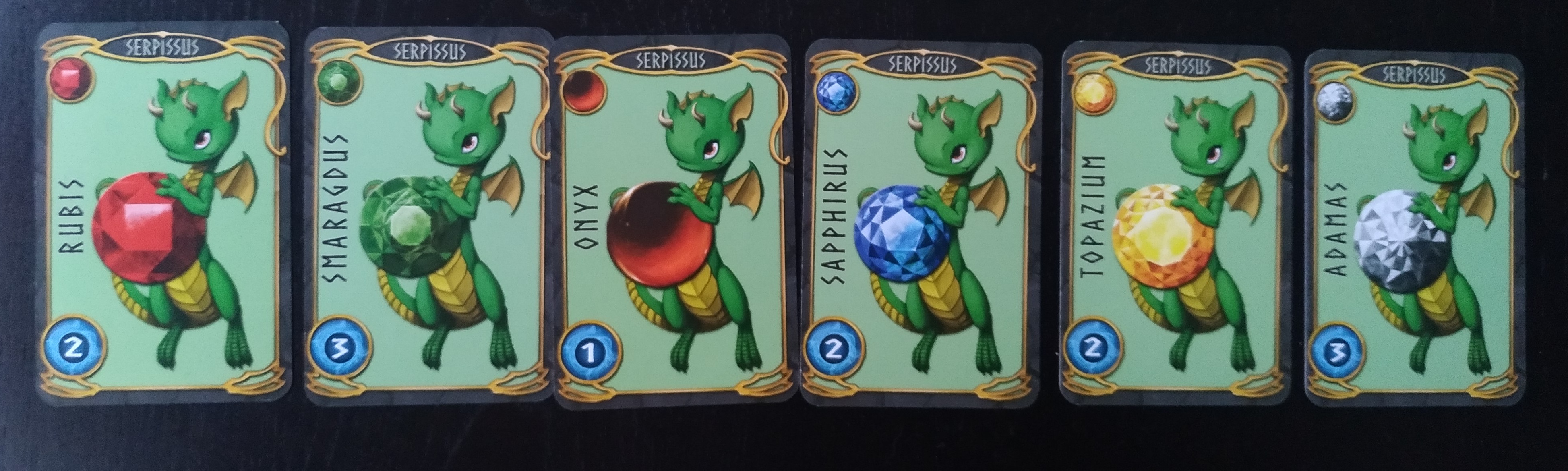 En ellas podemos ver un dragón con un objeto y una bola de puntuación, en color azul, en la parte inferior. Tenemos disponibles 6 dragones, cada uno de ellos asociado a una gema y si en la carta aparecen junto a ella, esa carta tendrá un valor de energía superior.