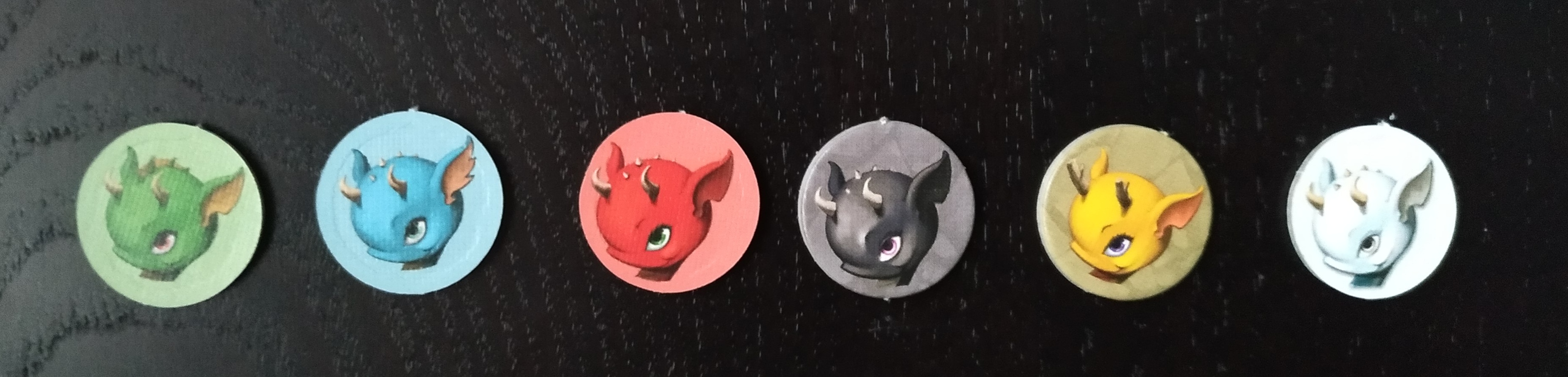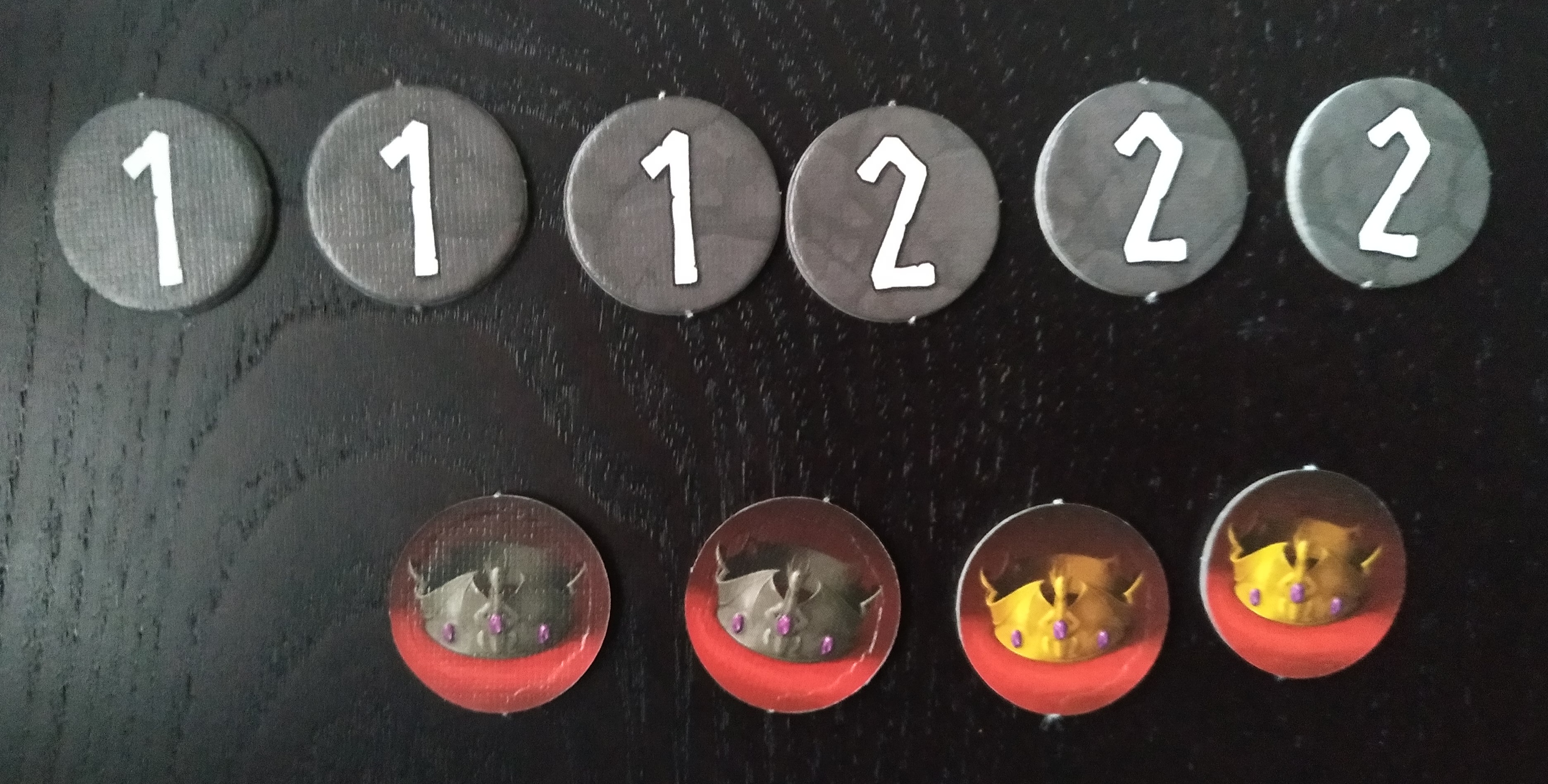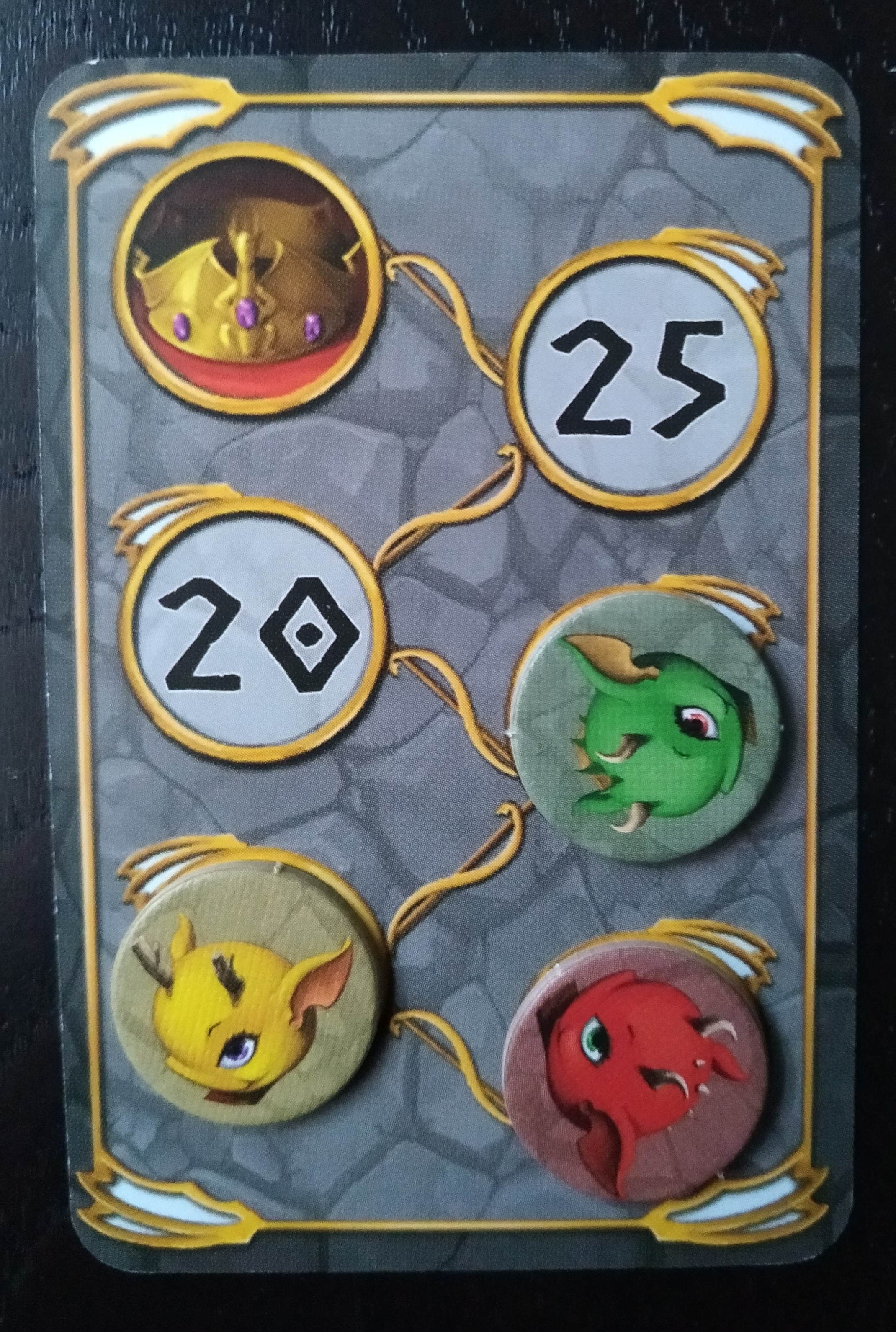 Barajamos las cartas de dragón y damos 5 a cada jugador. Se colocan junto a la carta de contador todos los marcadores de corona y el resto de cartas de dragón.