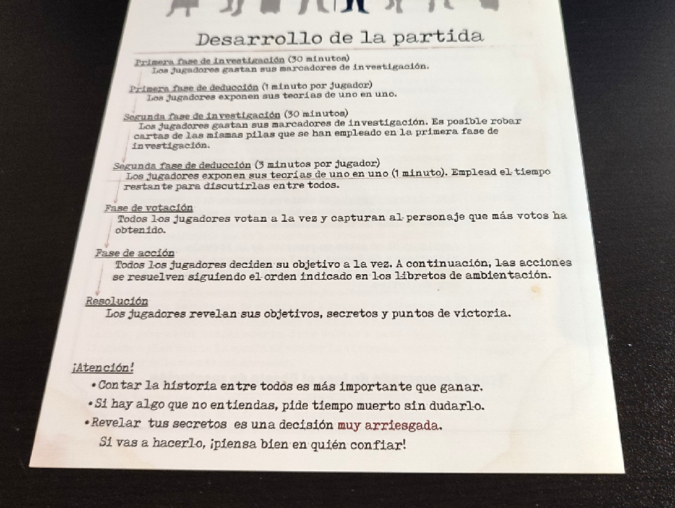 Además, es el momento en el que los jugadores pueden utilizar sus fichas de investigación para coger las diferentes cartas que hay en el centro de la mesa e intentar conseguir alguna pista que les venga bien para resolver el misterio.