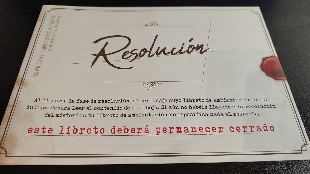 En esta última fase, el jugador en cuyo libreto así lo indique, leerá en voz alta la resolución del misterio y revelará sus objetivos, sus puntos de victoria y sus secretos al resto de participantes.