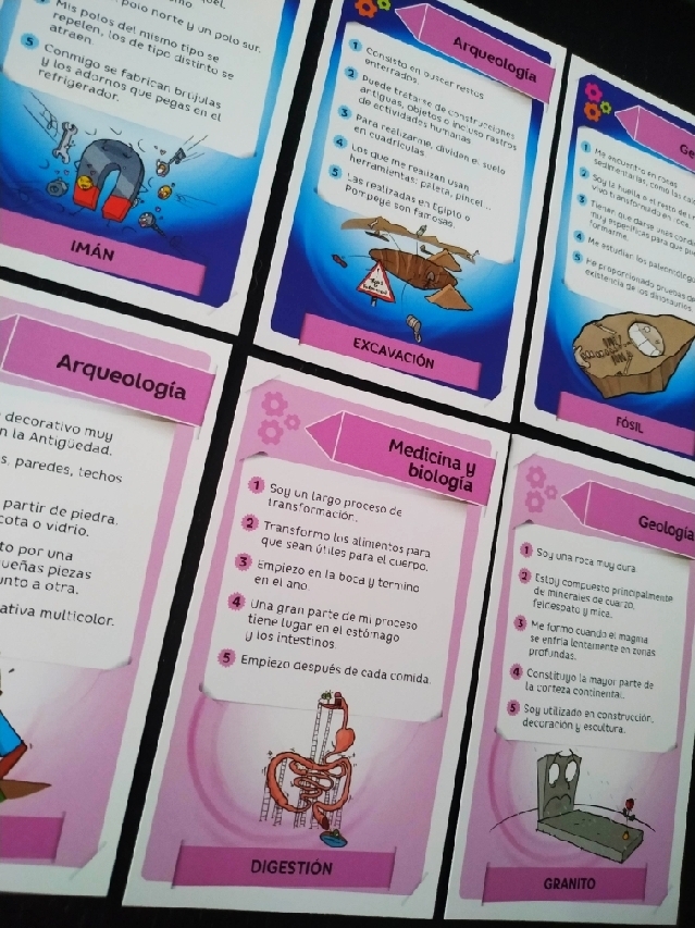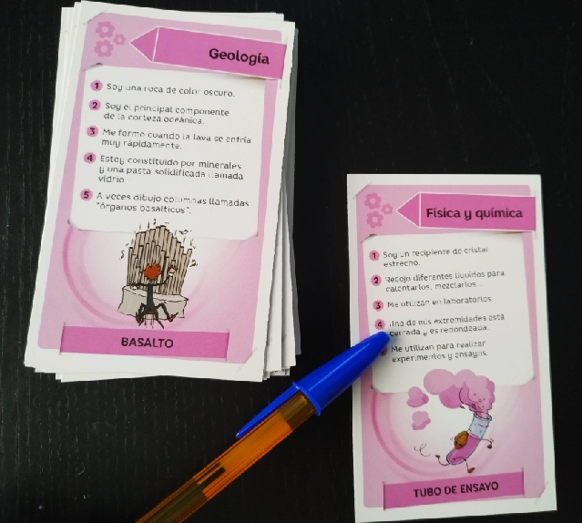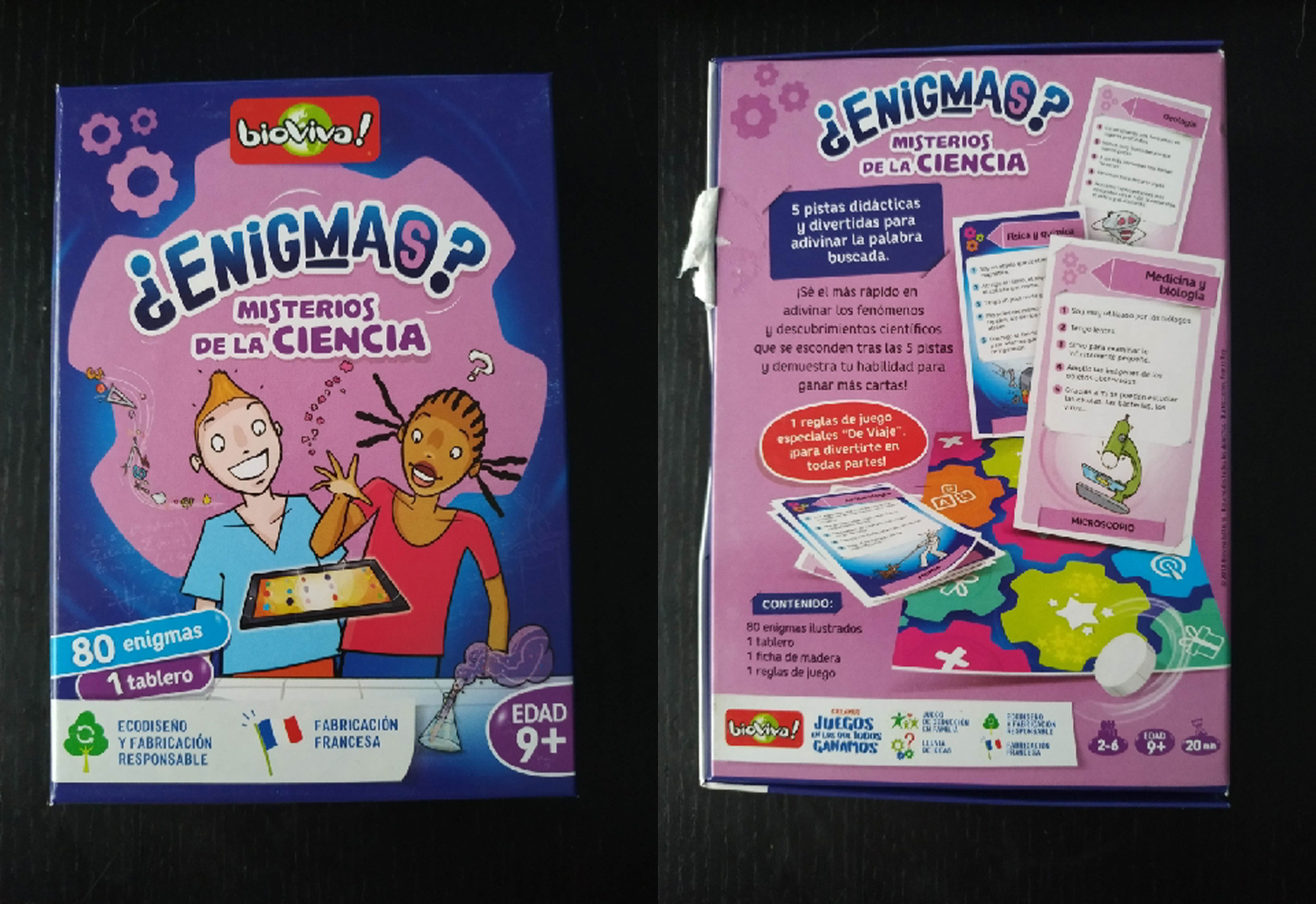 En ¿Enigmas? Misterios de la ciencia tendremos tarjetas con pistas que iremos escuchando para poder asociarlas a un concepto que debemos adivinar. Si somos los más rápidos, nos quedaremos con la tarjeta y, cuando alguno de nosotros haya ganado 6 cartas, terminará la partida.