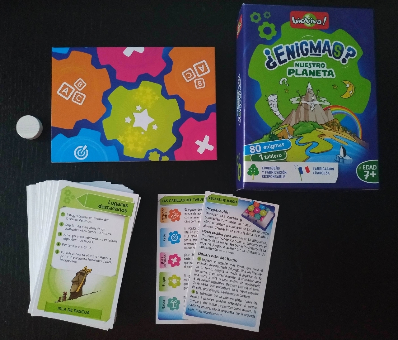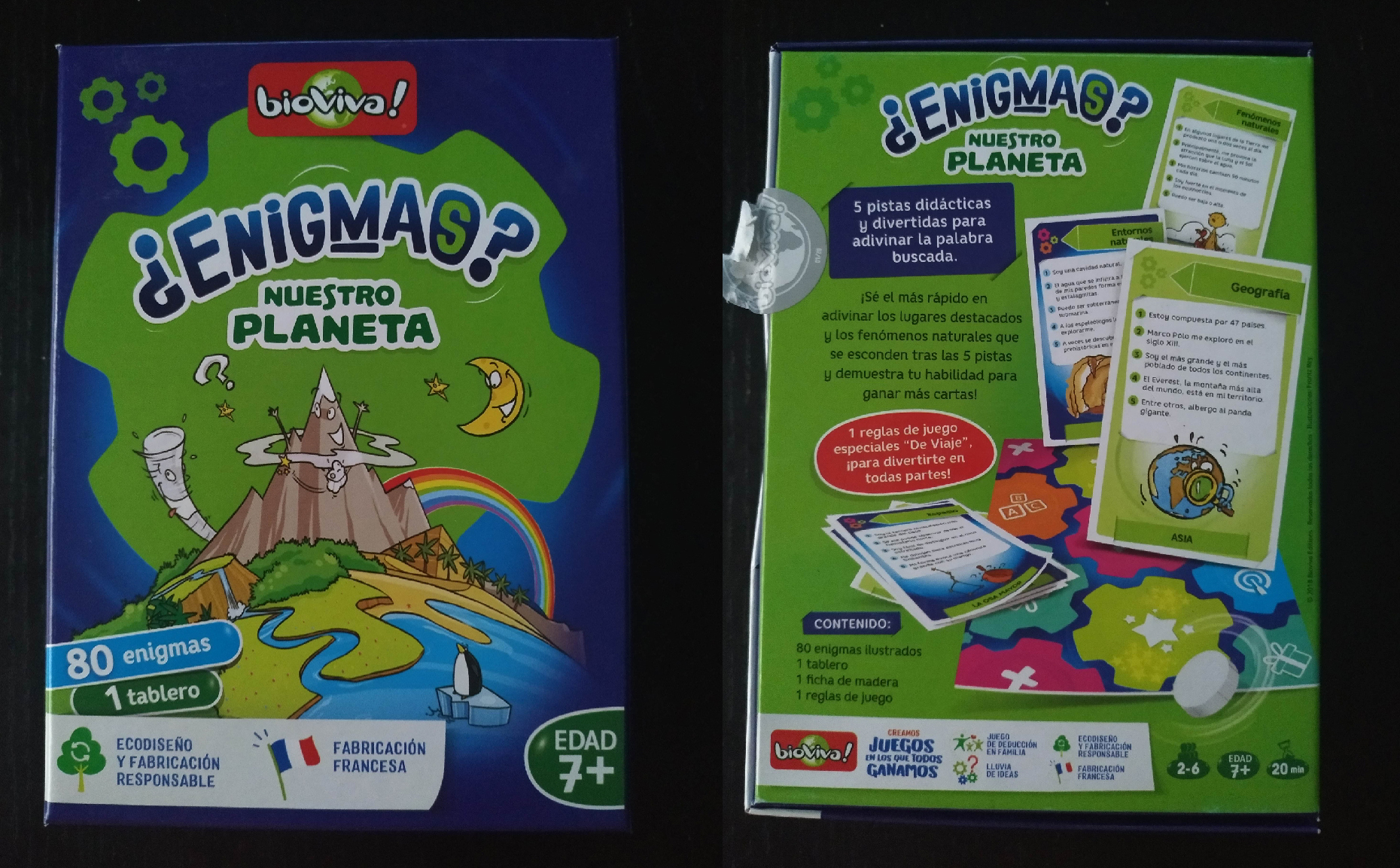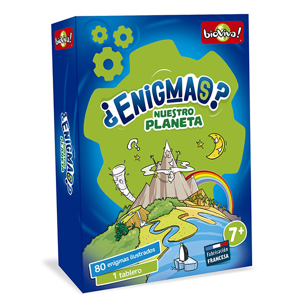 En esta ocasión los colores que caracterizan ¿Enigmas? Nuestro planeta son el verde y el azul, dos colores perfectos para representar el lugar en el que vivimos. La ilustración que preside la portada de la caja muestra elementos de nuestro planeta, principalmente de naturaleza.