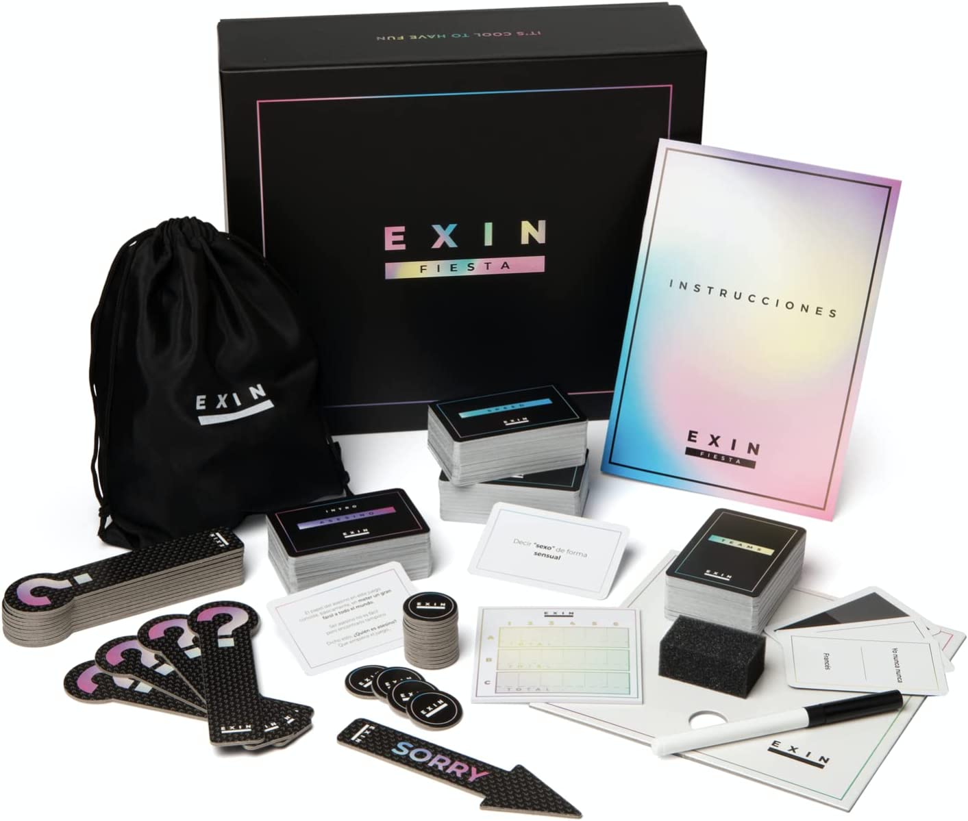 Exin fiesta es un juego de mesa compuesto por tres juegos: El asesino, donde tendrás que observar y descubrir cómo se comportan tus amigos cuando tienen algo que ocultar, Teams, en el que deberás relacionarte con todo el grupo y contagiarte de la diversión y, por último, Speed, donde deberás dejar volar tu imaginación y mostrar tu personalidad entre risas.