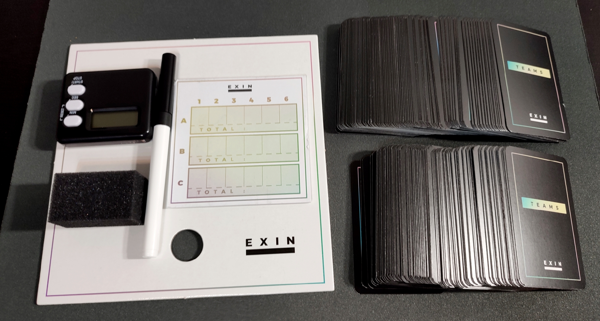Dentro de la caja nos vamos a encontrar un buen puñado de componentes. Para empezar, se incluyen nada más y nada menos que casi 600 cartas, que se dice pronto. Esta cantidad ingente es debido a que dos de sus juegos necesitarán una variedad importante de ellas. Pero es que, además de todas estas cartas y bastantes fichas de cartón de buena calidad, nos encontramos con una bolsa de tela, un temporizador, una pizarra con su rotulador y su borrador… es decir, todos los elementos que se precien para disfrutar de este tipo de juegos.