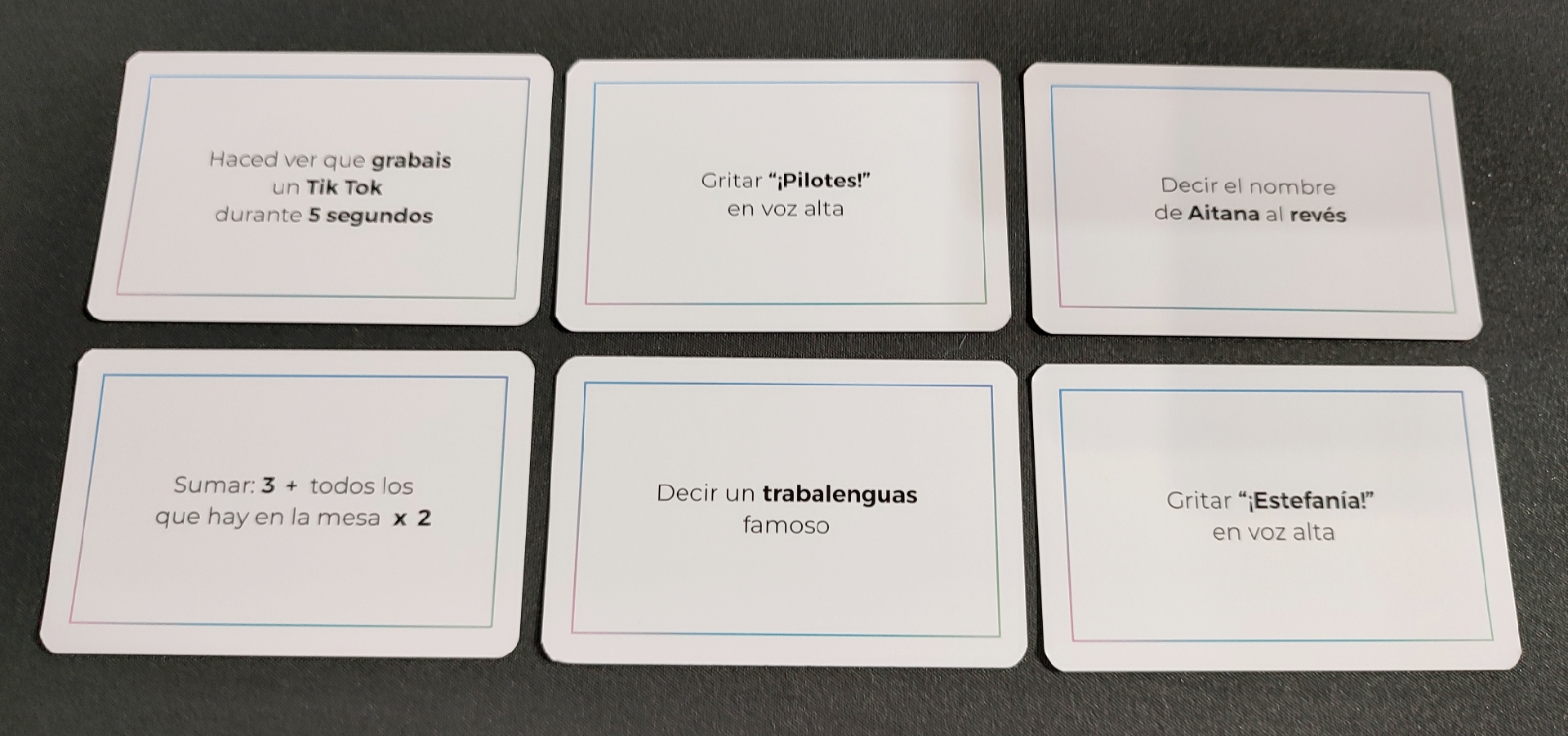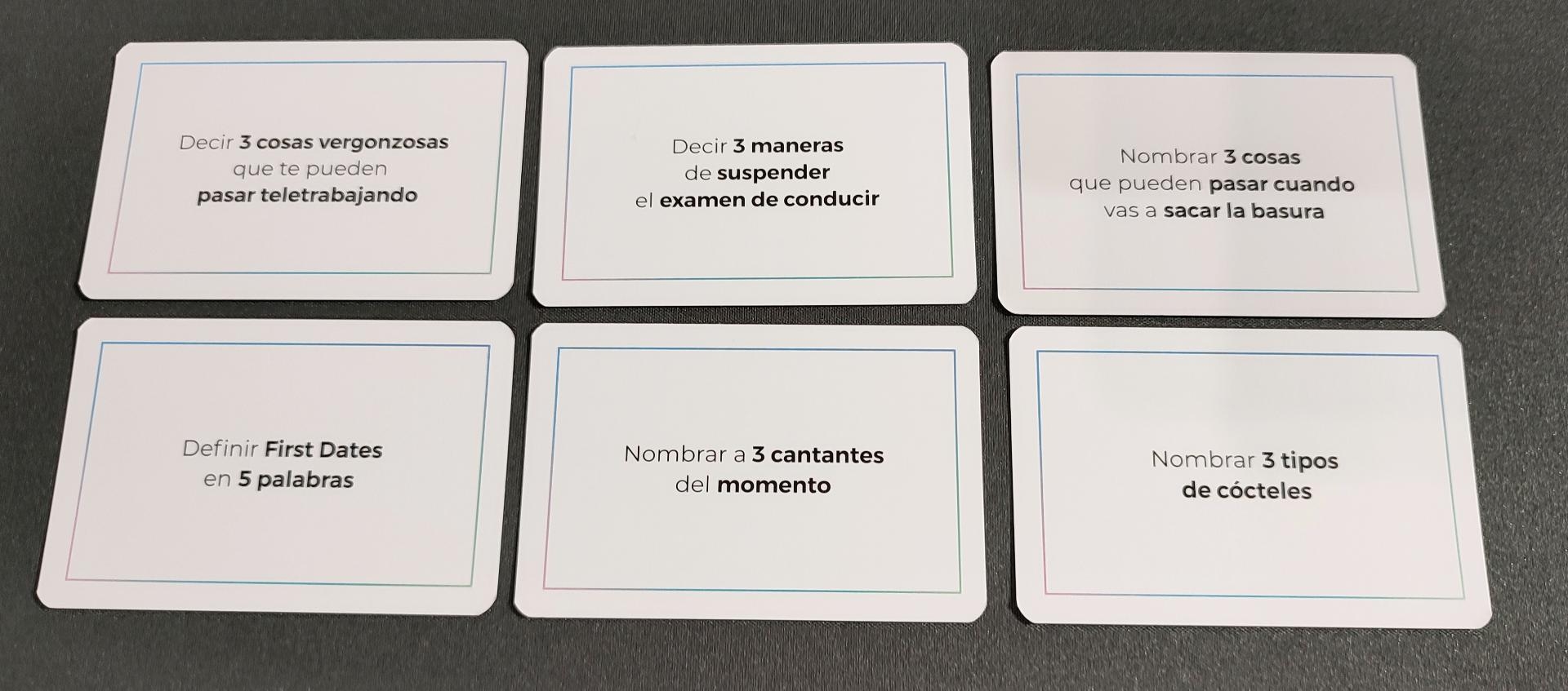 Otras cartas incluso, como decimos, propondrán a los jugadores actuar o hacer cosas como: permanecer quietos durante 5 segundos, seducir durante 5 segundos al jugador de enfrente, cantar la estrofa de alguna canción, gritar en voz alta alguna palabra, dar una vuelta sobre vosotros mismos, posar como un florero…