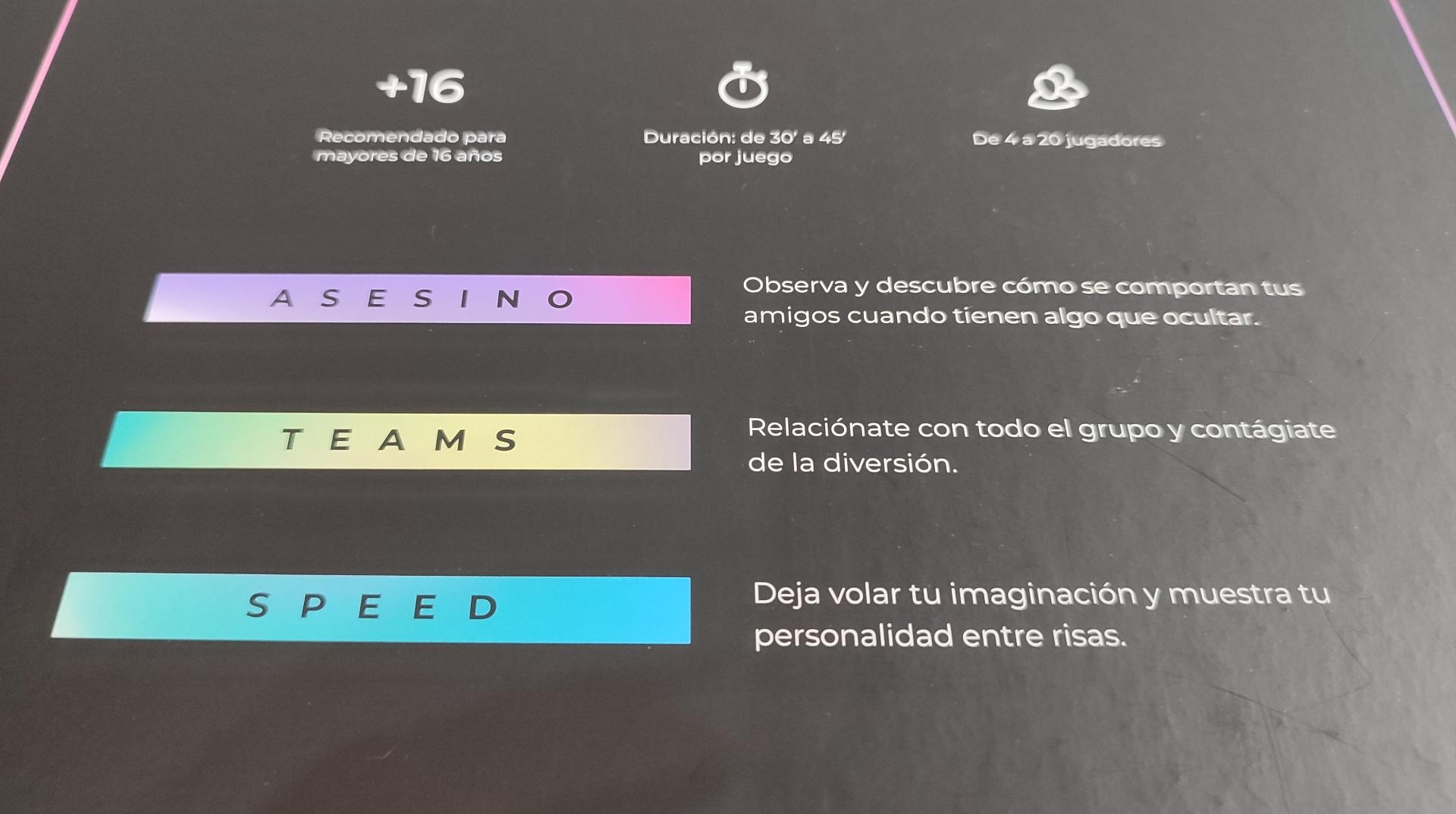 Por otro lado, si pasamos a analizar la escalabilidad de Exin fiesta, tenemos que tener claro que estamos ante un juego totalmente party y eso significa un rango relativamente alto de jugadores. De hecho, oficialmente el juego va de 4 a 20 jugadores, pero perfectamente podrían jugar más si se quisiera siempre y cuando se respeten un poco los tamaños de los equipos en el Teams y en el Speed y siempre que se añadan proporcionalmente más inocentes y asesinos al juego del Asesino, aunque sea de un modo más casero. Es decir, en este sentido, si somos más de 20 y queremos que participe todo el mundo, ese número se puede aumentar sin mayor problema.