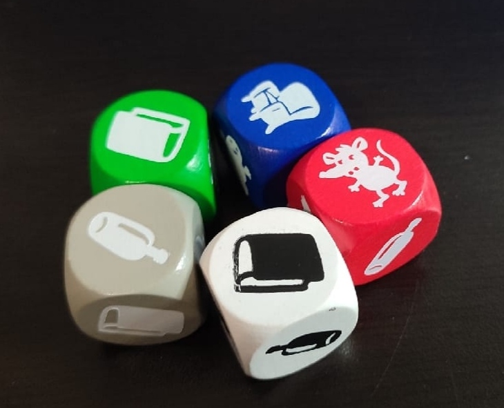 Pasando a hablar de su rejugabilidad, decir que es muy alta ya que las rondas estarán totalmente marcadas por el azar y los resultados de los dados tienen infinitas combinaciones entre ellos. Nunca sentiremos que un lanzamiento es igual a otro porque han de combinarse color y figura entre 5 dados de 6 caras así que en cada tirada veremos opciones diferentes y tendremos que coger un objeto distinto de entre los 5 disponibles.
