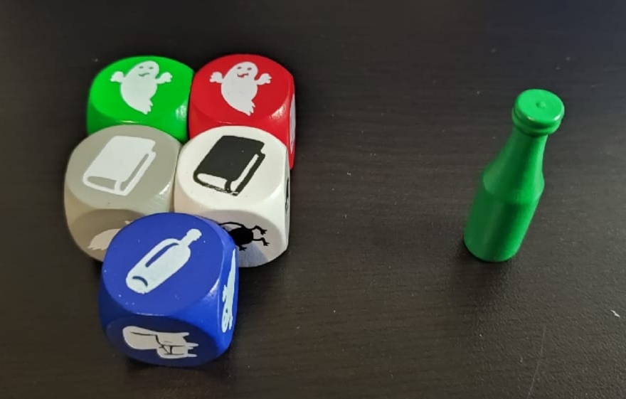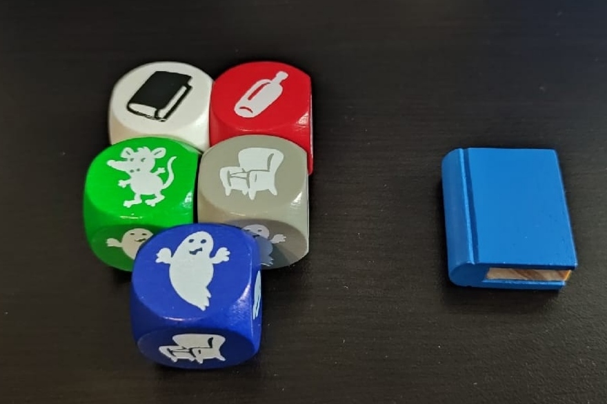 Por ejemplo, en esta tirada han aparecido los 5 objetos. Miraremos el dado del fantasma y, como es de color azul, deberemos coger el dado del objeto azul, que es el libro.