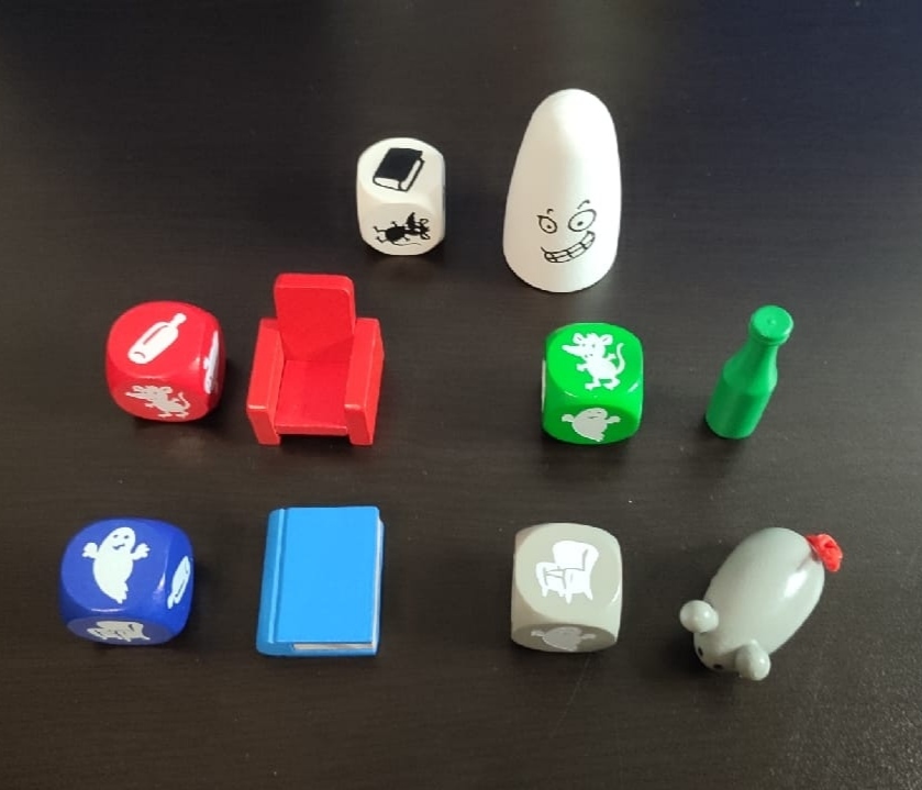 Su contenido es llamativo: 5 dados de madera bien grandes de colores cuyas caras están personalizadas para mostrar los objetos que deberemos ser capaces de coger en cada turno. También en madera, muy realistas y vistosos, tenemos de un tamaño más que aceptable las 5 figuras de ratón, libro, sofá, botella y fantasma que tanto usaremos durante nuestras partidas. Por último, encontramos unas fichas de madera amarillas que usaremos para ir contabilizando puntos cuando ganemos en cada ronda.
