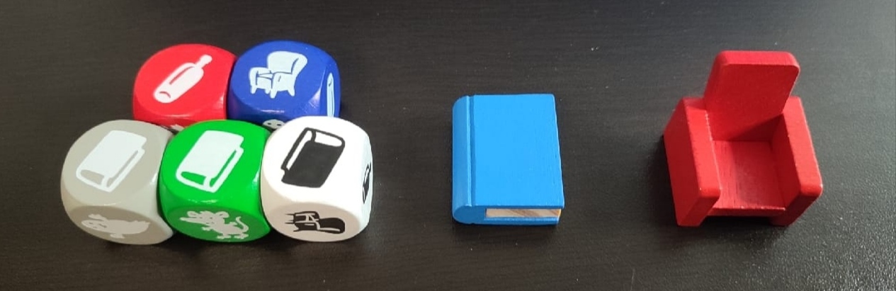 Por ejemplo, en la imagen vemos que el libro es el objeto que más aparece y, como es de color azul, deberemos ir al dado azul para coger el objeto que aparece, que sería el sofá.