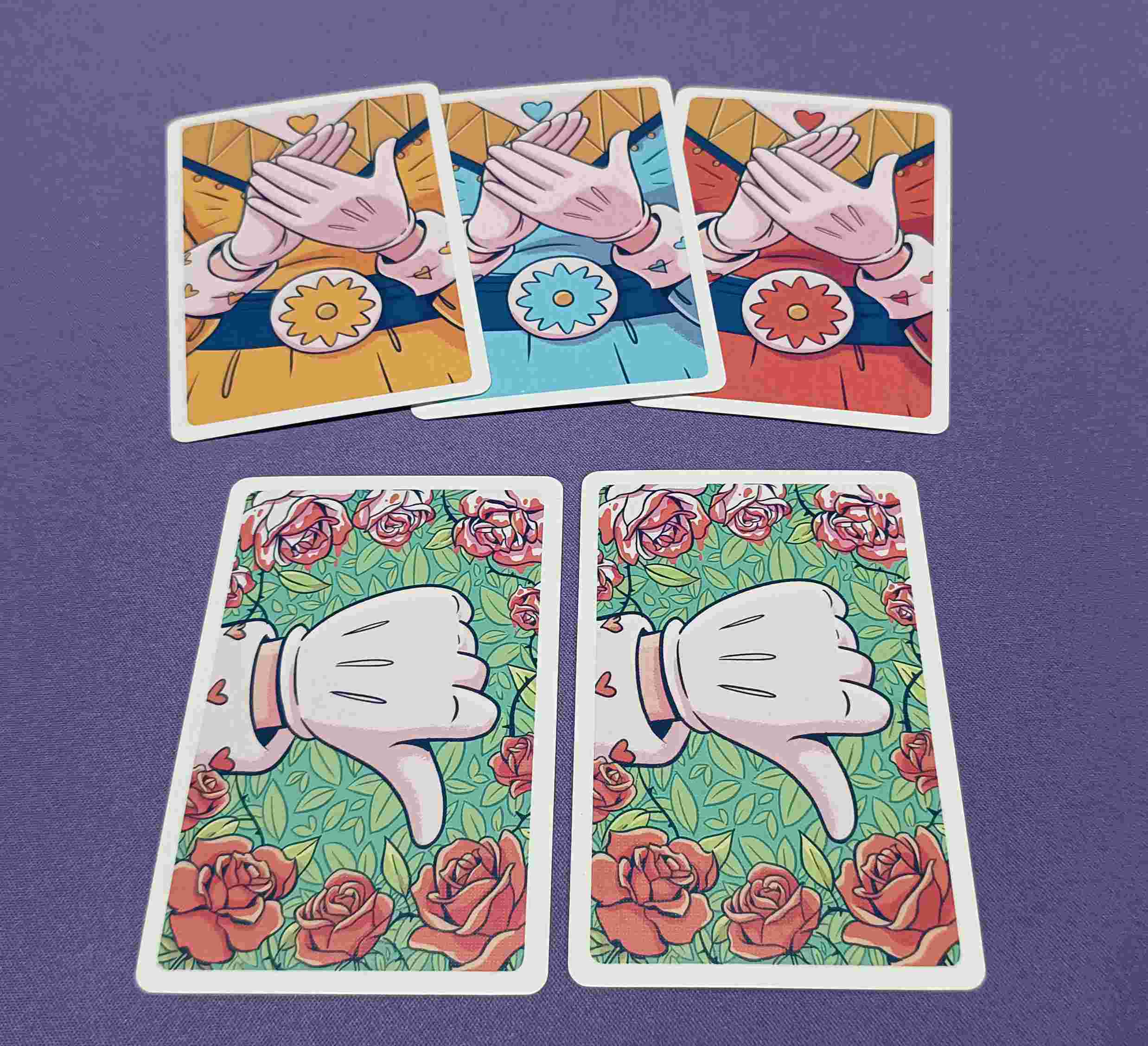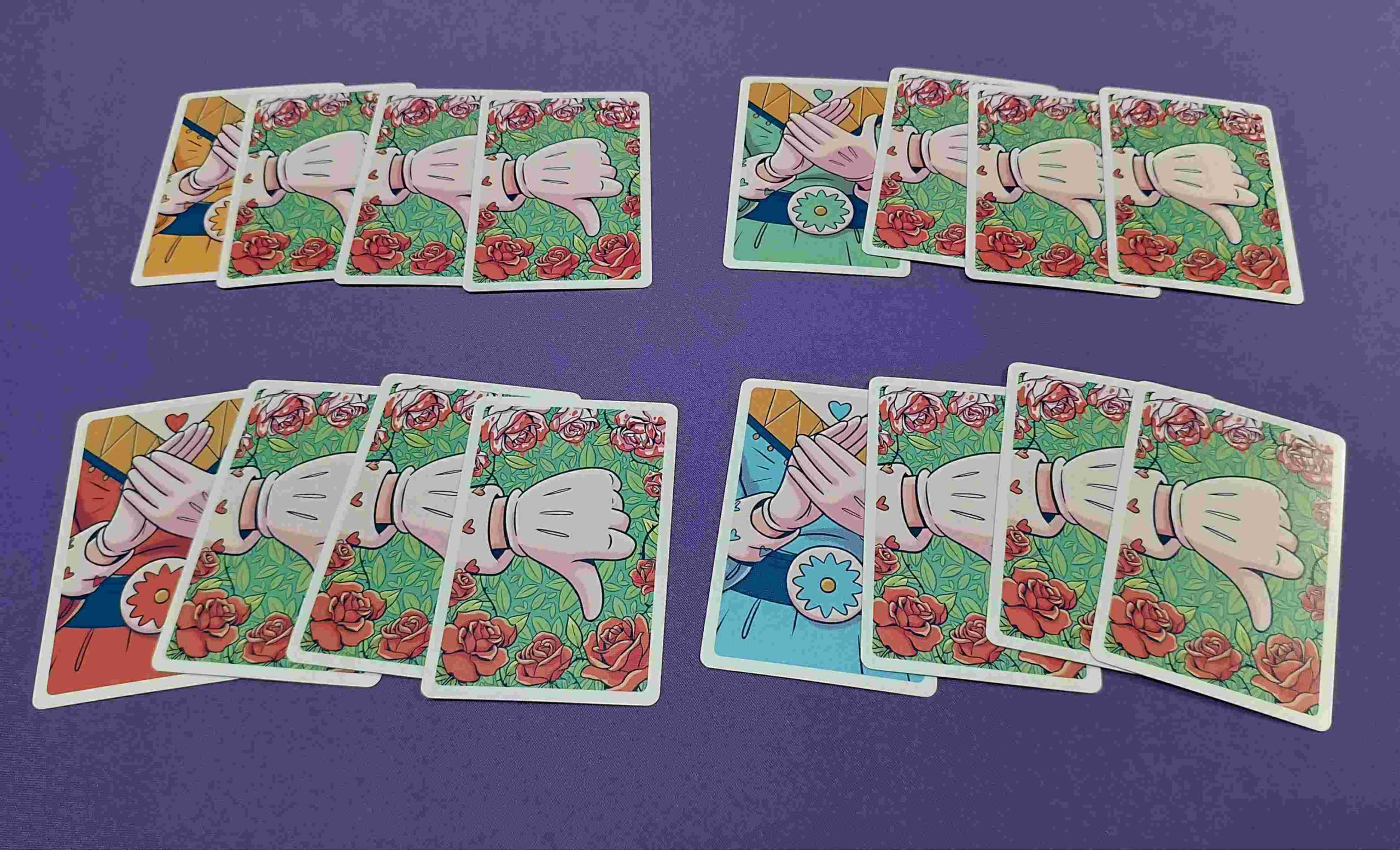 - Reparte una carta de aplauso a cada jugador de su color elegido y las cartas de pulgar hacia abajo correspondientes al número de participantes: