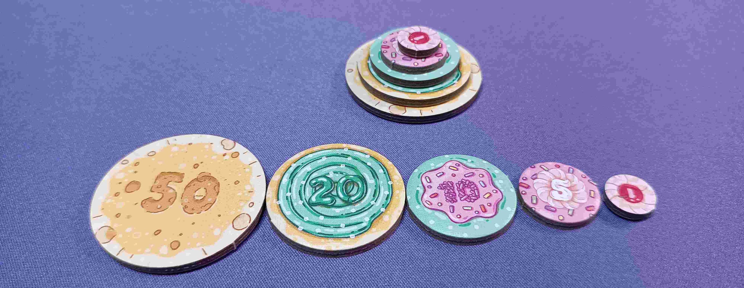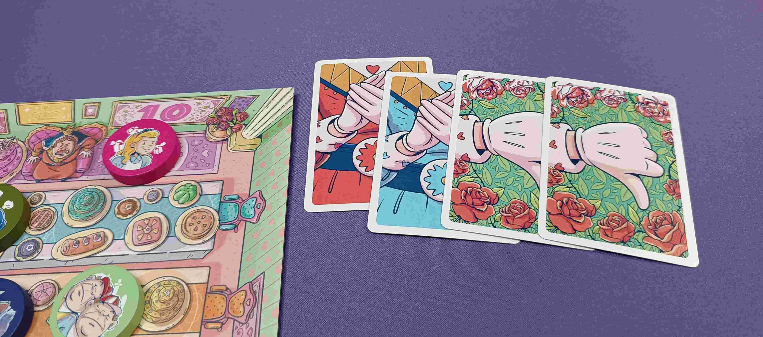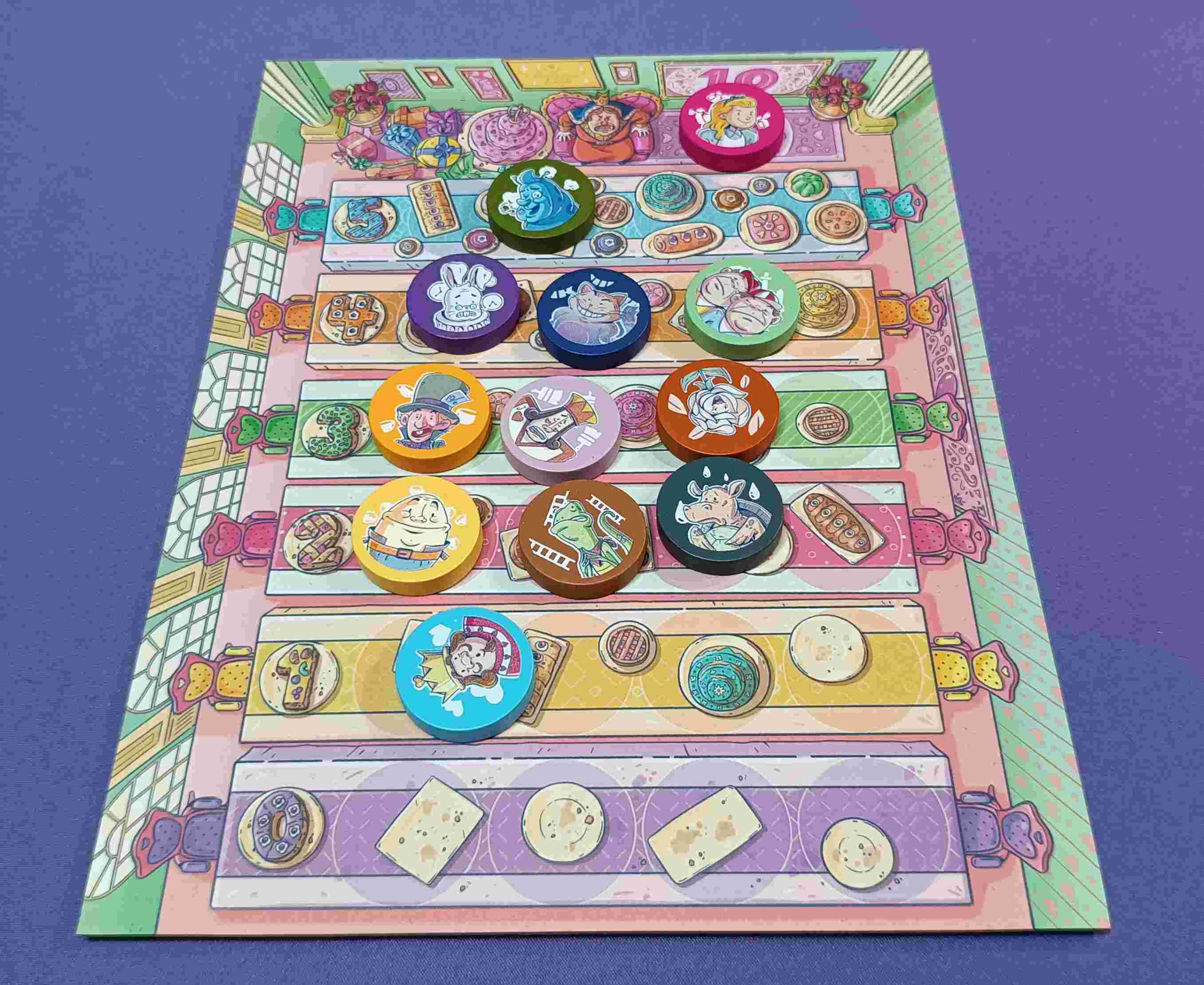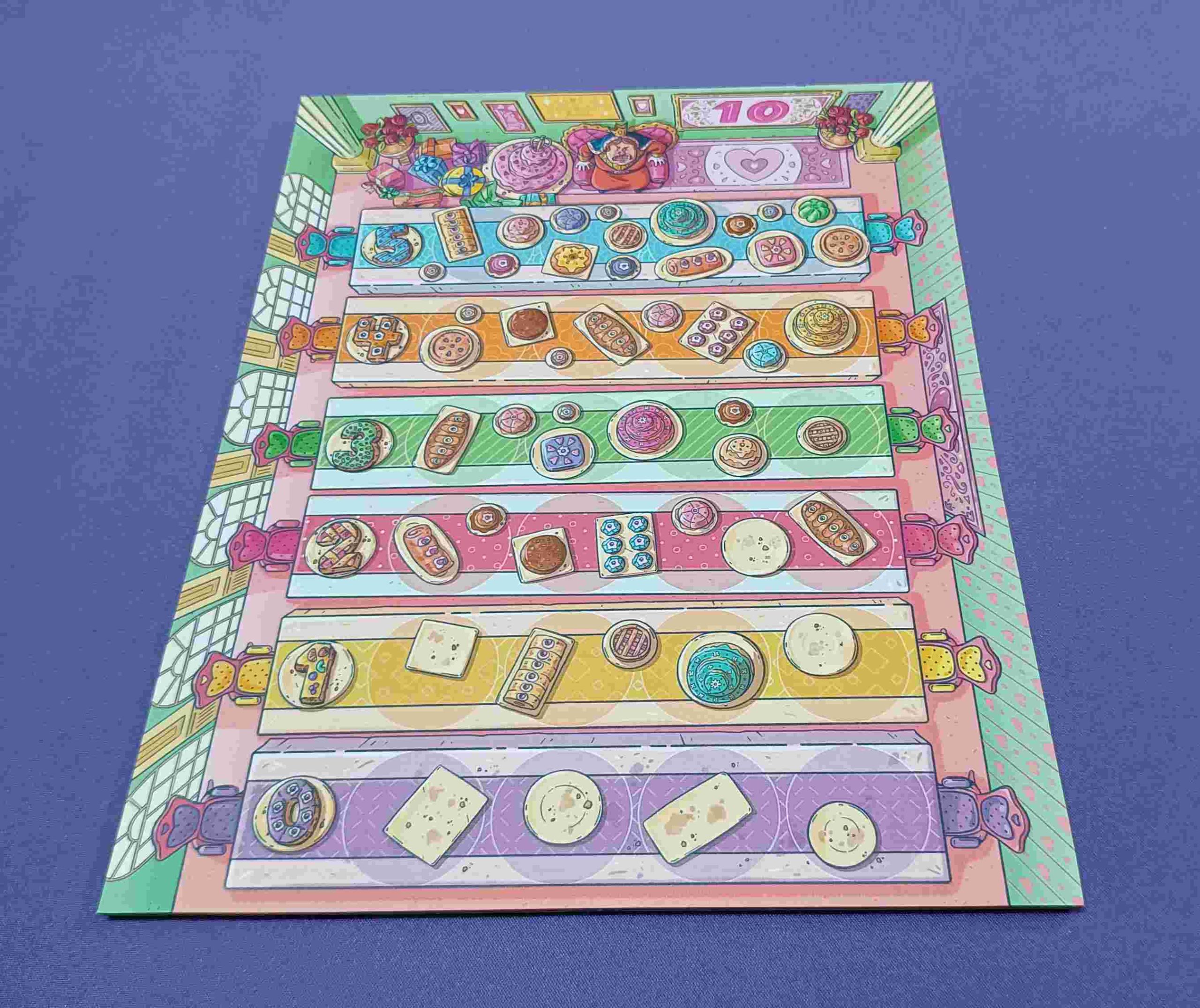 El diseño del juego es colorido y atractivo lo que añade un toque visual encantador. La calidad de los componentes es notable y tienen un diseño que capta la atención y sumerge a los jugadores en la temática del juego que incluye un tablero a todo color, cartas ilustradas, fichas de puntuación en diferentes tamaños que, si las amontonas tienen forma de tarta y fichas de los diferentes personajes.