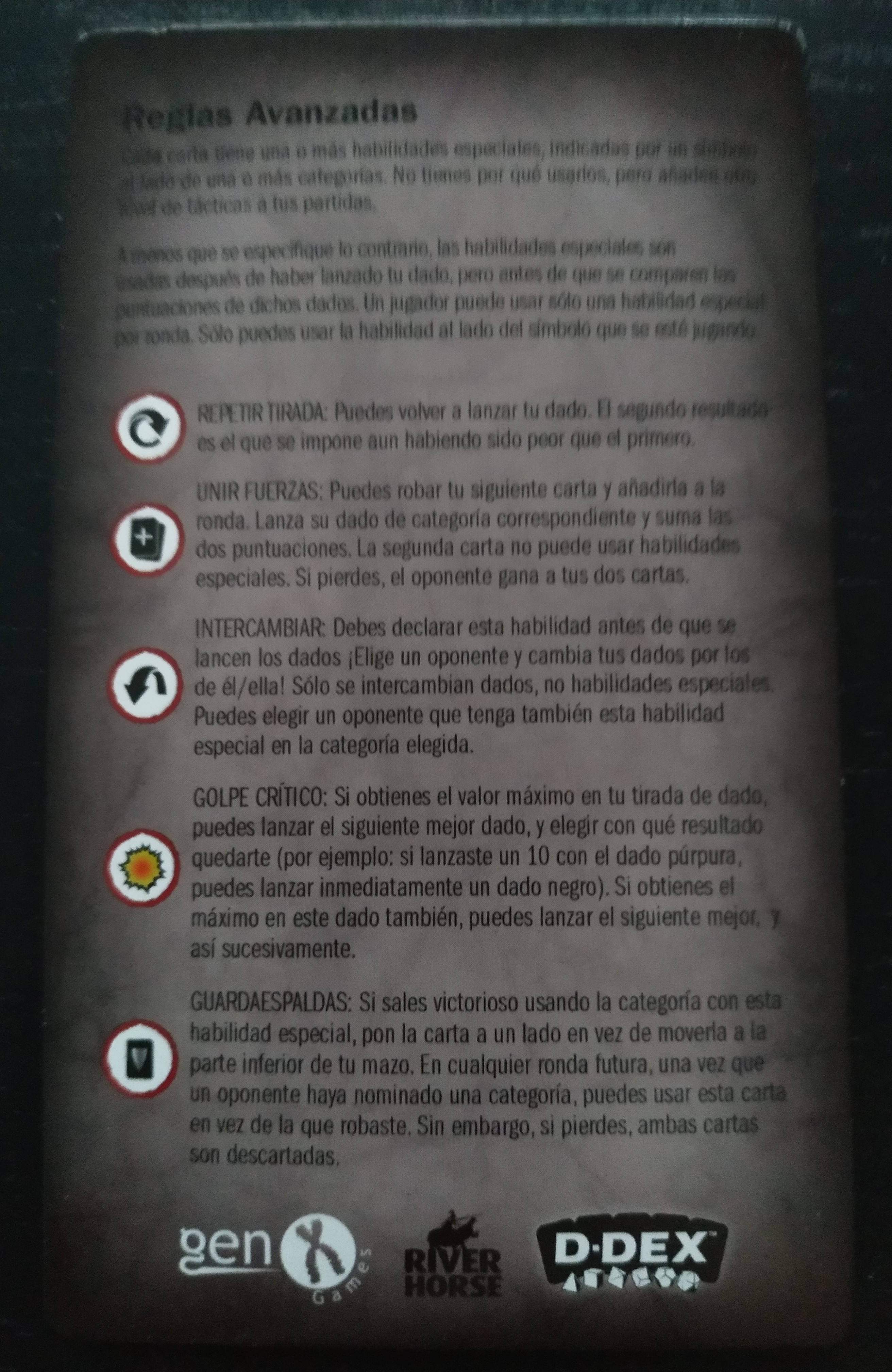- Guardaespaldas: Si el jugador sale victorioso con la categoría de su carta donde tiene esta habilidad, colocará la carta a un lado y podrá jugarla en rondas futuras en lugar de la carta que le toque.