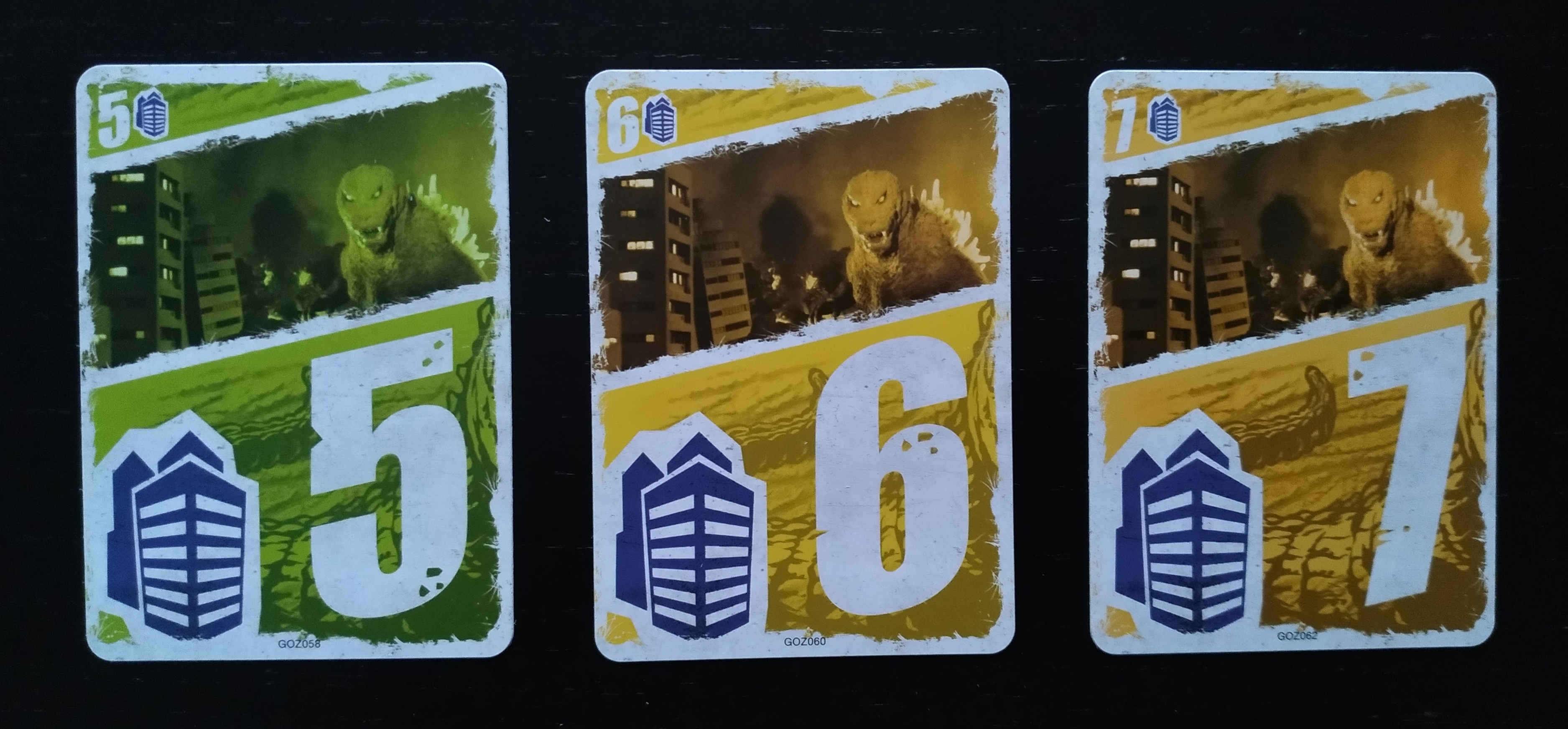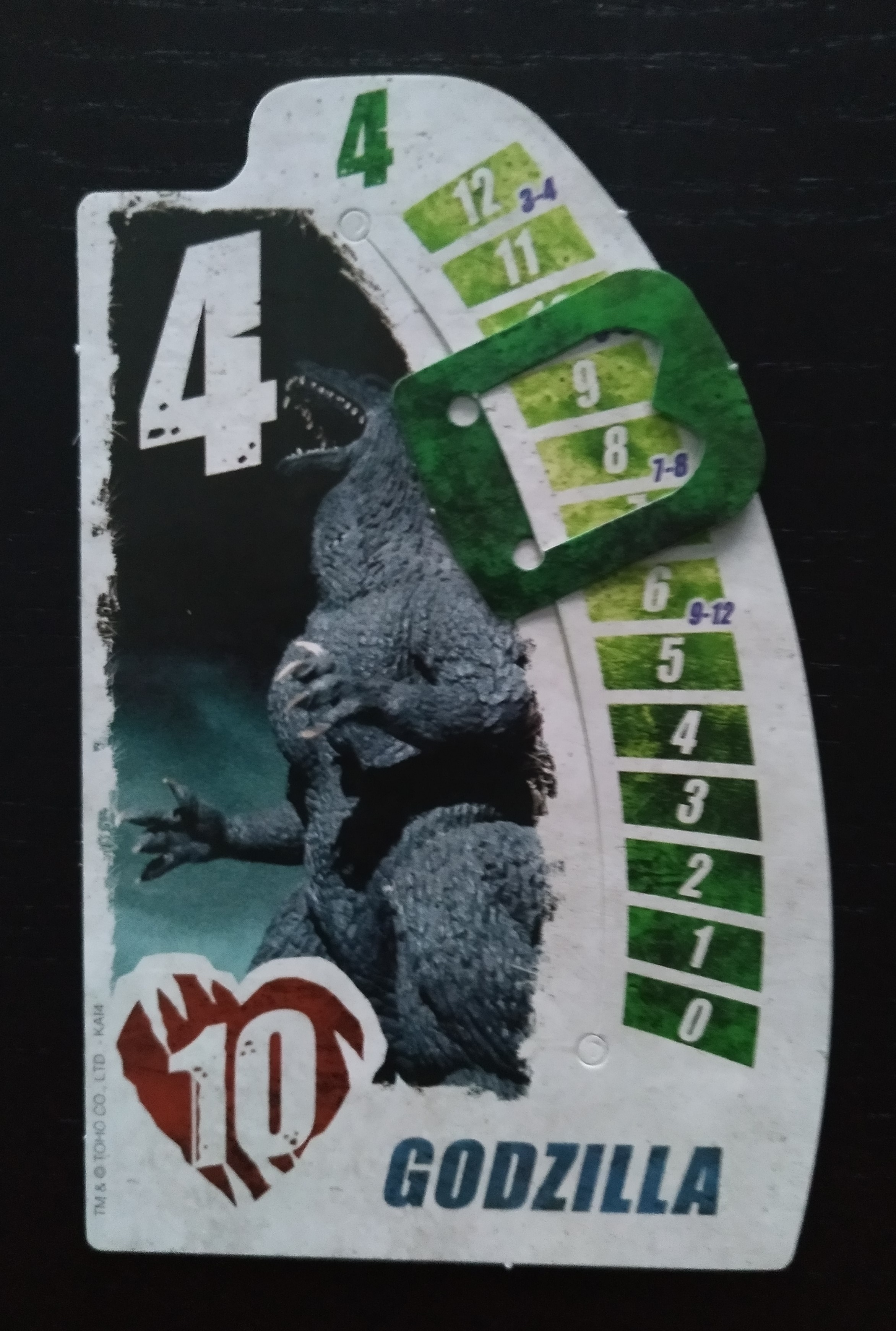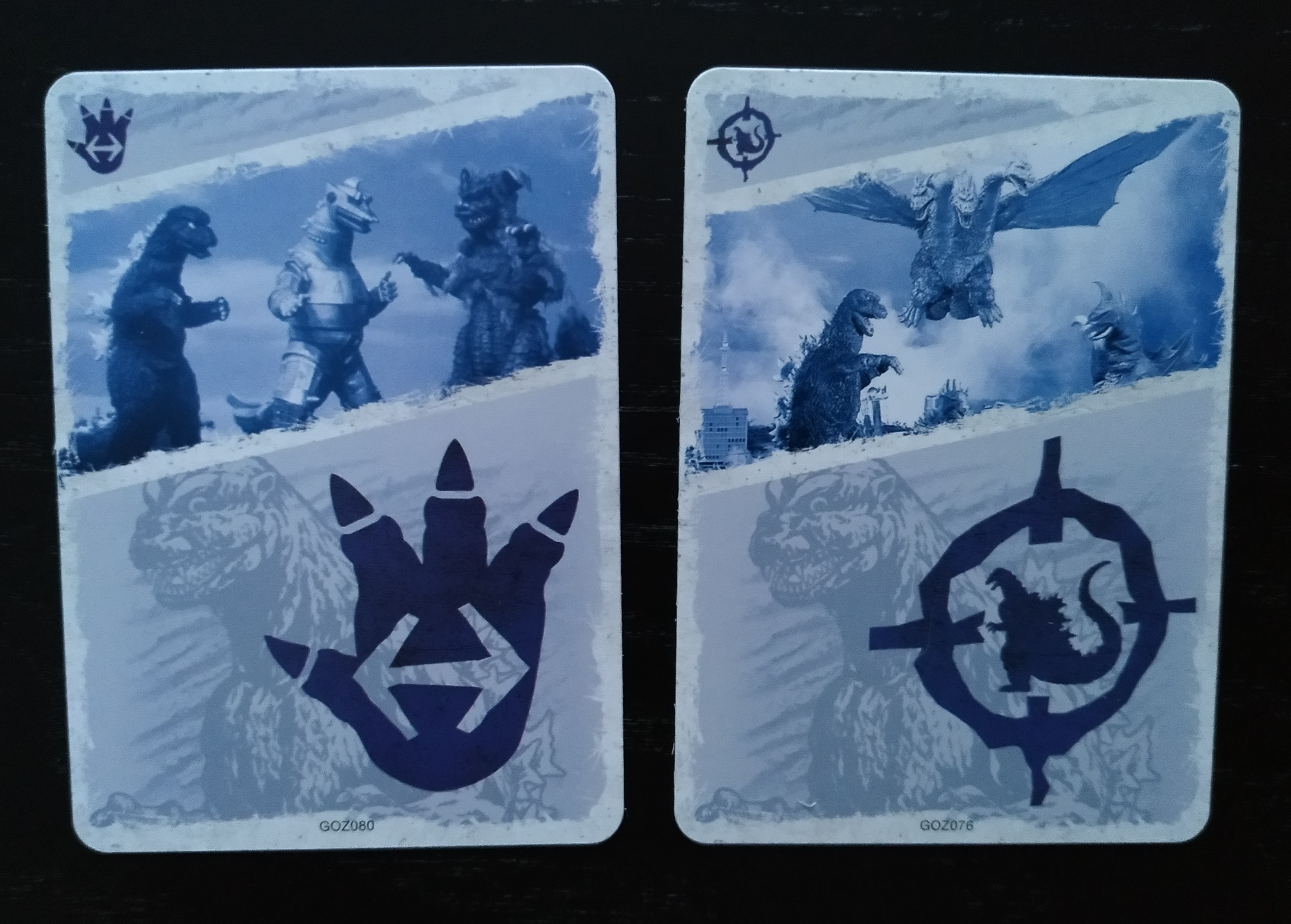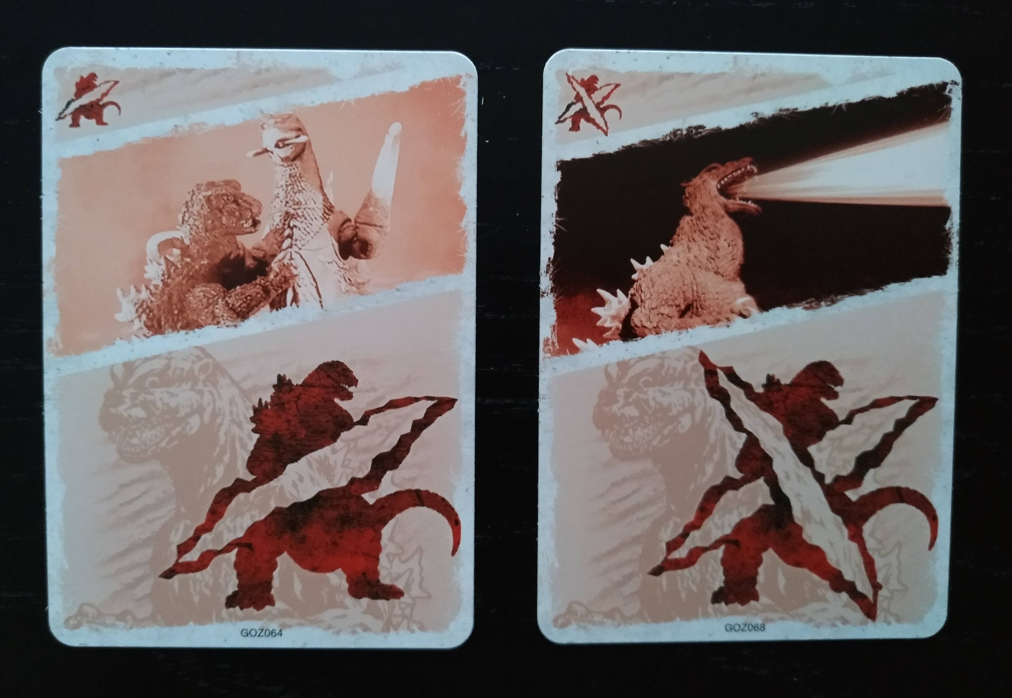 Sin duda, una de las cosas que más llama la atención es la propia caja. De tamaño relativamente pequeño, vemos que en la portada hay una ilustración magnífica de Godzilla que ocupa la mayor parte de ella. Dentro de la caja nos encontramos con una gran cantidad de cartas de buena calidad y 12 tarjetas de Kaiju con un sistema de señalización de puntos muy original. Son tarjetas en las que existe una hendidura en donde podemos colocar un señalador que se puede mover para poder ir variando la cantidad de puntos. Si bien es cierto que hay que tener cuidado con estas tarjetas porque no son especialmente gruesas, no resta mucho a la calidad de producción general del juego y como decimos nos ha parecido una gran idea.