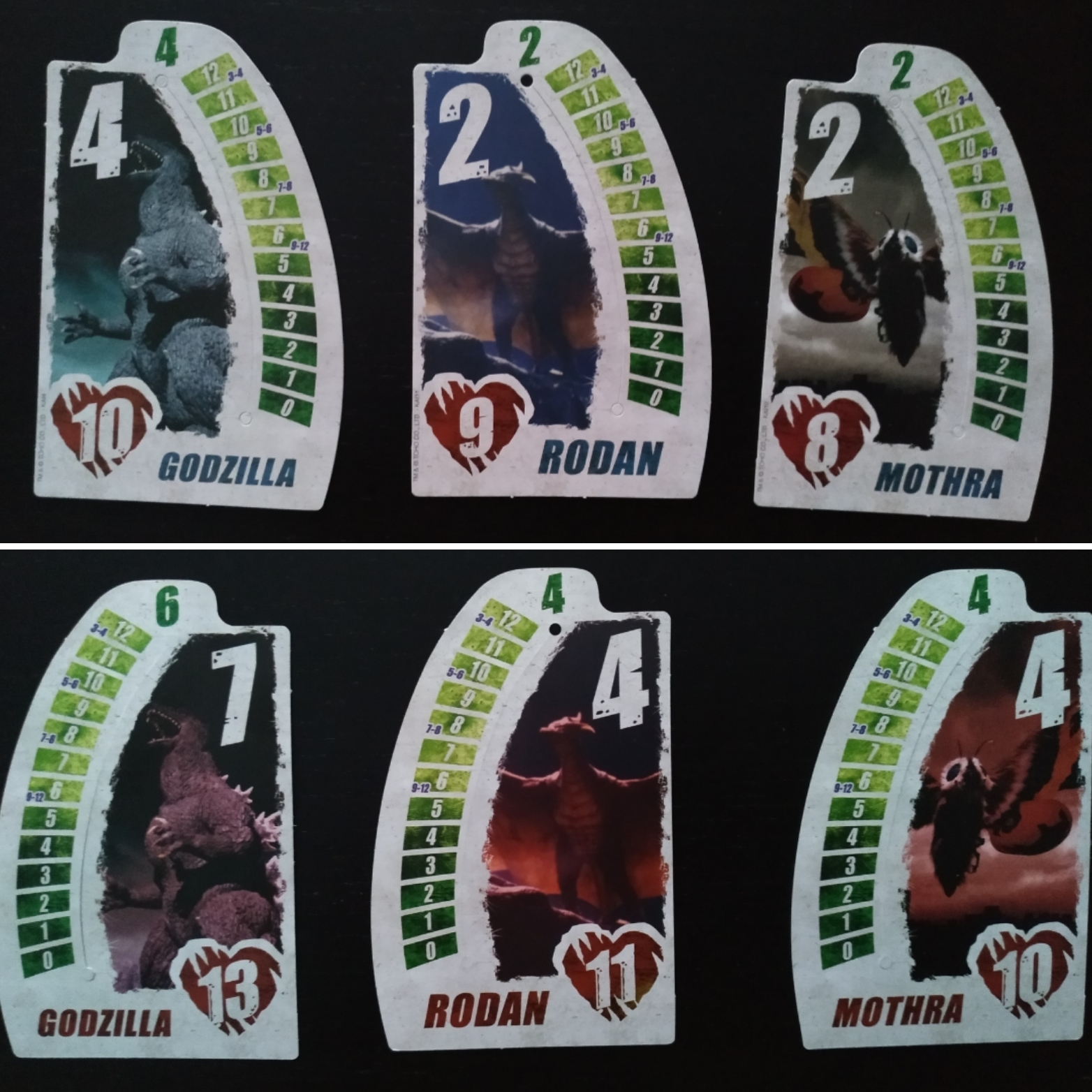 Para preparar una partida de «Godzilla Total War«, cada uno de los jugadores deberá elegir a uno de los «Kaiju» disponibles y colocar la hendidura en el 0.