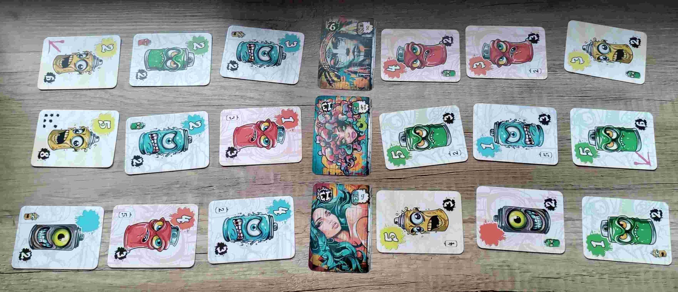 A cada lado de estas cartas, cada jugador tendrá su propia zona de juego en la que deberá imaginar una cuadrícula de 3×3 donde colocará 9 cartas en total. El objetivo es ir colocando cartas de sprais intentando acercarse lo máximo posible a la puntuación que marcan cada uno de los grafitis centrales.