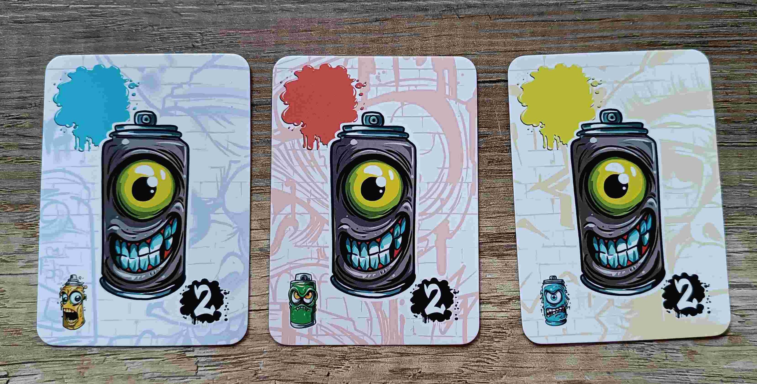 En los anversos encontramos como elemento principal, botes de sprai de diferentes colores que tienen personalidad propia. En sus esquinas superiores izquierdas vemos el mismo color del bote y un número de puntuación y en la franja inferior una condición de puntos para cuando puntuemos.