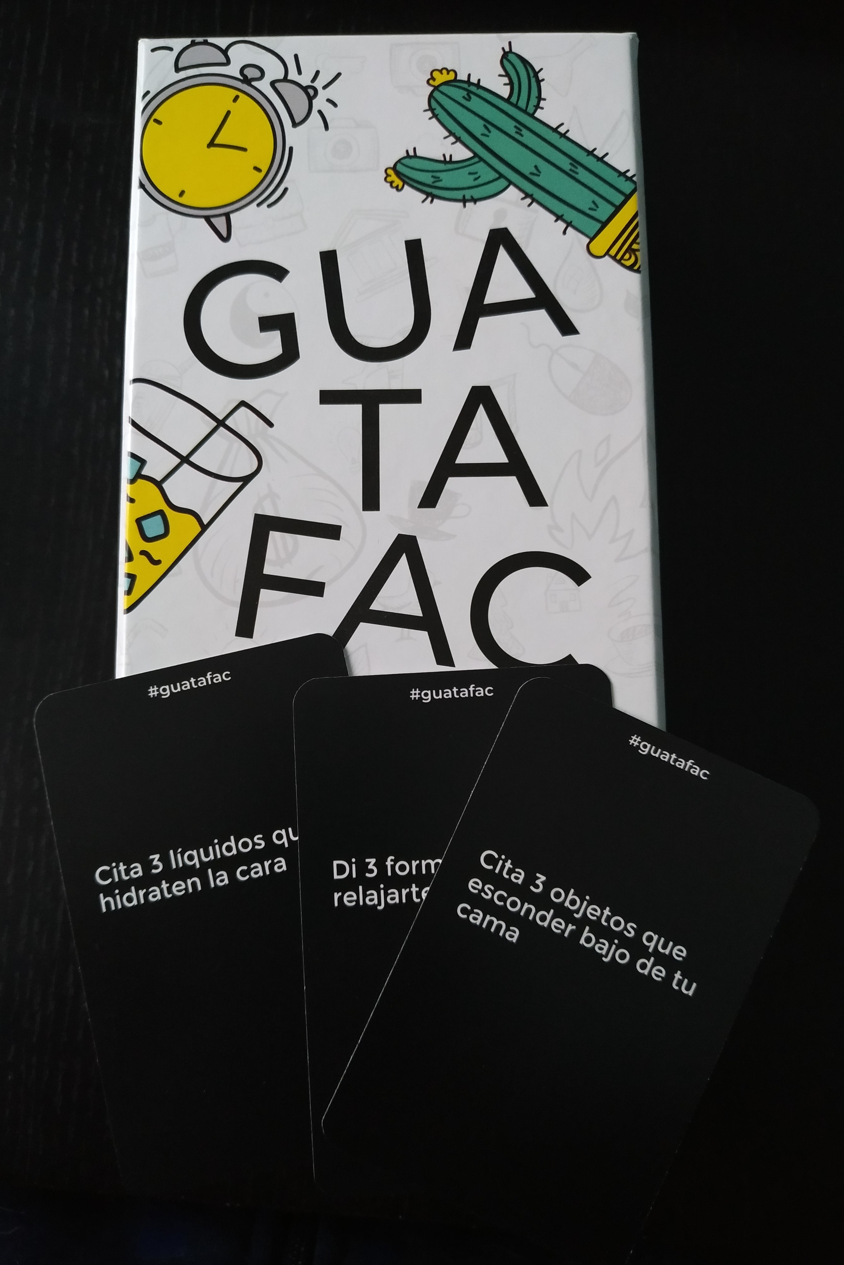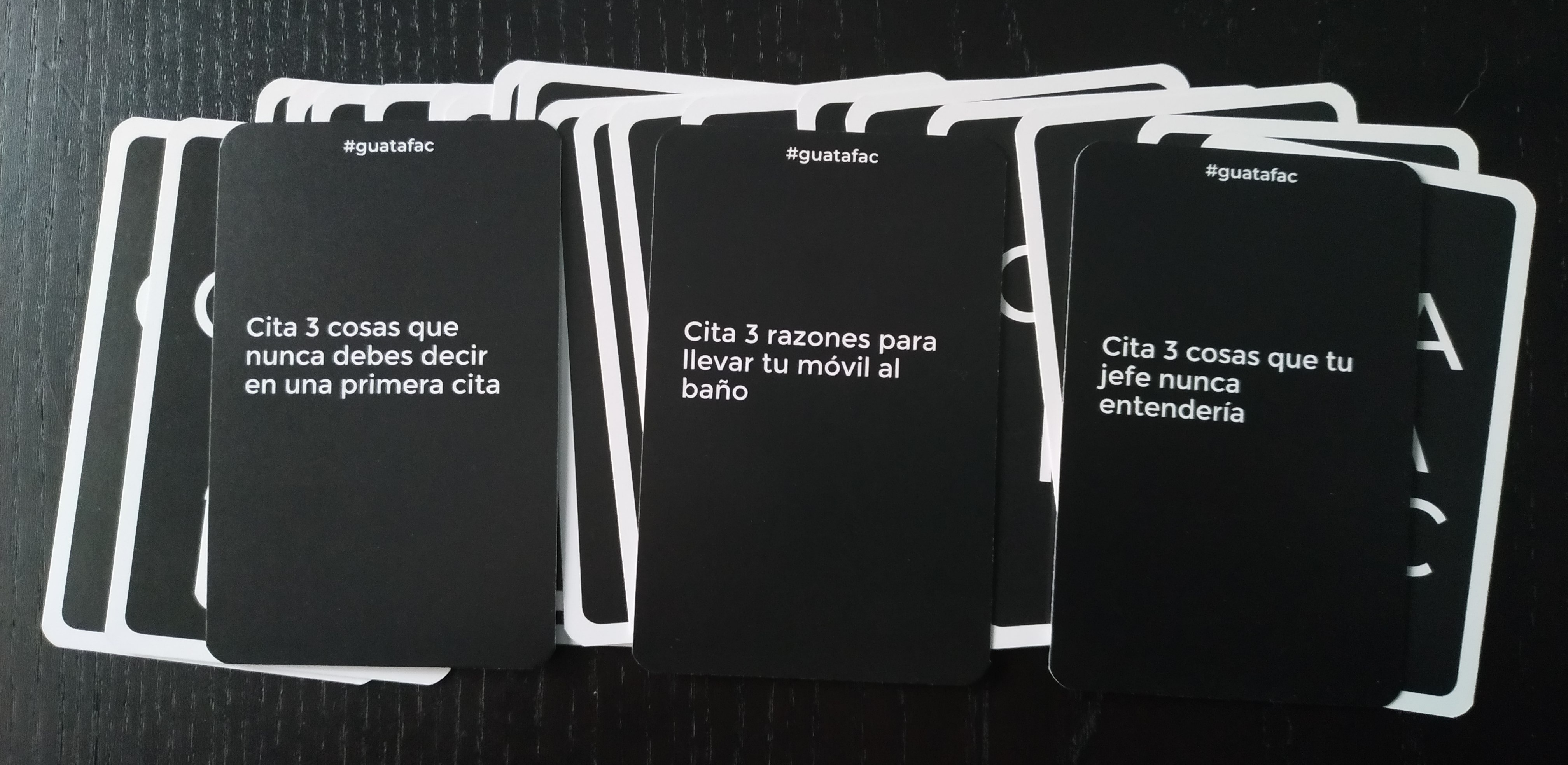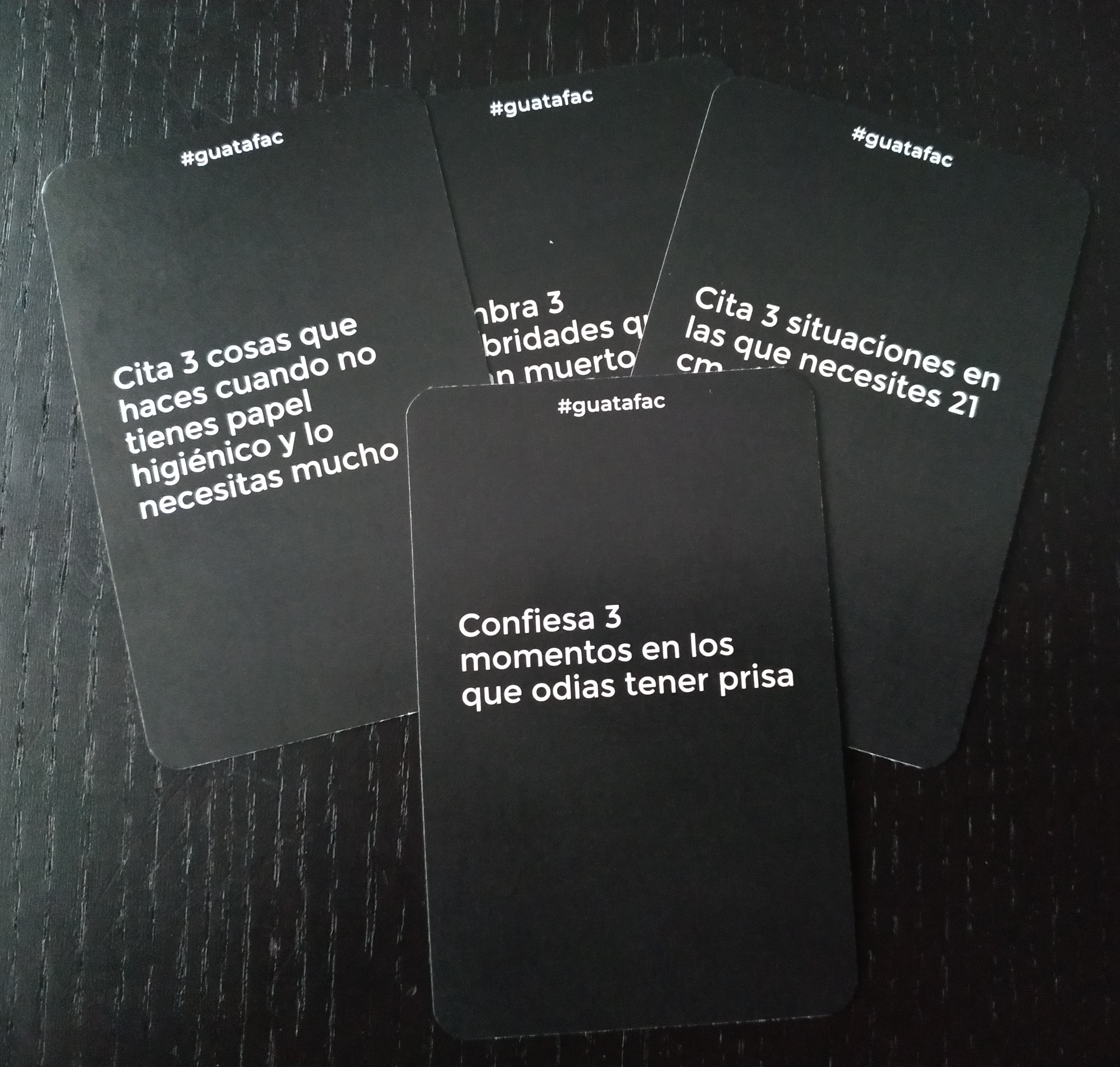En Guatafac, leeremos preguntas según cojamos cartas del mazo y tendremos 8 segundos para responder, dejando ver nuestros pensamientos más espontáneos, raros y enrevesados. Deberemos decir lo primero que se nos venga a la cabeza, sin censura.
