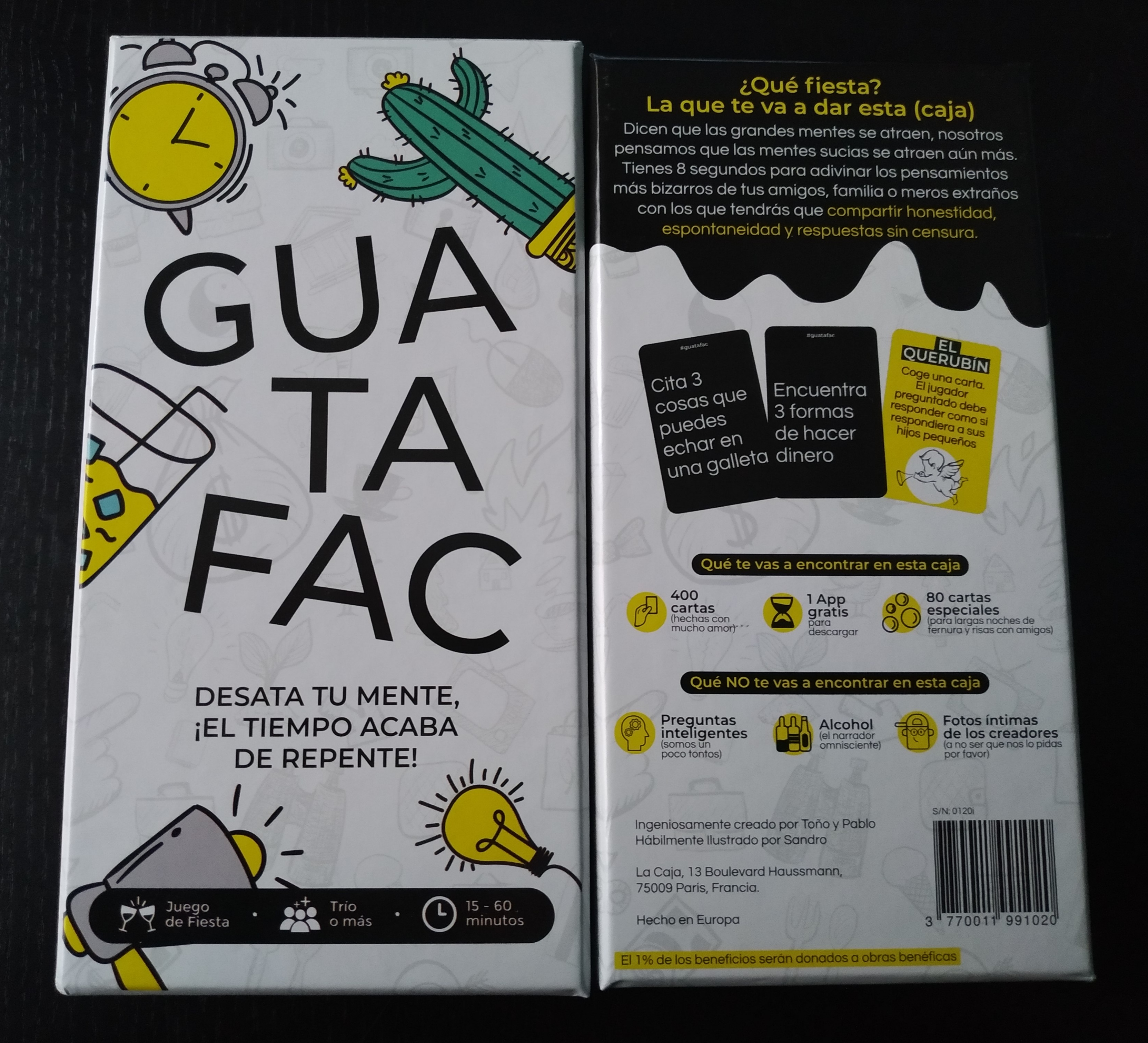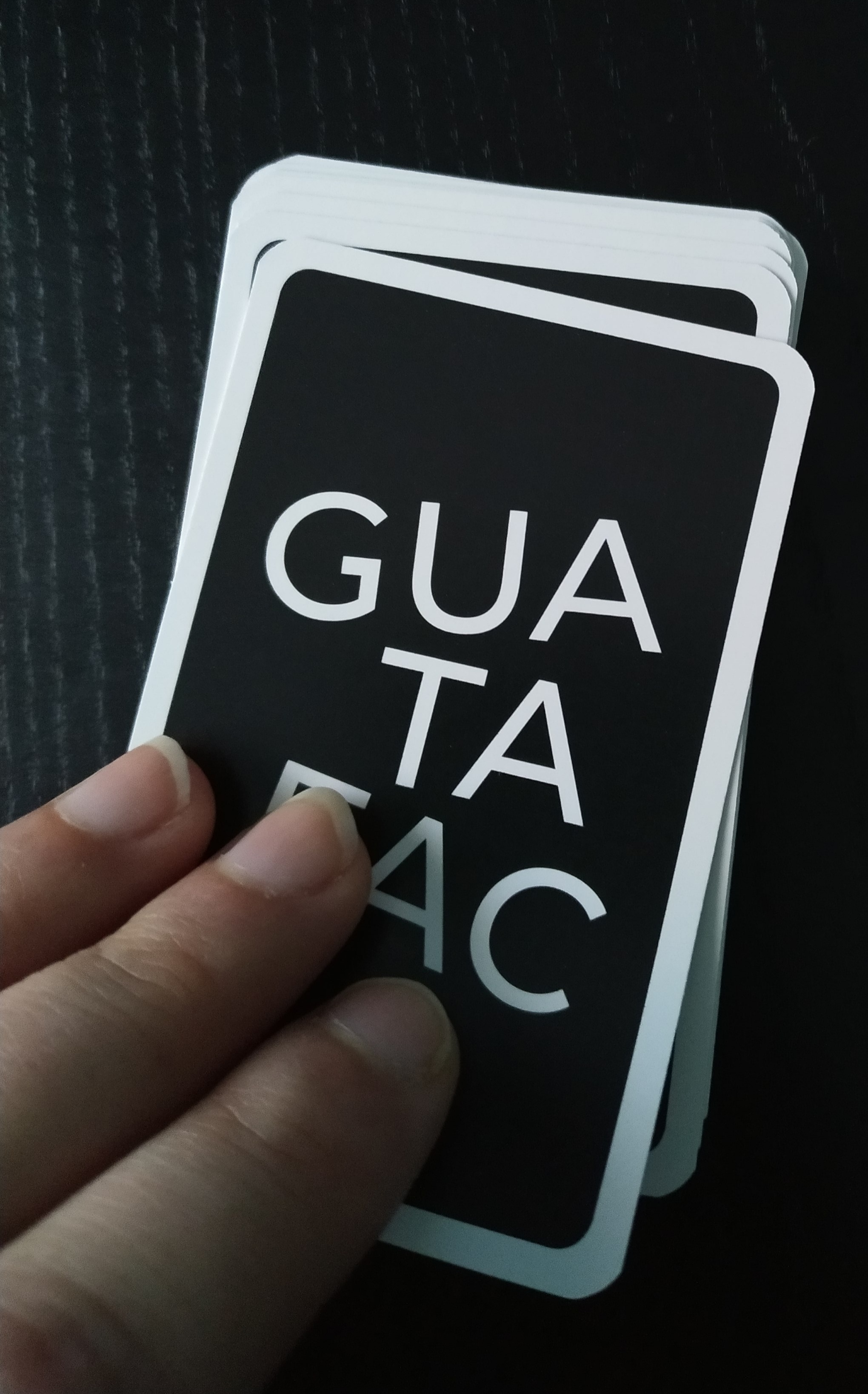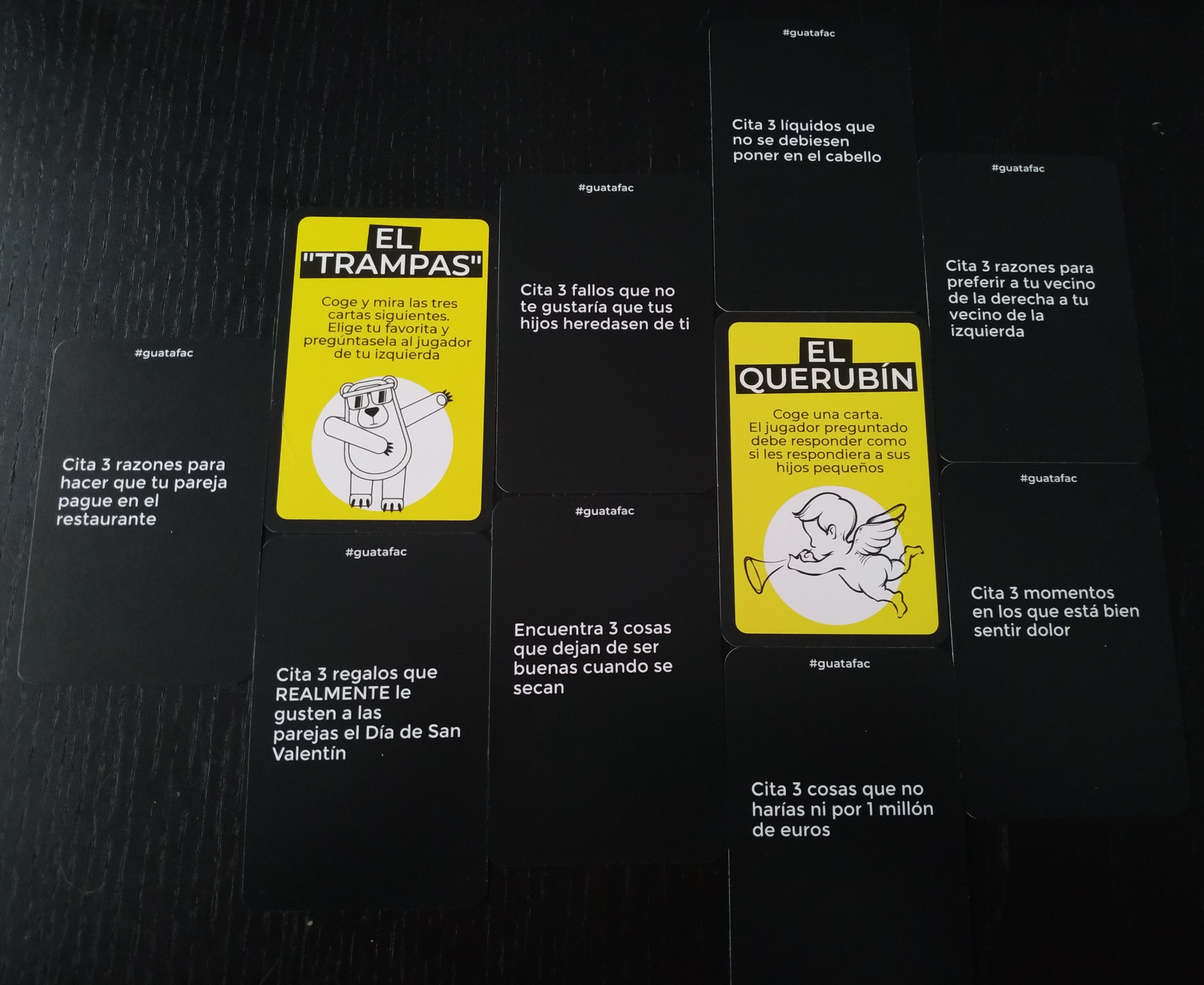 En Guatafac, leeremos preguntas según cojamos cartas del mazo y tendremos 8 segundos para responder, dejando ver nuestros pensamientos más espontáneos, raros y enrevesados. Deberemos decir lo primero que se nos venga a la cabeza, sin censura.