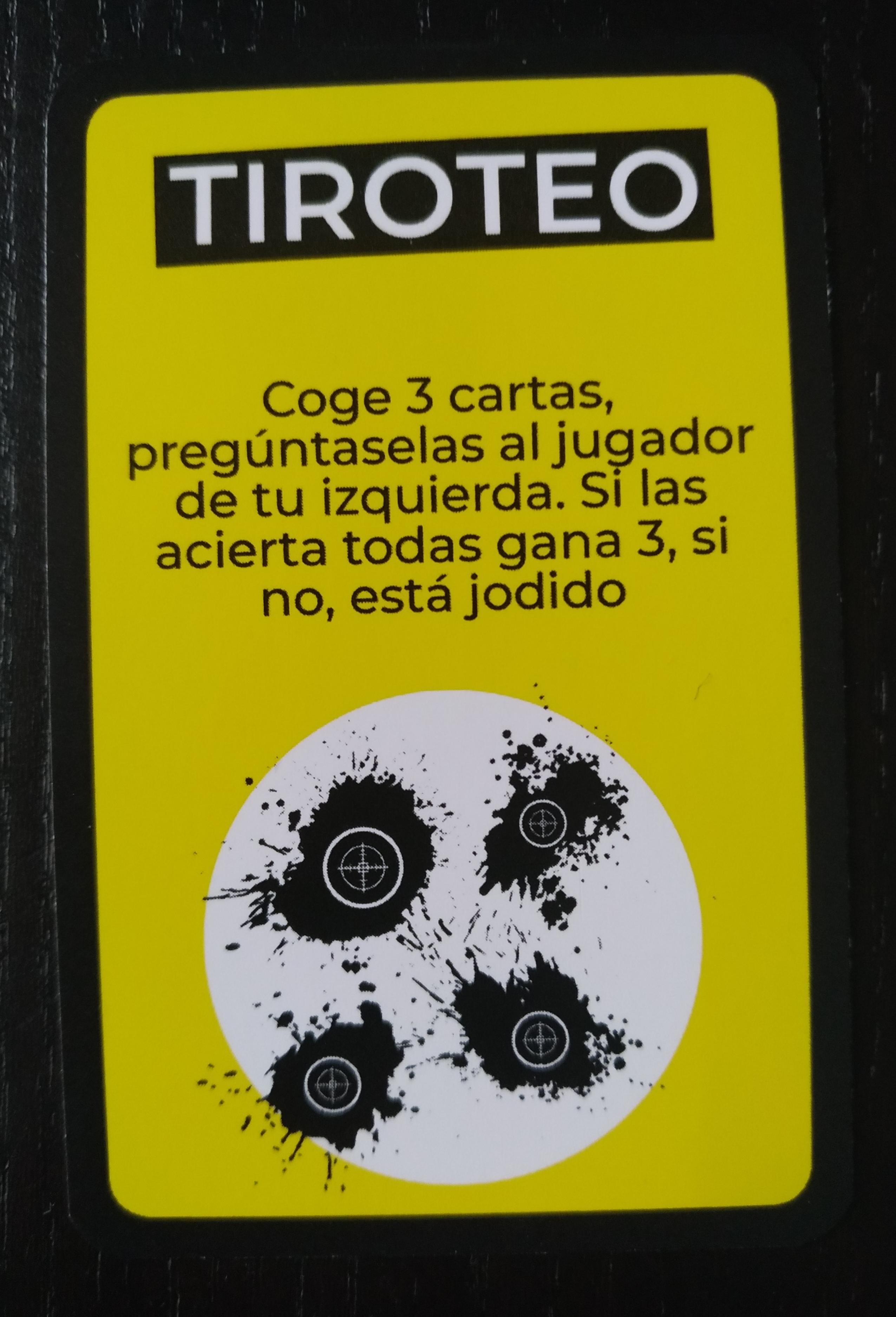 - Tiroteo: Cogemos 3 cartas y se las preguntamos a nuestro jugador de la izquierda. Si las acierta todas, gana 3 puntos, sino, ninguno.
