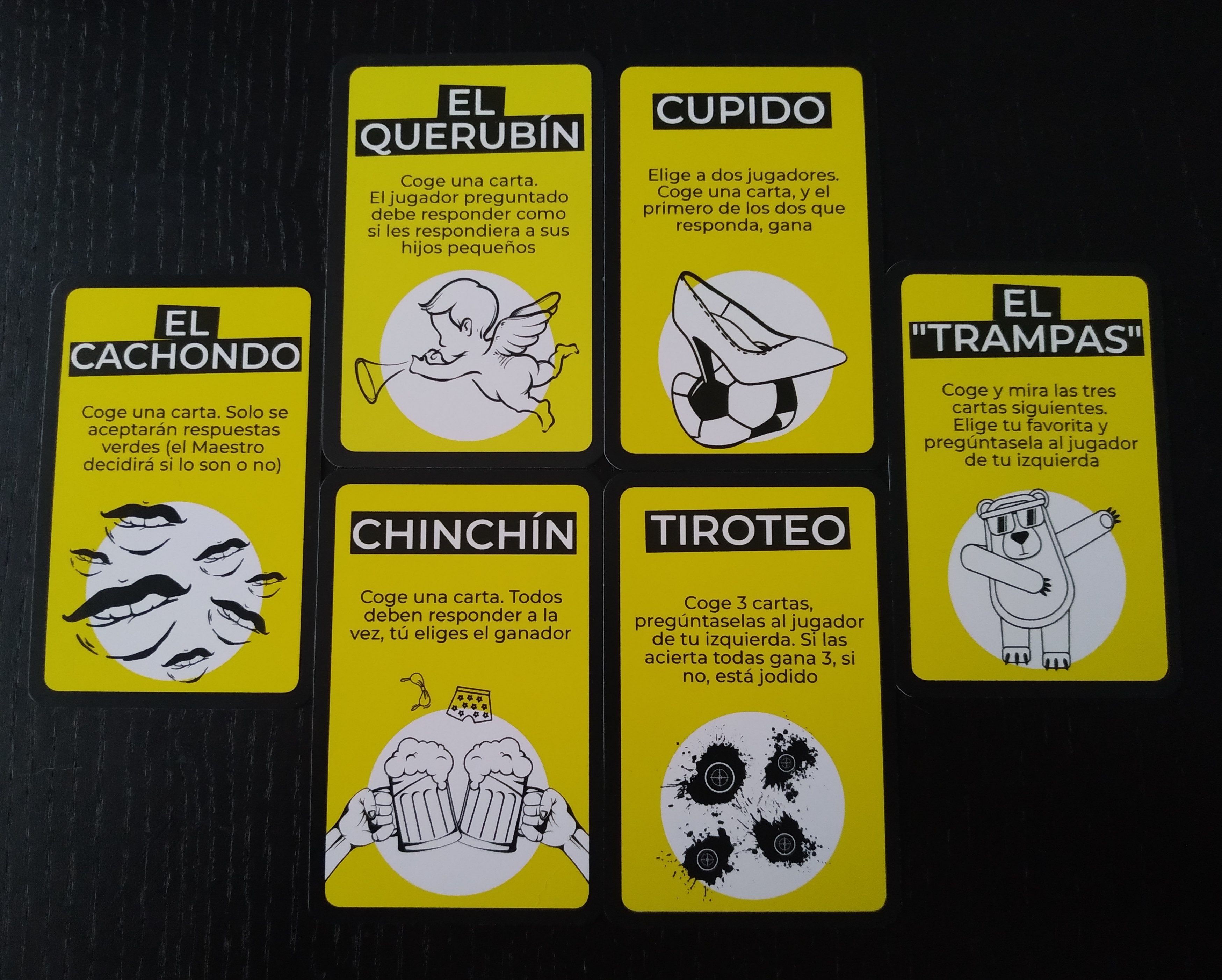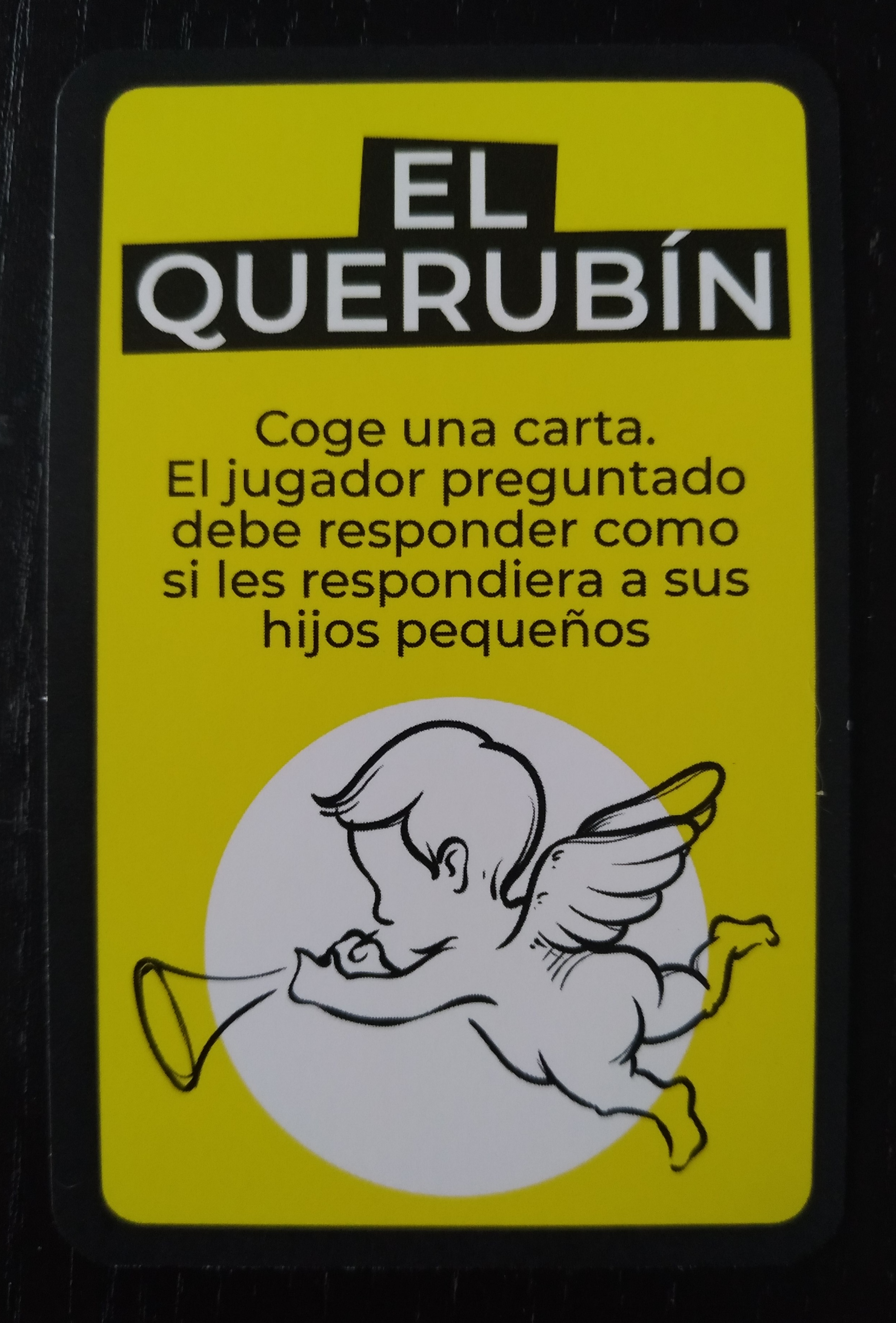 - El querubín: Cogemos una carta y el jugador que responde, debe hacerlo como si hablara a sus hijos pequeños.