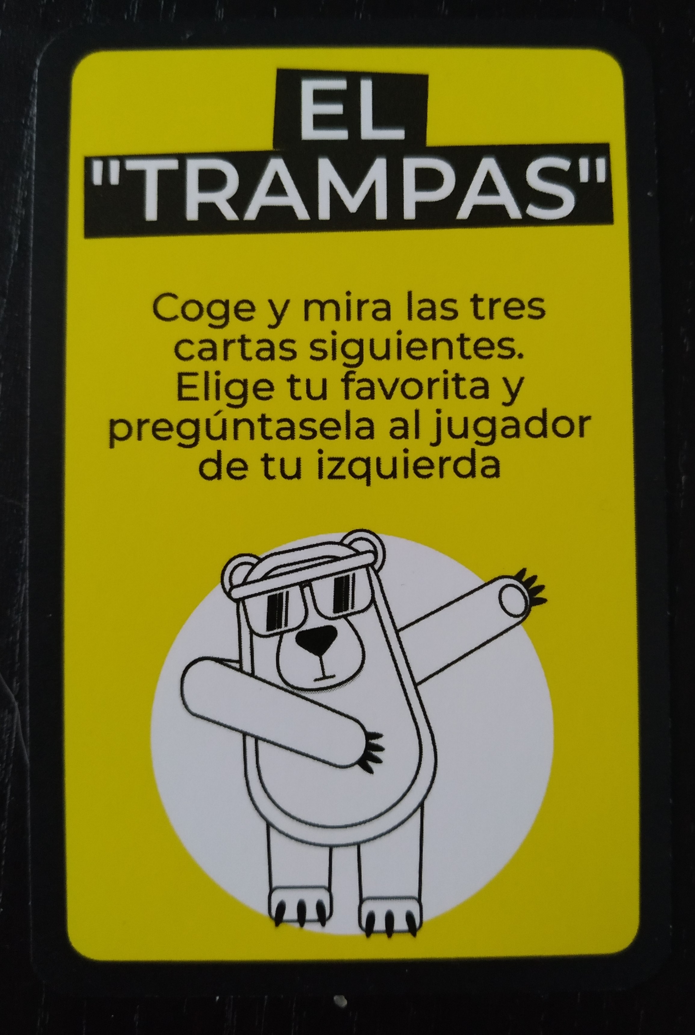 - El trampas: Cogemos las 3 cartas siguientes, elegimos nuestra favorita y se la preguntamos al jugador de la izquierda.