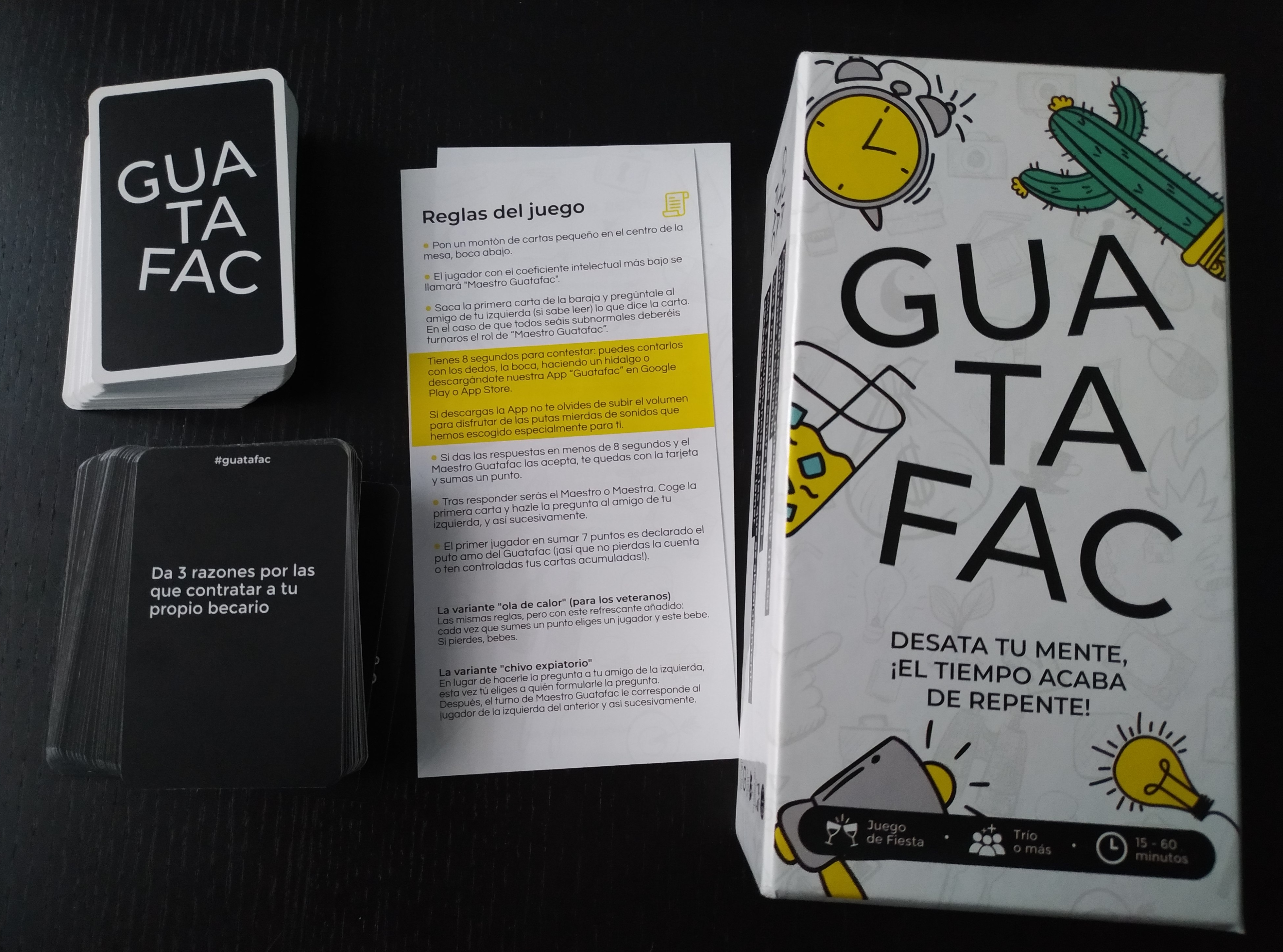 Otra cosa que suma diversión a las partidas de Guatafac es la app gratuita que podemos descargar aquí para Android o aquí para iOS y que nos ha parecido cuanto menos, curiosa. Además de que viene muy bien para que la cuenta atrás la veamos todos los jugadores y nadie se pase en su tiempo de juego, tiene sonidos y «chistes» que desconcentran y que te hacen sumar risas a las que ya solamente jugar te produce. Os recomendamos bajarla para vuestras partidas.