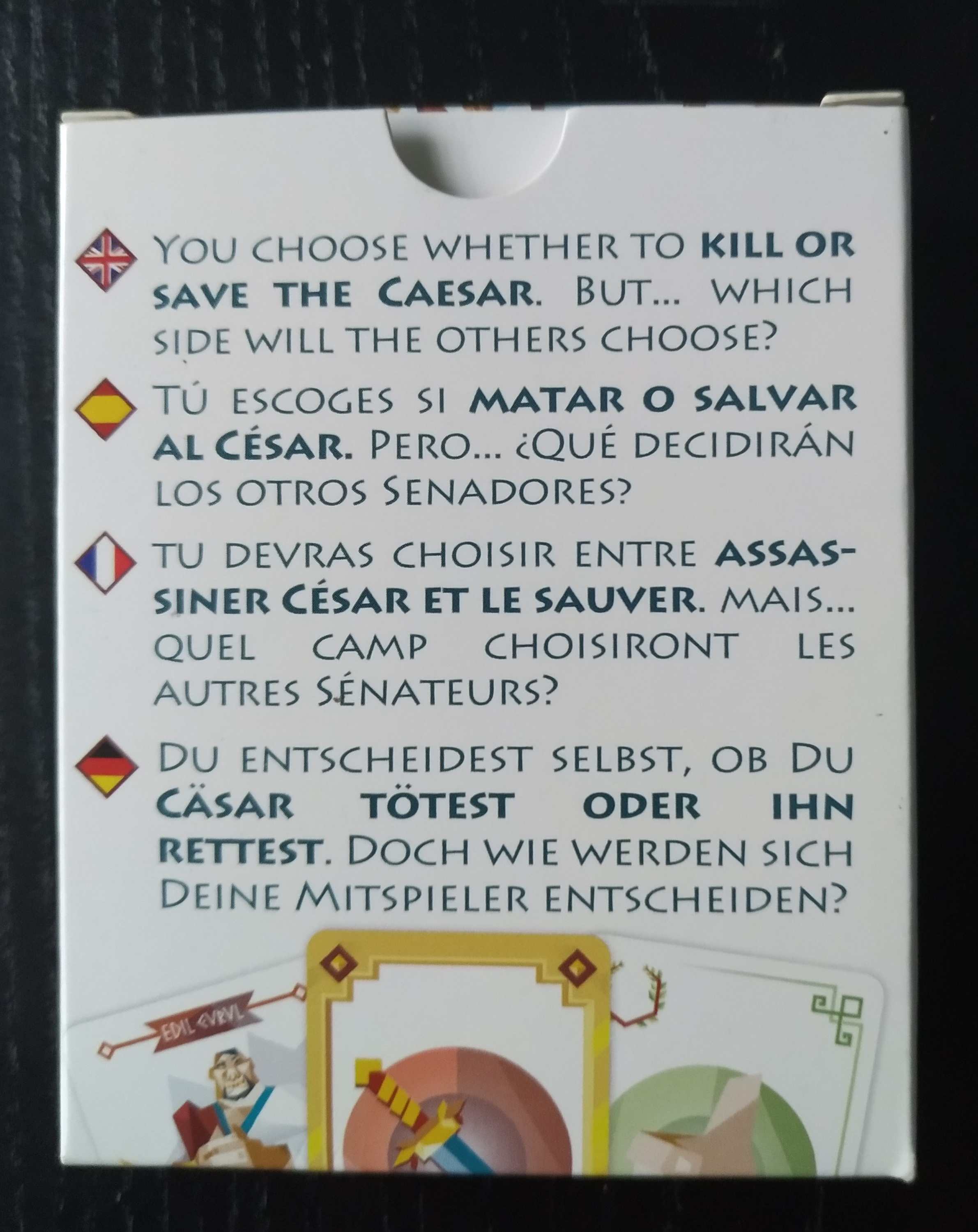 - Cuatro Roles Estratégicos: Los jugadores asumen uno de los cuatro roles cruciales en cada turno: el "Cónsul" que dirige las acciones, dos "Ediles" que votan por la vida o muerte de César en secreto, y el "Pretor" que tiene el poder de influir en uno de los votos. ¡Elige sabiamente para asegurar el éxito de tus intereses!