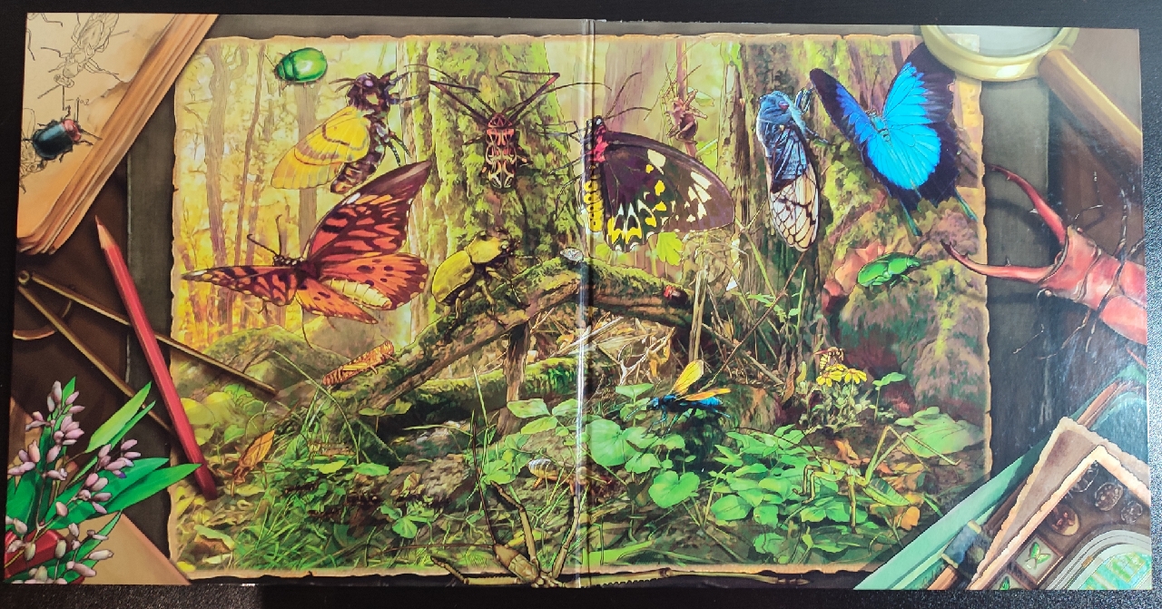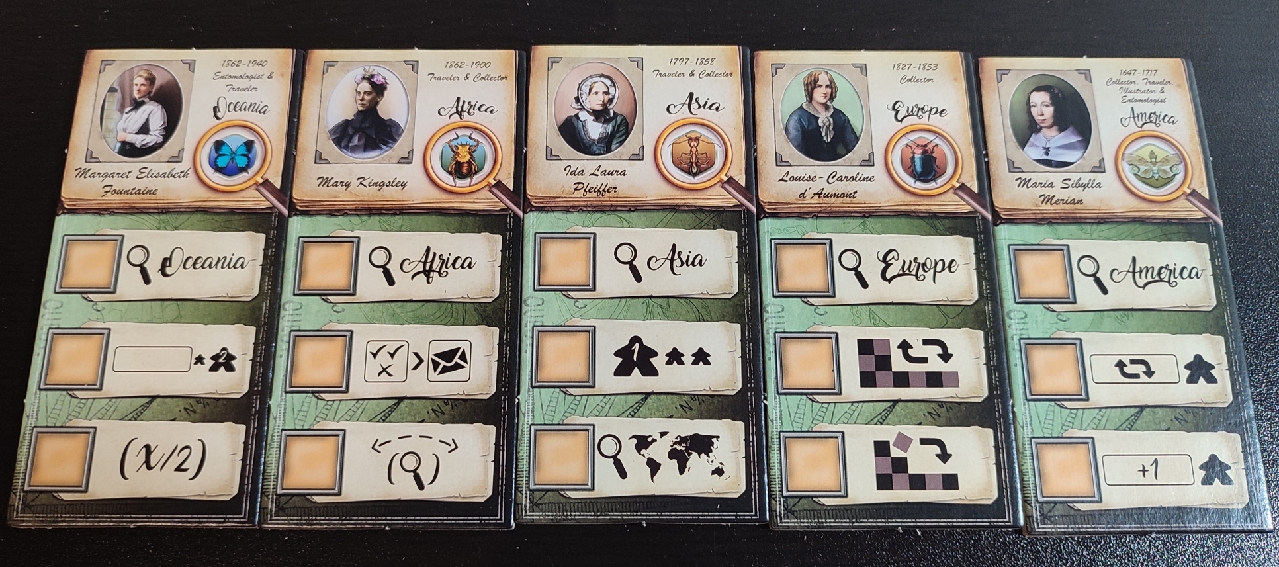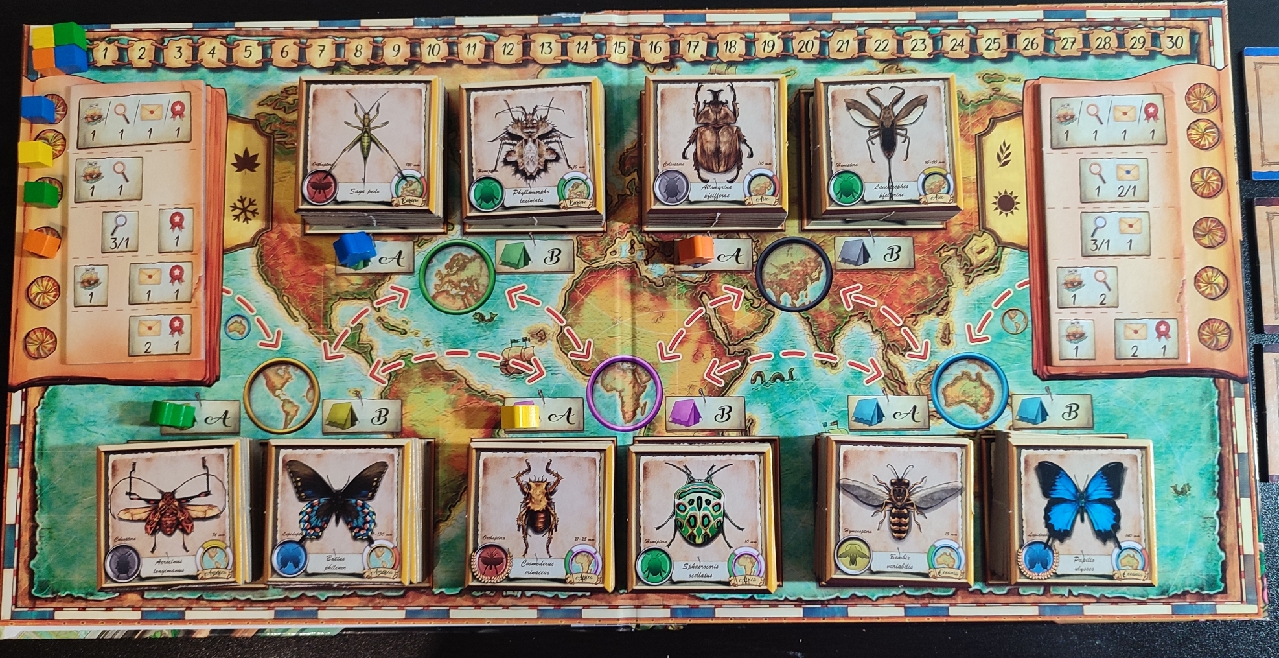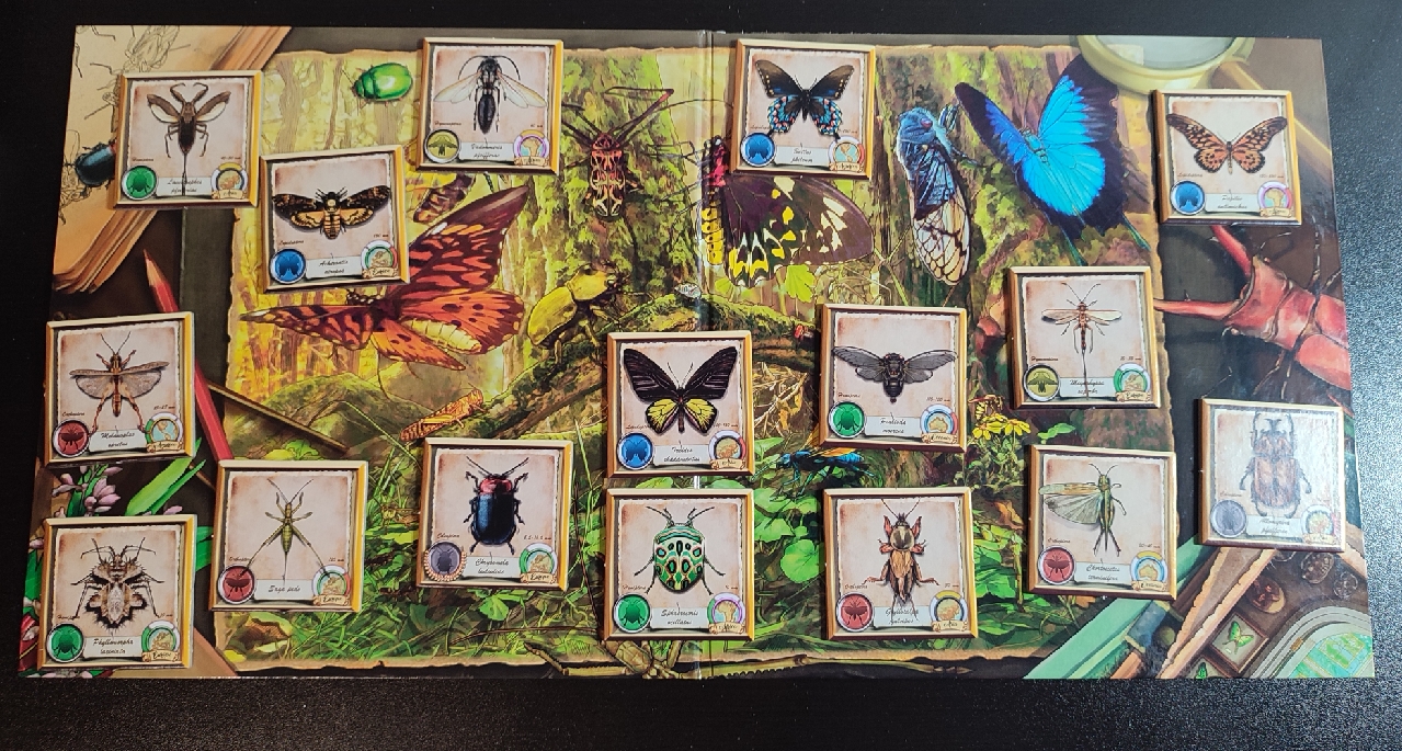 Además de la cantidad ingente de losetas, tanto de insectos, de correspondencia, de logros y de investigadoras, dentro de la caja nos encontramos con diferentes marcadores, el meeple de cada jugador, y el otro destacable elemento del juego: el tablero. Un tablero muy bien producido que representa el mapa del mundo por donde viajaran las investigadoras recolectando los insectos y que si miras su reverso te dejará boquiabierto ya que aparece una fantástica ilustración a todo color que bien podría poner cualquier entomólogo o aficionado a los insectos colgado en su pared.