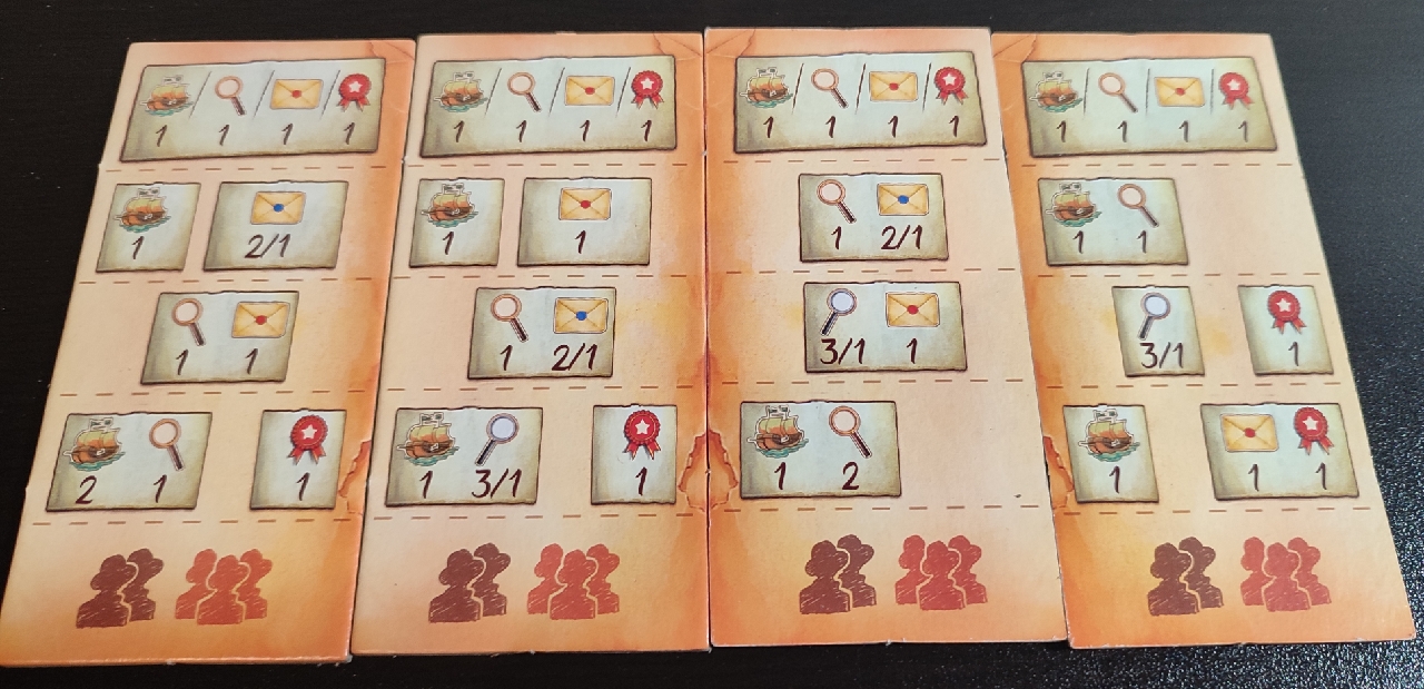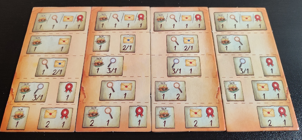 - Recogida de correspondencia: Permite al jugador coger una loseta de correspondencia de las visibles o una directamente de la pila y colocarla en su zona de juego. También hay acciones que permiten coger más de una loseta y elegir una de ellas y mandar el resto al fondo de la pila.