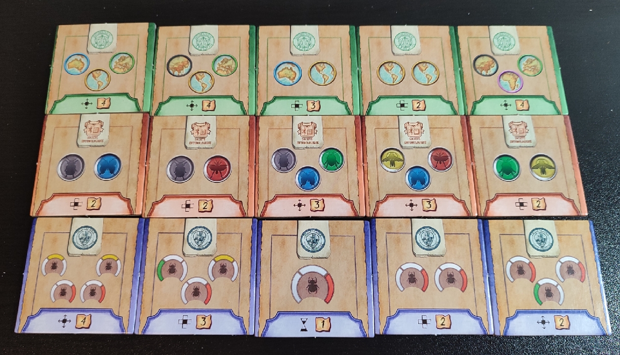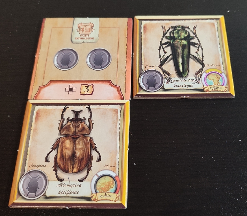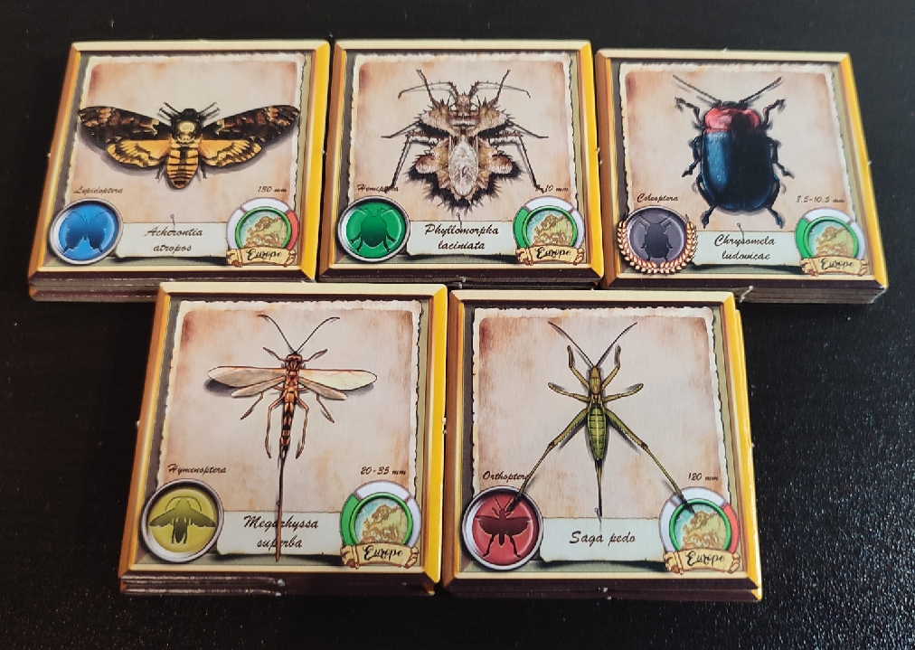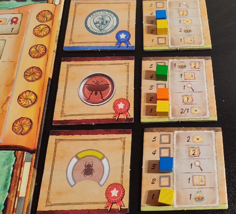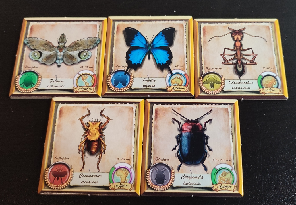 Esta ultima acción es bastante más importante de lo que parece y es que, al principio de la partida, se revelarán tres losetas de medalla. Estas medallas podrán ir siendo reclamadas por los jugadores cuando quieran siempre y cuando cumpla con los criterios que en ella se establece. Por ejemplo, una de las medallas puede indicar tener en la colección insectos de tamaño mediano. En el momento que un jugador tenga al menos uno de estos insectos en su cuadrícula podrá reclamar la medalla.