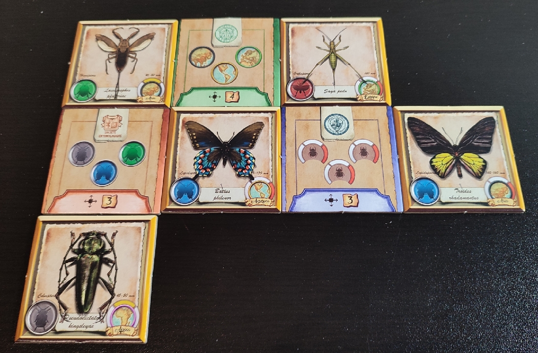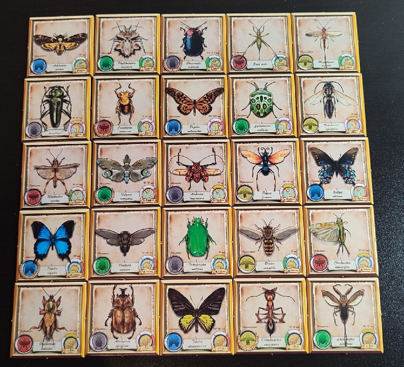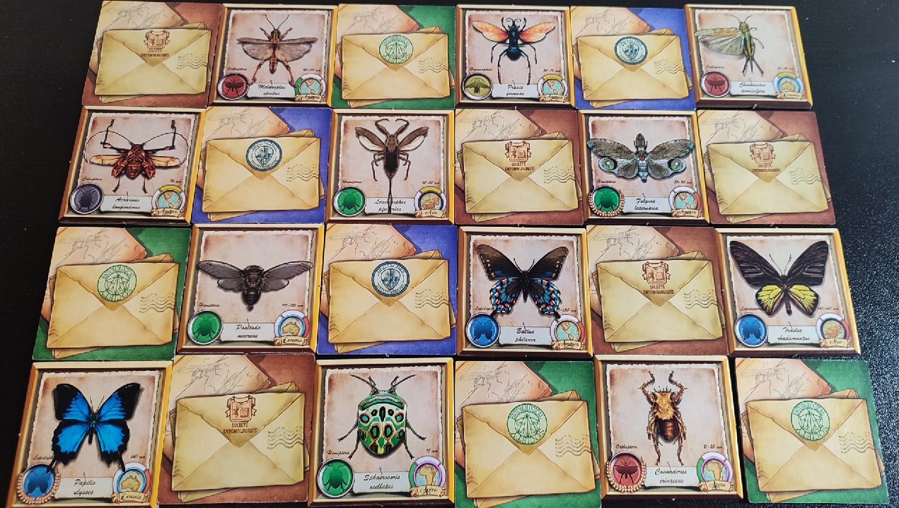 Durante la partida, cada jugador irá cogiendo diferentes losetas, tanto de insecto como de correspondencia. Estas losetas las deberá ir colocando en su zona de juego formando una cuadrícula de 6×4.