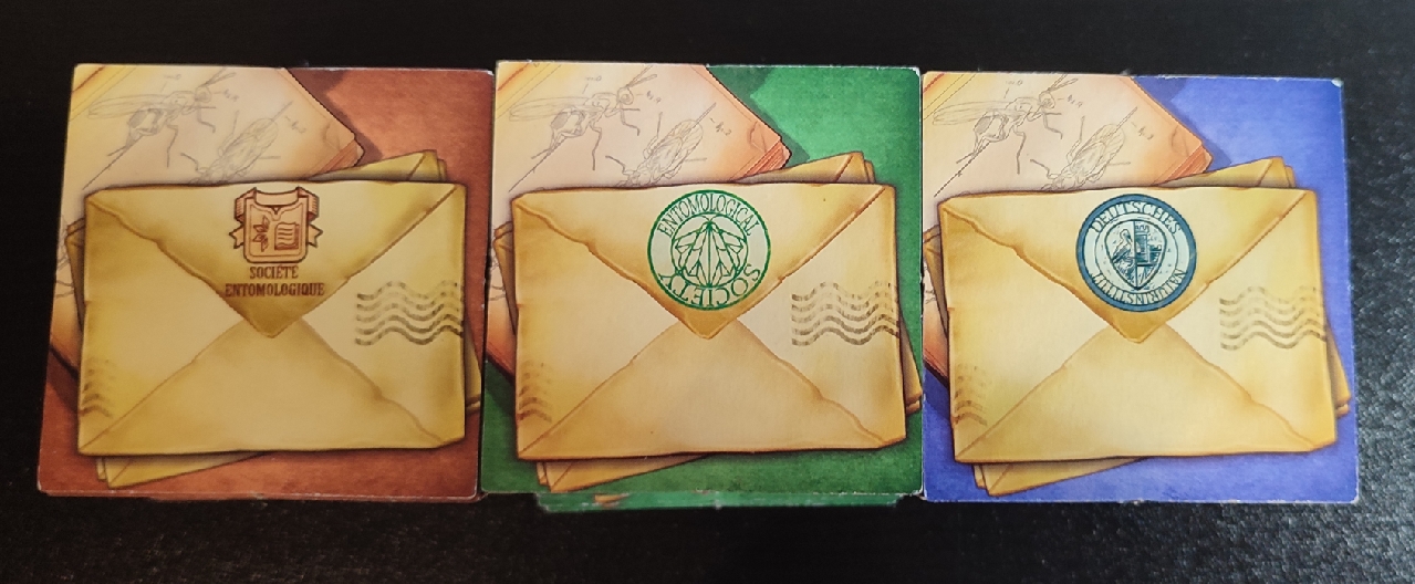 Estas losetas las iremos consiguiendo con las acciones disponibles de las estaciones y las iremos colocando en nuestra cuadrícula de forma que estén intercaladas las losetas de insecto y las losetas de correspondencia. Si, en nuestra cuadrícula, a medida que vamos consiguiendo losetas de insecto, vamos cumpliendo lo que nos va pidiendo cada una de las losetas de correspondencia que hemos colocado, podremos dar la vuelta a la loseta del sobre y obtener los puntos que se indican.