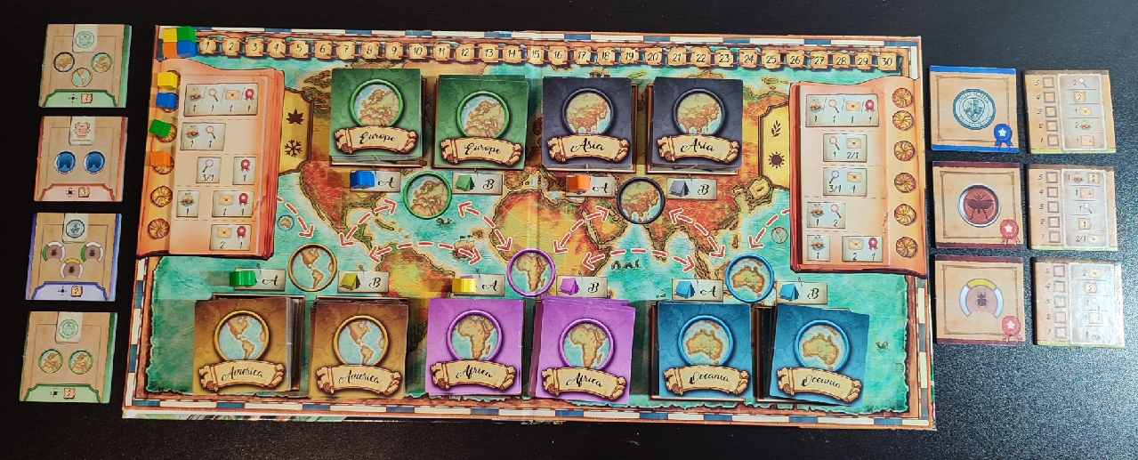 En el tablero podemos ver tres secciones bien diferenciadas. Por un lado, tenemos a los 5 continentes, divididos cada uno de ellos en dos campamentos, A y B. En estos campamentos es donde colocáramos a los distintos insectos que se ubican en dicho continente. Como hay 15 insectos por continente, una vez que mezclamos las losetas de insecto de cada uno por separado, pondremos ocho losetas en el campamento A y siete en el campamento B de cada continente.