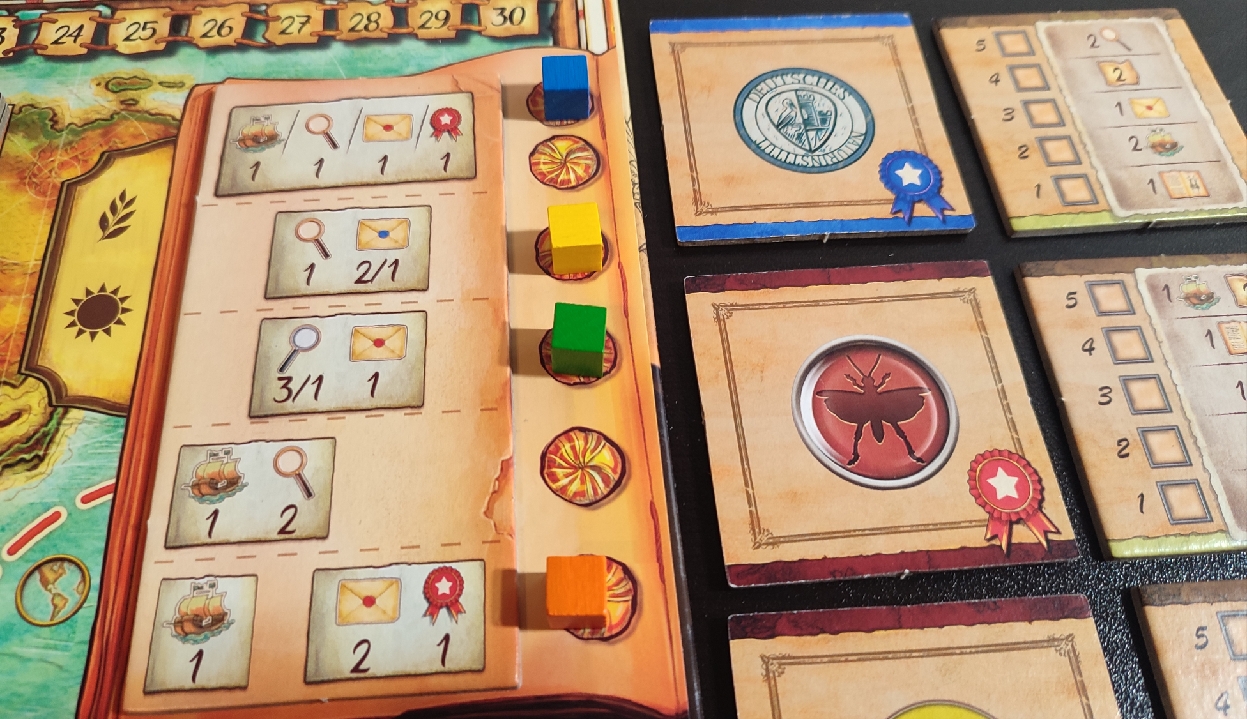 En si, el turno del jugador es bastante sencillo y consiste simplemente en coger tu marcador de la estación anterior y colocarlo en uno de los huecos libres de la estación actual y ejecutar las acciones que tenga asociada. Son cuatro posibles acciones y son muy directas: Una de ellas permite mover a tu meeple, otra permite coger una loseta de correspondencia, una tercera coger un insecto del lugar en el que te encuentras y la última opción es la que te permite reclamar una medalla.