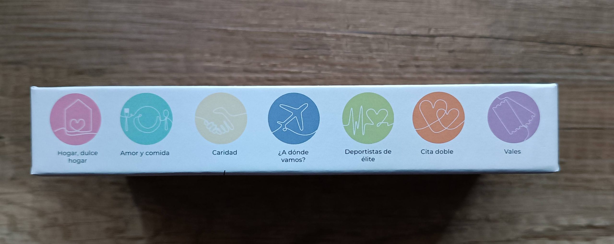 En una caja del mismo tamaño que sus versiones anteriores, Intimoos: Retos en pareja se presenta en una caja de fondo blanco con unos iconos de líneas finas que nos muestran algunas de las categorías que iremos encontrando en las cartas interiores.