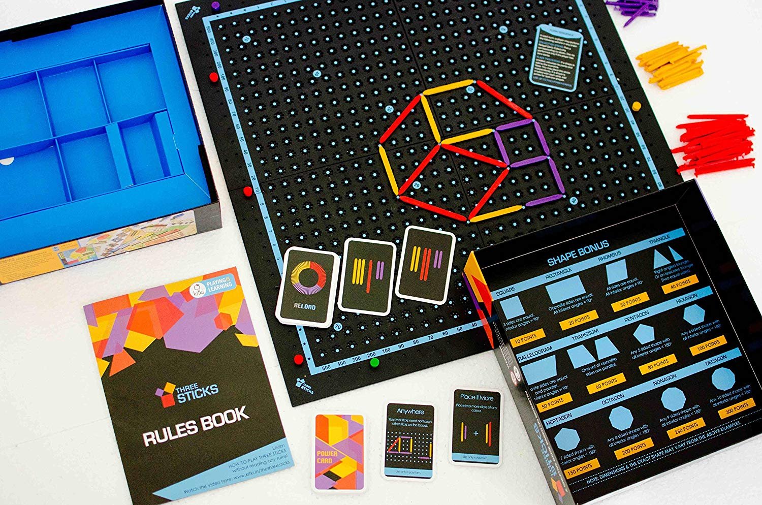Un creativo juego de mesa familiar centrado en la geometría. Hará a los niños aprender más sobre las formas y sus propiedades gracias a los tres palos con distintas longitudes que contiene. Por cada figura que creen ganarán puntos y avanzarán en el tablero. Presenta nuevos desafíos en cada partida y es para chavales a partir de 8 años.