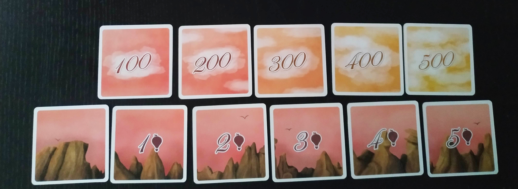 - Cartas de posición: Son las que utilizaremos para crear el espacio aéreo donde se colocarán y moverán los globos. Tenemos las cartas de suelo que colocaremos en fila y muestran un número que nos marca los globos necesarios para poder aterrizar y las cartas de altitud que colocaremos en columna y nos indican la altitud que hay desde esa posición hasta el suelo.