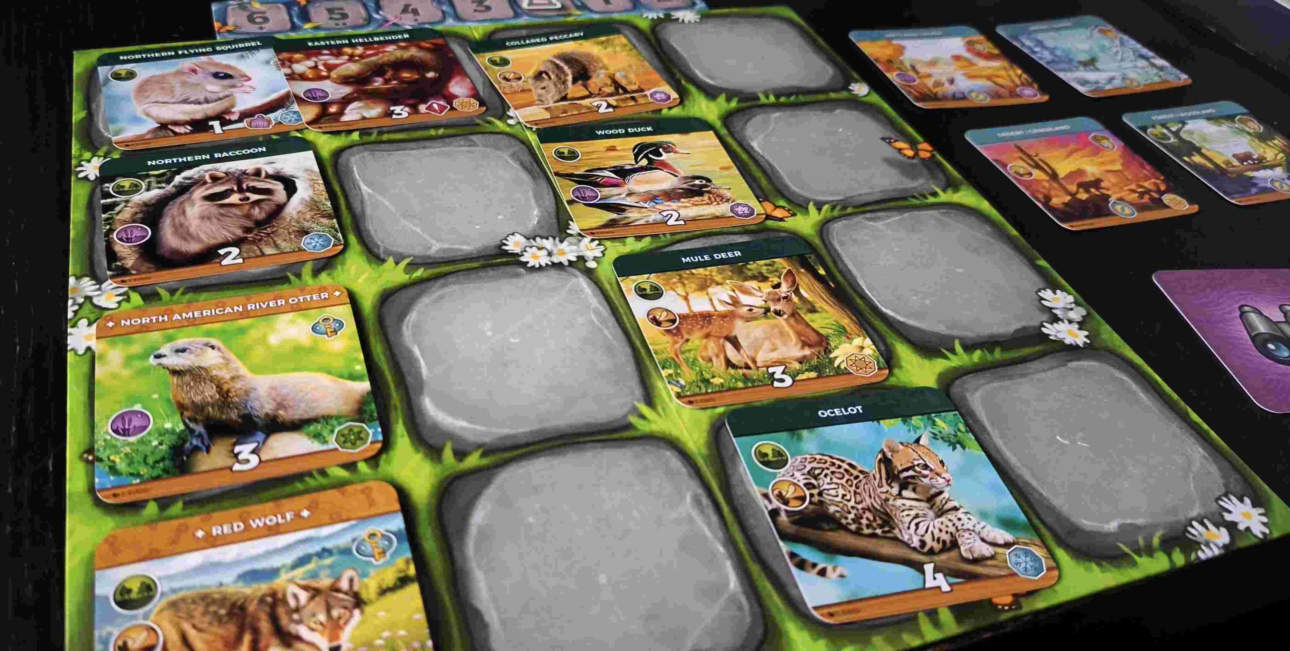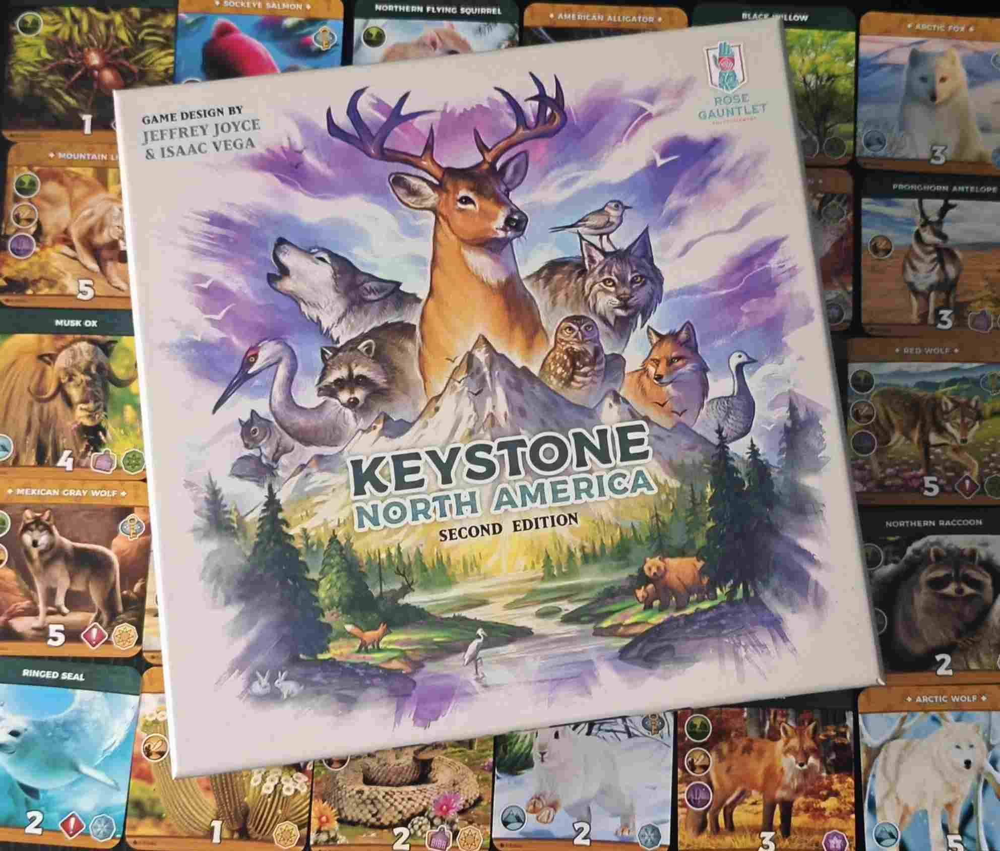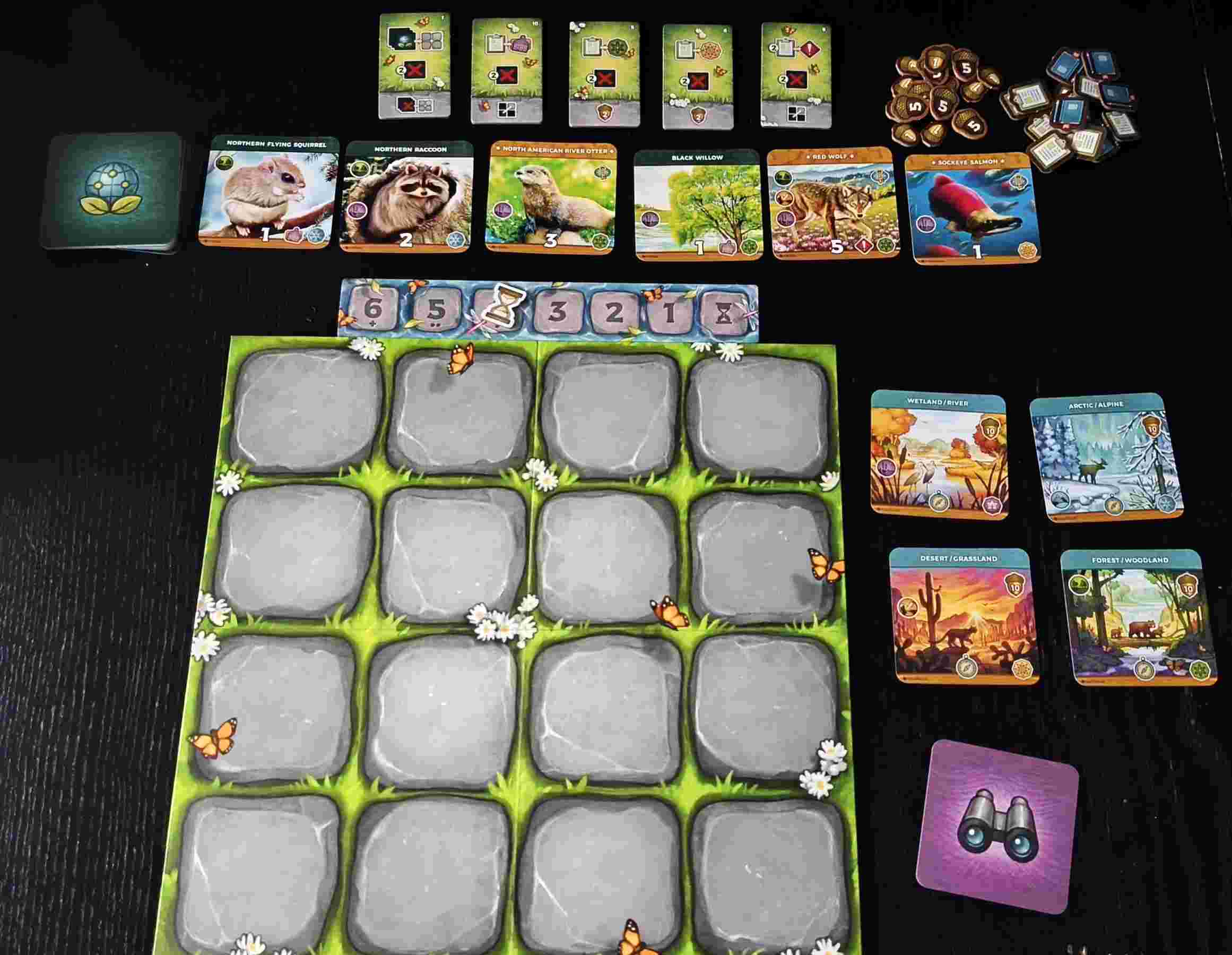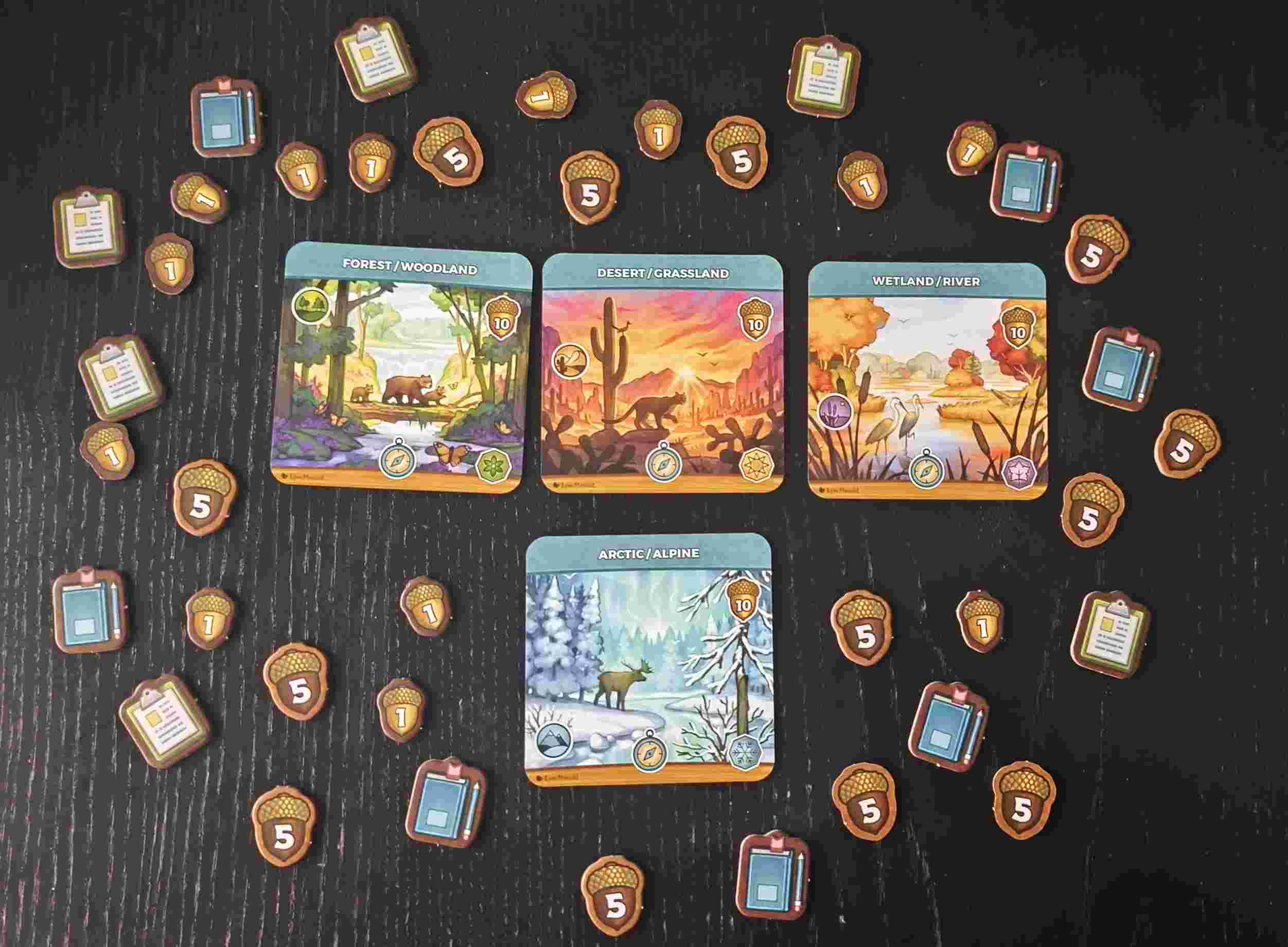 Keystone destaca por una producción muy cuidada, con ilustraciones realistas y respetuosas con la fauna norteamericana. Los tableros personales, las cartas y los tokens transmiten una sensación de calidad y coherencia temática.